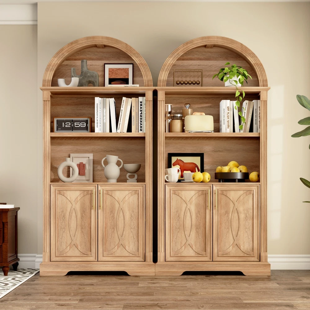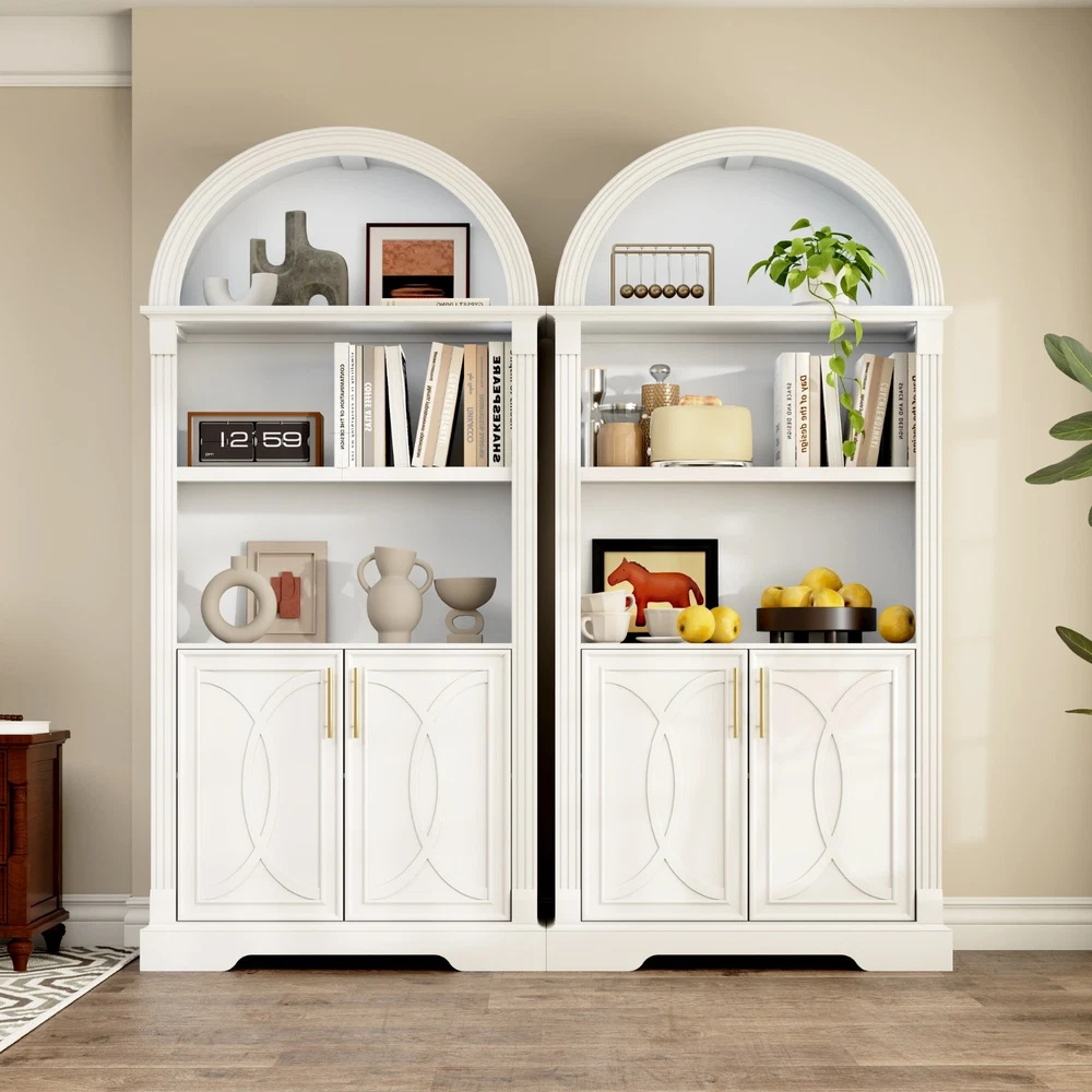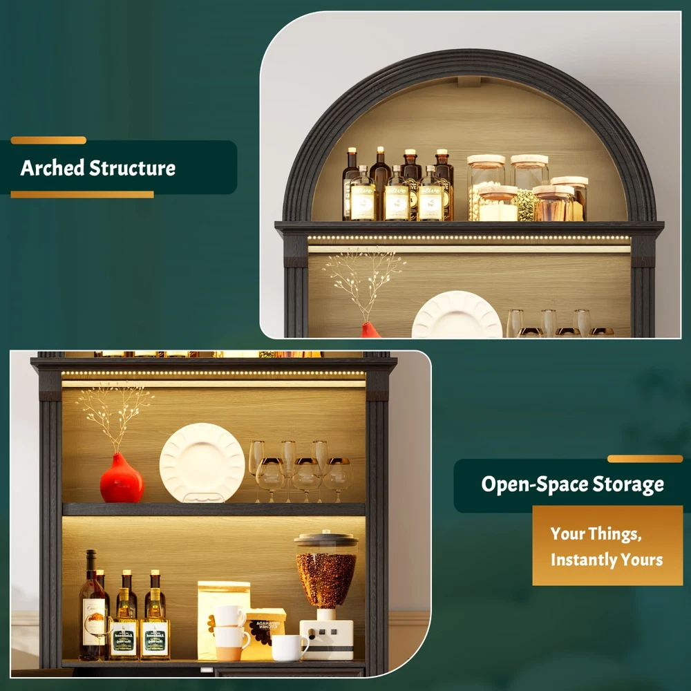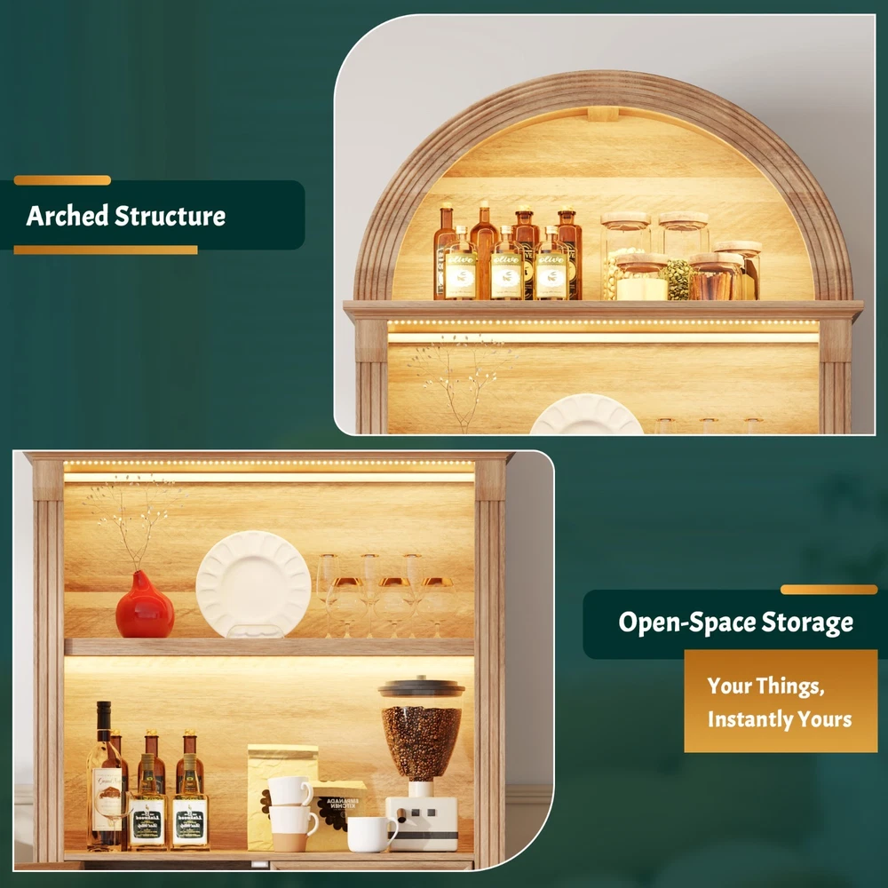 【Body Sensor Switch】Our arched cabinet includes a human body sensor light that automatically turns on when somebody is nearby, ensuring safety in the dark by preventing falls or collisions, automatically turns off after a set time when no one is around, making it energy-efficient and convenient 【Human Sensor LED Light with 3 Color Modes】Our arch cabinet equipped with a human sensor LED strip, this arched cabinet lights up automatically when you approach it. , you can also adjust the light's brightness by pressing and holding the control button, fix for different atmospheres 【Overall Dimensions】 70.8" H x 31.5" L x 15.7" W,This arched cabinet includes 3 extra-wide shelves and roomy interior,providing ample space for display or storage, suitable for use as arched bookcase,kitchen pantry cabinet, arched bookshelf, arched storage cabinet, arched china cabinet,living room display 【Arched Design】Arched cabinet is a stunning blend of design and practicality.The open arched shelves complement the design, offering both visual appeal and easy access to essentials.This arch cabinet a perfect fit for modern and luxury home styles, adding a touch of refined beauty 【Easy To Assemle】The packaging contains detailed installation instructions, making the assembly process simple and easy. It is recommended that 2 people install, usually within 1 hour to complete the installation.If you encounter any problems during the assembly, the seller will provide you with a satisfactory solution within 24 hours! 3 COLORS LIGHTING AND HUMAN SENSOR Double the Value, Double the Fun! PROTUCT DIMENSIONS 3 Colors to Choose From – There's Always One That's Perfect for You!