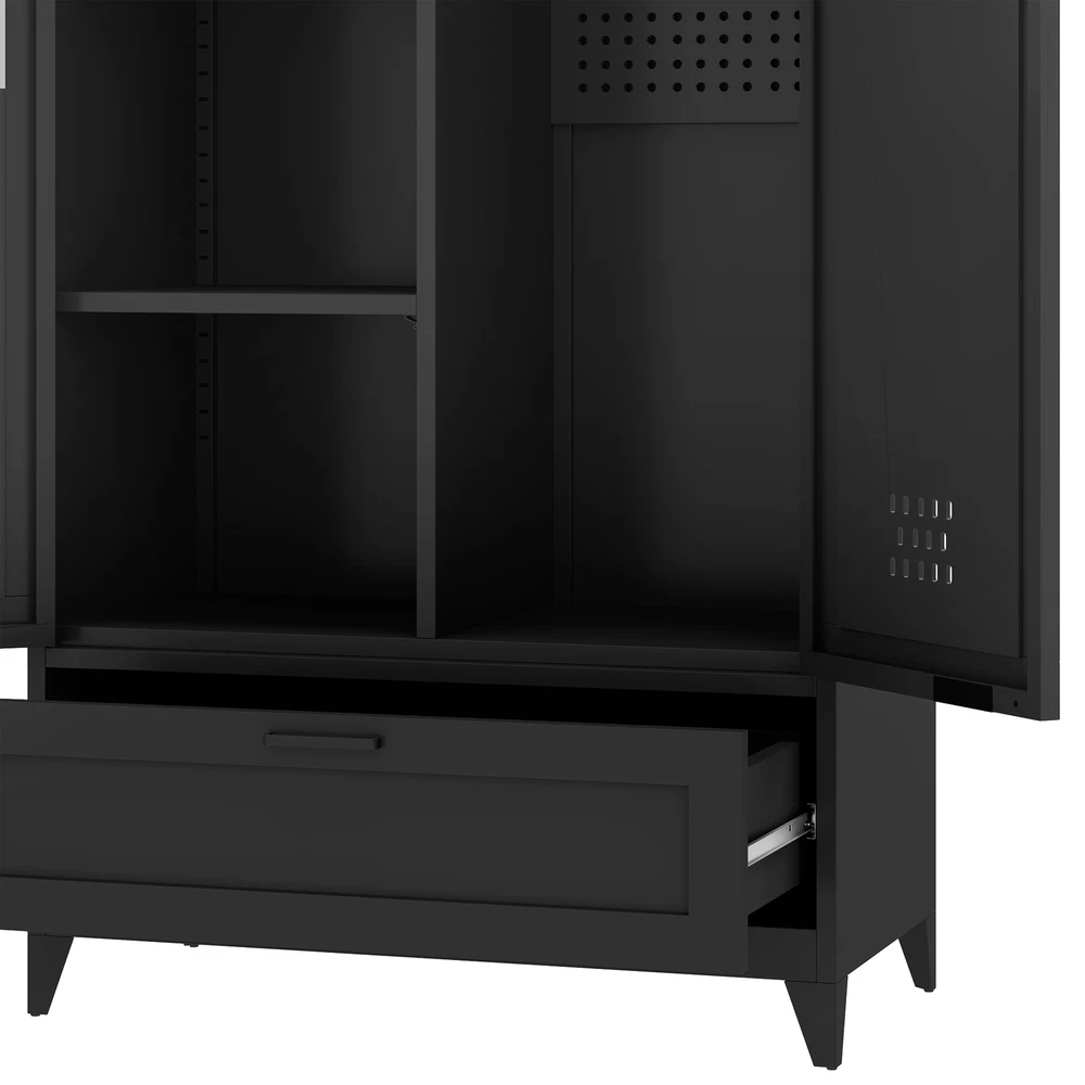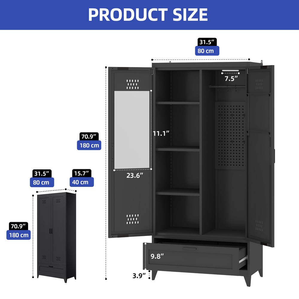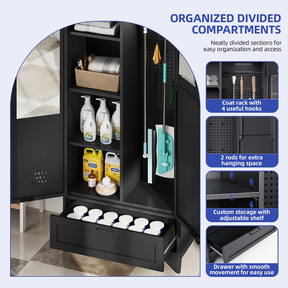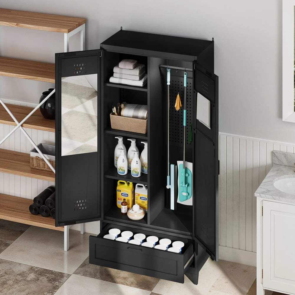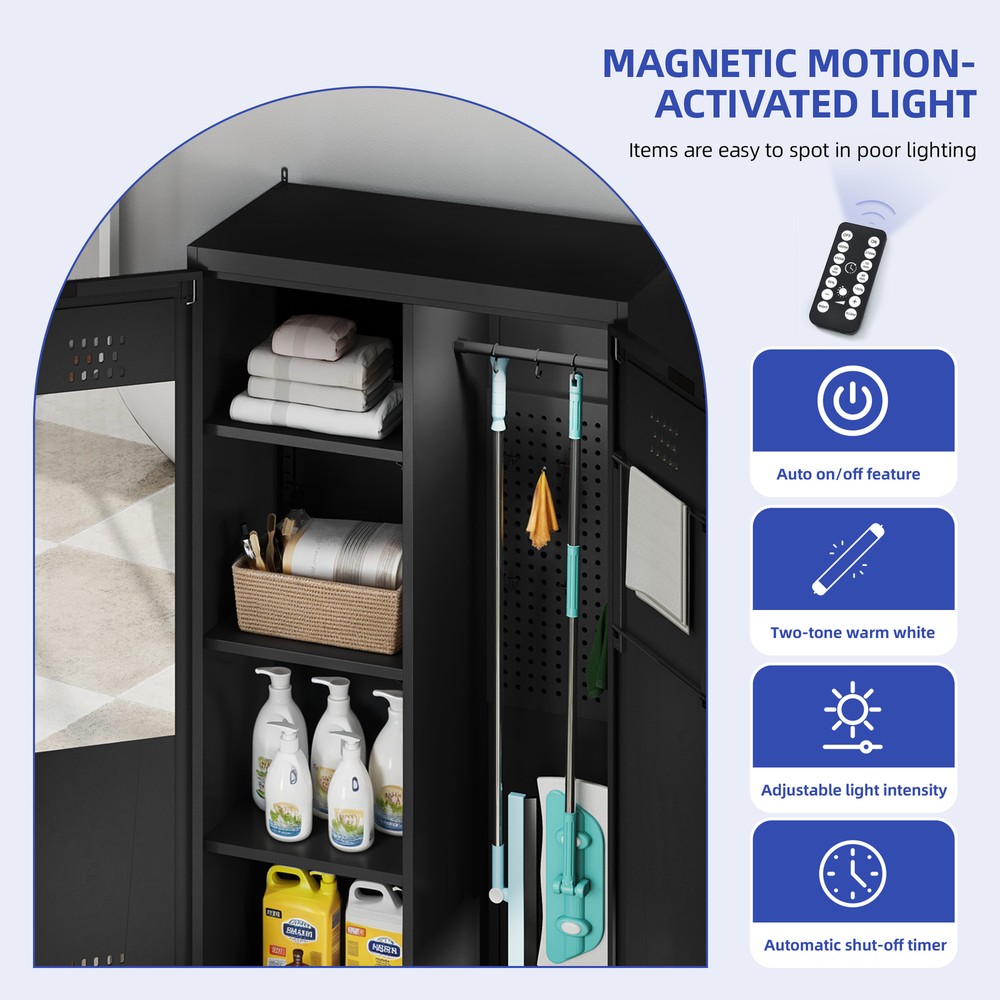 71" Tall Metal Broom Home Cleaning Tools Cabinet Vacuum Cleaner Storage Black Product Description NOTE: Professional Installation would be Highly Recommended. Description: 1. Color: Black 2. Material: Metal 3. Room Type: Basement, Garage, Bathroom, Warehouse 4. Special Features: With Adjustable Light, Adjustable Shelf, With Drawer, With Coat Rack, With Air Vents Features: 1. All-in-One Metal Storage Cabinet – Keep everything neatly organized with adjustable shelves for various-sized items and a pegboard with hooks for hats, belts, and more. A spacious drawer stores smaller essentials, while two towel rods on the right door keep linens tidy. 2. Customizable Sensor Lighting – Easily find what you need with smart sensor lighting! Adjust brightness and switch between warm, white, or dual-color light using the remote. Plus, the timer-off function helps save energy when not in use. 3. Mirror-Integrated Storage – Get ready with ease using the built-in mirror—no need to move back and forth! This storage cabinet offers convenience, while the magnetic door closure ensures smooth, quiet operation and reduces wear over time. 4. Robust Steel Construction – Crafted from durable steel, this storage cabinet is stronger than wood or plastic alternatives. For added safety, it includes a tip-resistant kit, while adjustable feet provide extra stability—perfect for busy households with pets. Dimensions: 1. Product Dimensions: 15.7"D x 31.5"W x 70.9"H 2. Weight: 73 lbs Package Included: 1. 1x Storage Cabinet 2. 1x Assembling Hardware Kits 3. 1x Instruction Manual Book Shipping 1. Normally the item will be dipatched within 1 business day if payment is cleared before 12pm PST. 2. Please verify the correct shipping address in your PayPal account before making the payment. We only dispatch the item to the address that is sent to us at the time of checkout. 3. We don't ship to Hawaii, Alaska, Puerto Rico, APO/FPO/PO Boxes. 4. We don't provide local pick-up service. 5. Normally we will use USPS, UPS, FedEx & LTL to dispatch items. Payment 1. We accept PayPal and credit card. 2. We will ship to the confirmed Paypal shipping address that is provided with the payment only. Return 1. 30 days Money Back Guarantee. 2. Please contact our customer service to receive a RMA form first if want to return the item. 3. All returned items MUST in new condition with the original package. Contact If has any problem, please contact us by sending an ebay message. Our customer service will resolve the problem as soon as possible. On Feb 24, 2025 at 23:50:34 PST, seller added the following information: