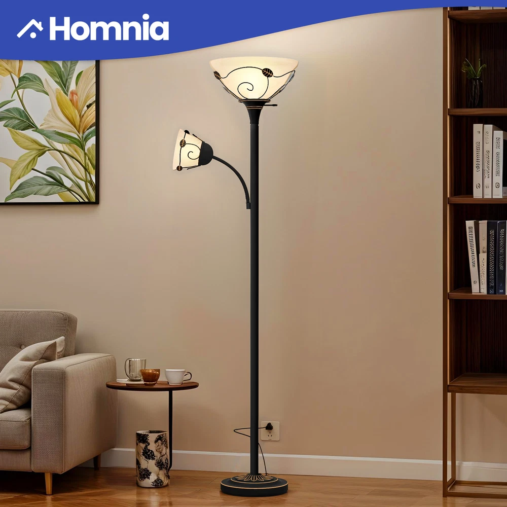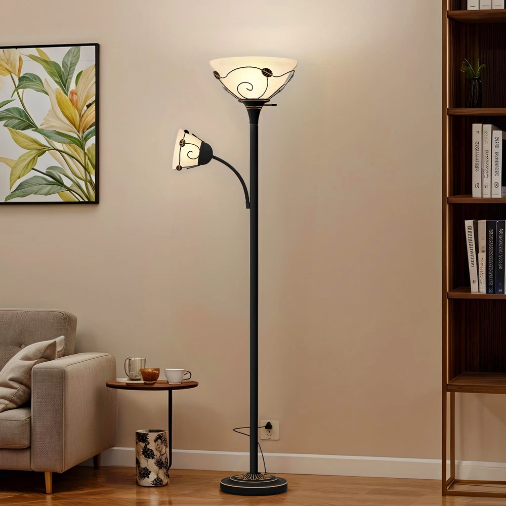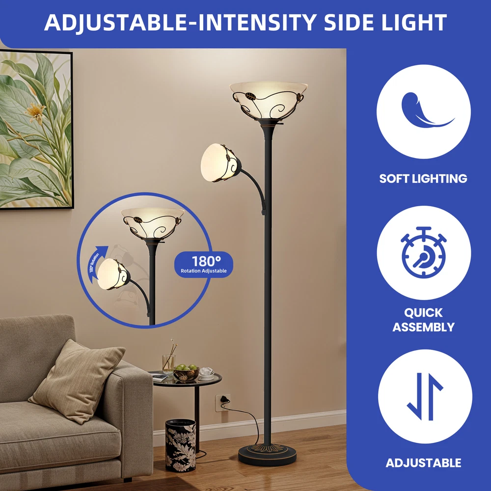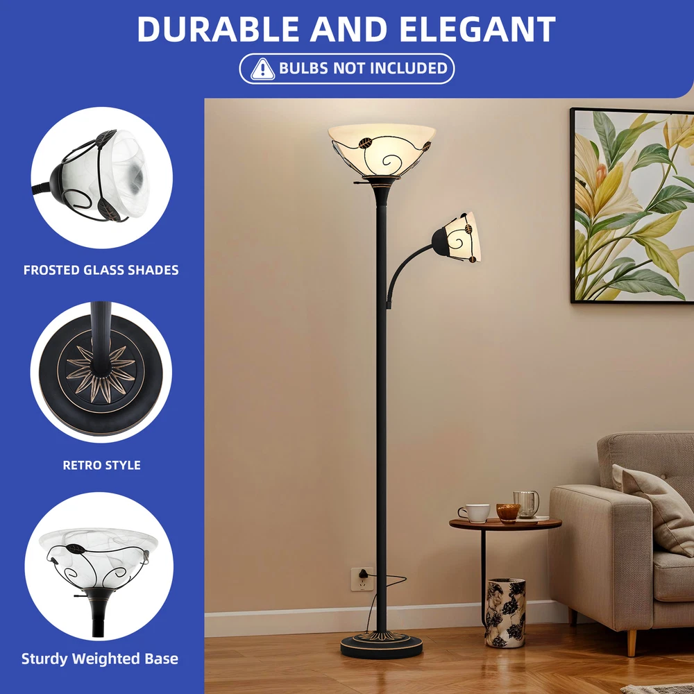 71" Vintage Torchiere Floor Lamp Adjustable Metal Stand Lamp with Reading Light Product Description NOTE: Professional Installation Would Be Highly Recommended. Description : 1. Color: Black 2. Materials: Iron & Glass 3. Room Type: Bedroom, Living Room, Family Room, Den, Home Office/Study, Entertainment Area 4. Features: Frosted Glass Shades, Retro Style, Sturdy Weighted Base, Durable And Elegant, Adjustable-Intensity Side Light, Soft Lighting, 180° Rotation Lamp, Bulb & Switch Not Included, Corrosion-Resistant & Sturdy Metal, Suitable for Various Settings, Compatible with All E26 & E12 Bulbs, Max Wattage: 150W & 40W, Easy to Assemble, Easy to Clean. Features: 1. Elegant Traditional Lighting: Merging frosted glass shades with a timeless design, this floor lamp enhances any space. Its sturdy, weighted base ensures stability and durability, suitable for any residential area. 2. Customizable Lighting Flexibility: Equipped with side lights that rotate 180 degrees , this lamp provides personalized lighting options ideal for creating a cozy environment. Its easy assembly allows for quick and effortless setup. 3. Versatile Decorative Lamp: Designed to integrate seamlessly into various settings such as living rooms, bedrooms, or offices , this lamp boasts a chic design and versatile functionality, essential for any home decor. 4. Robust Lighting Solution: Constructed with corrosion-resistant metal , this lamp is ideal for both humid and dry settings, including kitchens and bathrooms. It accommodates up to 150W with an E26 base and 40W with an E12 base , offering ample and adaptable lighting solutions for any situation. Dimensions: 1. Overall Dimension: 11.2"W x 71.3"H 2. Lamp Shade Dimension: 4.6"Ø x 4.9"H 3. Wire Length: 1.54 m Package Included: 1. 1 x Floor Lamp 2. 2 x Lamp Shades 3. 1 x Instruction Manual Note: 1. During assembly, do not tighten screws until all holes are aligned. 2. Confirm the appropriate furniture size for your needs prior to purchase. 3. There may be a slight color discrepancy between the product as seen on your monitor versus in real life. 4. Do not expose the product to extreme sunlight. To extend product lifetime, cover when not in use. 5. Contact us immediately if any components are missing or damaged upon arrival. Our customer service team will resolve your issue right away . Shipping 1. Normally the item will be dispatched within 1 business day if payment is cleared before 12 pm PST. 2. Please verify the correct shipping address in your PayPal account before making the payment. We only dispatch the item to the address that is sent to us at the time of checkout. 3. We don't ship to Hawaii, Alaska, Puerto Rico, APO/FPO/PO Boxes. 4. We don't provide local pick-up service. 5. Normally we will use USPS, UPS, FedEx & LTL to dispatch items. Payment 1. We accept PayPal and credit card. 2. We will ship to the confirmed Paypal shipping address that is provided with the payment only. Return 1. 30 days Money Back Guarantee. 2. Please contact our customer service to receive a RMA form first if want to return the item. 3. All returned items MUST in new condition with the original package. Contact If has any problem, please contact us by sending an ebay message. Our customer service will resolve the problem as soon as possible. On Feb 10, 2025 at 06:37:48 PST, seller added the following information: