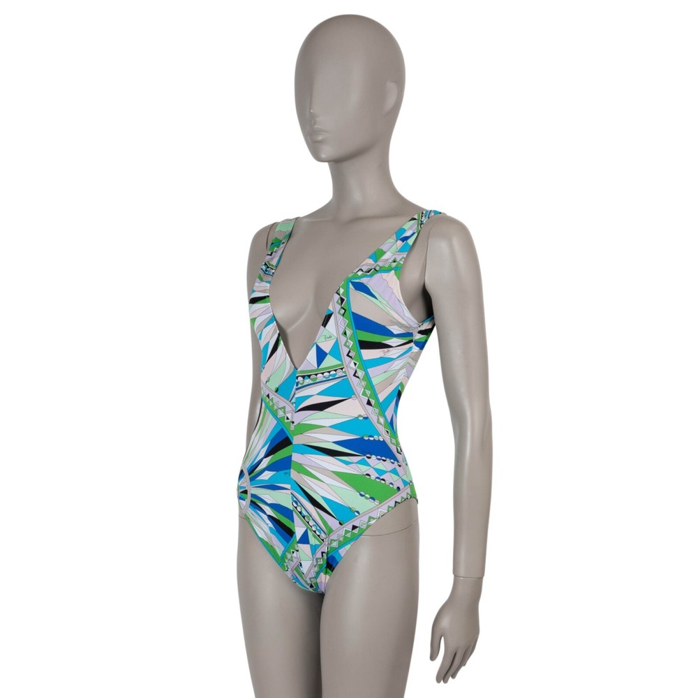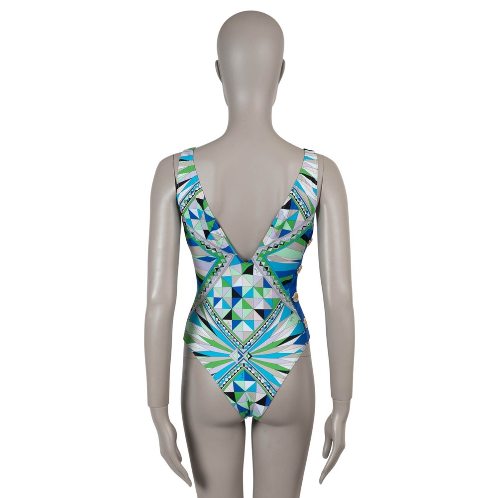 Welcome to LUX l Authentic Designer Consignment Rämistrasse 25, 8001 Zürich, Switzerland I Tue-Fri 11-18:30 & Sat 11-16:00 By bidding on our auctions you are agreeing to our Terms and Conditions below. All items come with authenticity guarantee! ------------------------------------------------------------------------------------------------------------------------------------------ Product Description: This 100% authentic Emilio Pucci swimsuit in green and blue Lycra showcases the brand's signature geometric Bes print. Designed with a plunging V-neckline, it features four decorative gold-tone buttons along one side, adding a touch of elegance. The sleek, form-fitting silhouette makes it a standout piece for resort getaways or poolside lounging. Has been worn and is in excellent condition. 2020 Pre-Fall Measurements Tag Size Missing Size XS All our listings include only the listed item unless otherwise specified in the description above - Price does not include import duties & taxes - check your countries import laws prior purchase ------------------------------------------------------------------------------------------------------------------------------------------ Terms & Conditions Luxury-Shops is not affiliated with any of the name-brand items we offer for sale. Warranties and Liabilites: Luxury-Shops declines all responsibility and cannot be held liable for any damages caused by the use of a specific garment. We also cannot be held responsible for the quality of an item (we are not the manufacturer) or any damages resulting from a manufacturing defect. No warranties of any kind are given or implied. Condition of Merchandise: Luxury-Shops offers for sale luxury top-quality products. We fully disclose the condition of each item. In the description of each product, Luxury-Shops will specify the conditions if different from the standards set by the market (Required disclosure of prior use) The main characteristics of products are shown in great detail (through numerous photographs and in-depth descriptions). The products offered for sale MAY NOT correspond to the real garments in terms of image and color because of the Internet Browser or Monitor used (color calibration). Luxury-Shops disclaims all responsibility. Every used item offered by Luxury-Shops has been cleaned and restored to the best possible condition unless noted otherwise. Every used or vintage handbag has been polished and refinished. Your purchases will be sent to you ready to be used or worn. Please be aware that vintage items may be delicate and may not be as resilient as a brand-new item. Please take appropriate care when using a vintage item. Damage to items after receipt or use by customers is not the responsibility of Luxury-Shops. Luxury-Shops is a reseller of authentic designer and vintage merchandise. We are not an authorised dealer and are not affiliated with the brands we sell on our site. Store-new designer items are only available from an authorised dealer or the actual store. Once the item leaves the authorised dealer with a customer, the item is considered pre-owned. However, items can be pre-owned and in new condition - that is, never used by the owner. Below are the definitions of the descriptions we use. NEW : in new condition, that is, never used . This means the item may have been purchased by us from an authorized dealer or a store. New items may also be pre-owned, that is, purchased by one of our consignors and never used. These items may have minor signs of handling as would any item available at an authorized dealer or boutique given that customers would reasonably handle an item when trying it on or examining it for purchase. USED: the item has been carried or worn and may be in any of the conditions described below. PRISTINE/VIRTUALLY NEW : Appears to have been used only a handful of time and is nearly new in condition. May have very slight signs of having been used upon close inspection. EXCELLENT : Used and in top condition. There may be faint signs of wear, slight scratches, marks or nicks which are not particularly noticeable and will not affect the use or wear of the item. Our descriptions and photographs will clearly indicate the condition of the item. GOOD : Used, may be an older or well-loved item. There may be slightly more noticeable signs of wear, scratches or marks. These will not affect the wear or use of the item. Our descriptions and photographs will clearly indicate the condition of the item. VINTAGE : Typically around 20 to just under 100 years old. Our vintage items are carefully examined and selected. Most are gently or rarely used, meticulously stored or cared for and will come to you in a perfectly usable condition. However, these are unique items which may be of a finer and more delicate nature than brand-new items so please be sensitive to this and have reasonable expectations of their resilience. We do not make allowances for unreasonable expectations in the condition of our items. Product Descriptions: We make every effort to display the products featured on our web site as accurately as possible, using a large array of unaltered digital photographs and detailed descriptions. Our examination and assessment of merchandise is meticulous and conducted with great attention to detail. Our expertise and product knowledge comes from many years of experience with authentic designer and vintage items. We make as much effort as is humanly possible to disclose all relevant information required for you to be completely confident about your purchase. However, the display and colour capabilities of your computer monitor could affect the colours you see on the screen and these may differ from the actual product. Luxury-Shops is not responsible for monitor limitations and cannot guarantee that a monitor's display of any colour, texture, or detail of merchandise will be accurate. Also, every designer has a different standard with regards to the sizing of garments and shoes. We provide