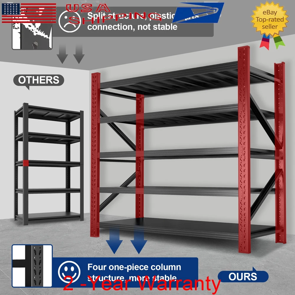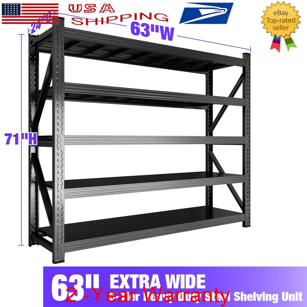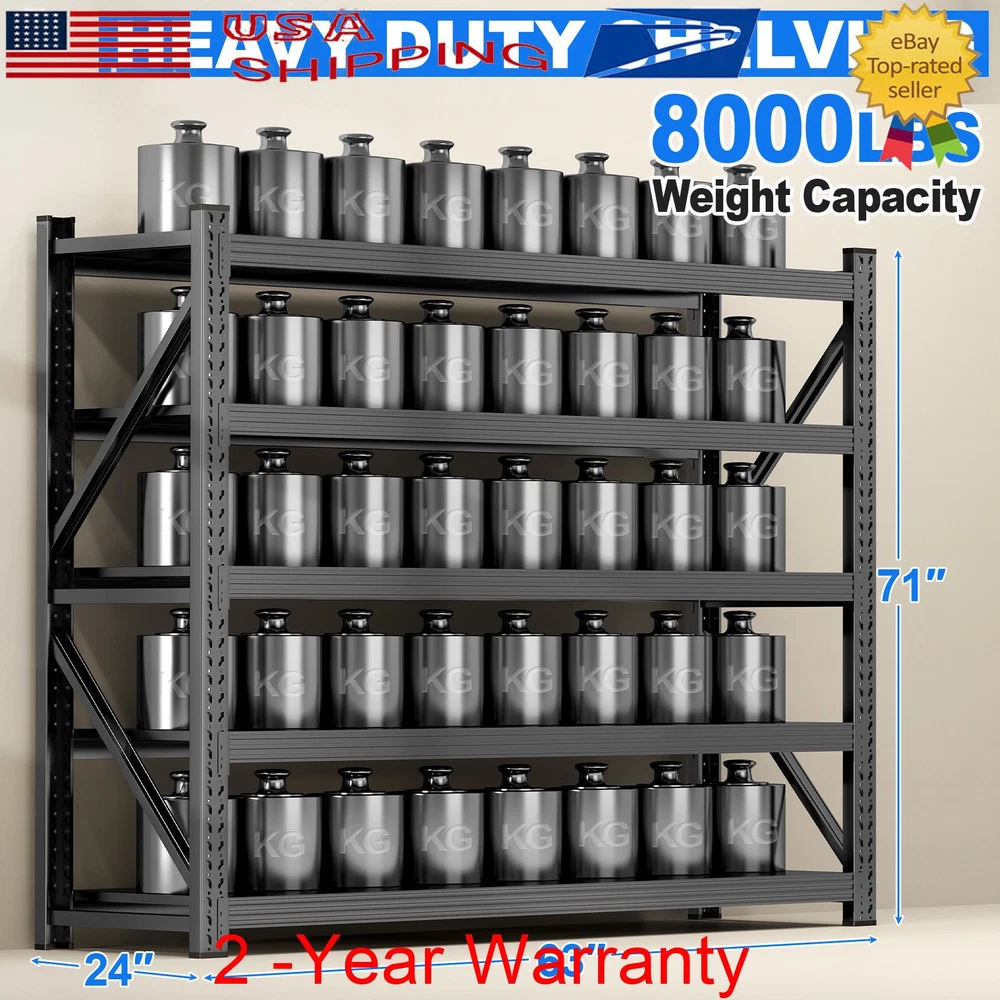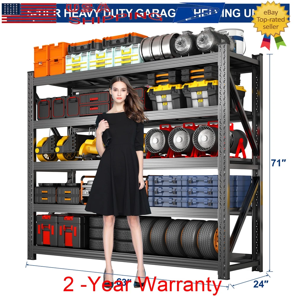 71"H Garage Shelving-5 Tier Garage Storage Shelves,Adjustable Heavy Duty Metal Product Description Say goodbye to wobbling shelves and weak joints. Our Garage Shelving features four one-piece steel columns, thick steel shelves reinforced with ribs, and extra-wide beams for superior durability and strength. It’s perfect for storing tires, generators, tools, and more. Adjustable shelf heights let you create the setup you need, while the quick, 10-minute installation makes organization effortless. About this item 【Heavy Duty Garage Shelving Load 8000LBS 】Designed to handle even the toughest storage challenges. With a total weight capacity of 8000 lbs and 1600 lbs per shelf, this shelving unit is built to withstand heavy-duty use. Featuring one-piece columns, dual Reinforcing Diagonal Supports, reinforced Steel shelves with three support ribs, and extra-wide beams, it offers unparalleled strength and durability. 【One-Piece Columns with Diagonal Supports 】No seams, no weak spots. Our four one-piece columns, reinforced with diagonal supports, are the key to a sturdier, more reliable garage shelves. The seamless design, combined with the diagonal braces, eliminates wobbling and sagging, offering enhanced stability and durability for heavy-duty storage., unlike split column garage shelf that can suffer from weak joints and instability. 【Thick Steel Shelving with Reinforcement Rib】Our shelf’s thick steel shelves, reinforced with ribs and supported by extra-wide beams, provide unmatched durability for all your storage needs. The reinforced ribs help spread the weight evenly across each shelf, while the extra-wide beams ensure maximum load-bearing capacity, preventing any bending or sagging over time. 【Adjustable Metal Shelf】Our heavy duty shelving features adjustable shelves, allowing you to create the perfect storage system for your unique needs. Adjust the height of each shelf to fit everything from large appliances to smaller tools, and enjoy a customizable storage experience. Whether it’s for home or commercial use, this shelving unit is versatile and practical. 【Garage Shevleing with Monster Storage Space】This extra-wide garage shelving is perfect for garages, warehouses, basements, and shops. It’s not just for home use – this shelving unit is also ideal for industrial and commercial applications. Perfect for storing heavy-duty items like tires, generators, and motor oil crates, it's built for mechanics, warehouse professionals, and anyone who needs reliable, heavy-duty storage. 【10-Minute Solo Assembly】We’ve simplified assembly with a comprehensive installation guide and clearly labeled parts for each step. And if you run into any issues, our professional customer service is always ready to offer guidance and support, ensuring a flawless experience. Product Sizes 1PCS --- 5 Tier - 63" W x 24" D x 71" H