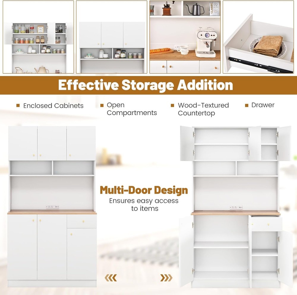 Product Description About this item Enclosed Storage Areas: Elevate your kitchen’s functionality with the pantry cabinet, featuring a drawer and 3 3-position adjustable shelves with each level offering a 1.5” adjustment. Besides, it has multiple doors with adjustable hinges for easy access. Ideal Power Accessibility: No more shortage of sockets. The 71” tall kitchen hutch storage cabinet integrates 2 AC outlets of 125V 12A and 2 USB ports of 5V Max. 2.1A, making it a breeze to operate kitchen gadgets and charge devices. Practical Open Storage: The freestanding buffet cupboard comes with 2 open compartments and a wide countertop, successfully reducing the hassle of finding kitchen supplies. Therefore, your glass, bowl, and seasoning will be easily accessible. Anti-Tipping Protection: Your family’s well-being is our top priority. That’s why the sideboard cabinet includes anti-tipping kits and a large base, ensuring a secure space in your kitchen. By the way, the overall load capacity reaches up to 755 lbs. Modern Design & Wide Use: The pantry cabinet with microwave stand is where sophistication meets modern utility. Its stylish appearance fits seamlessly into any decorations and is perfect for your dining room, living room, kitchen, and more. Description: Upgrade your kitchen’s functionality with the versatile pantry cabinet. It combines enclosed storage areas and practical open compartments, featuring 3-level adjustable shelves, open compartments, a wide countertop, and a drawer. Equipped with AC outlets and USB ports, this 71” tall cabinet provides an easily accessible charging station and convenient power access for kitchen gadgets and charging devices. Safety is a priority with anti-tipping kits and a sturdy base. The kitchen cabinet can support up to 755 lbs. Its modern appearance effortlessly complements any decorations, making it suitable for dining rooms, living rooms, and kitchens. Many other user-friendly details are waiting for exploration. Features: Wood-textured countertop and open compartments provide large open storage Effective storage addition with enclosed cabinets and a pull-out drawer 3-position adjustable shelves make free space arrangement a reality With 2 AC outlets of 125V 12A and 2 USB ports of 5V Max. 2.1A for easy charging The anti-tipping kits keep the cabinet firmly attached to the wall for ensured safety Perfectly ensures easy access to items thanks to the multi-door design Designed with adjustable hinges that ensure door gaps can be flush Fitted with premium metal slides, which are smooth and low-noise Considerately ensure a smooth surface with included screw hole covers Thickened base ensures that the buffet cabinet can stay away from dirty floors Specifications: Color: White Material: MDF, Engineered Wood Overall Dimensions: 39.5” x 16” x 71”(L x W x H) Size of Upper Enclosed Shelves (Left): 25” x 8.5” (L x W) Size of Upper Enclosed Shelves (Right): 12.5” x 8.5” (L x W) Spacing Between Cabinet Top and Upper Shelves: 7” Each Level’s Adjustment of Adjustable Shelves: 1.5” Size of Each Open Compartment: 19” x 9” x 6.5” (L x W x H) Height of On-Countertop Clearance: 16” Size of Countertop: 39.5” x 14”(L x W) Size of Lower Enclosed Shelves (Left): 25” x 13.5” (L x W) Spacing of Lower Adjacent Shelves (Left): 13.5” Size of Lower Enclosed Shelves (Right): 12.5” x 13.5” (L x W) Spacing of Lower Adjacent Shelves (Right): 10.5” Inner Size of Drawer: 10” x 12” x 3.5”(L x W x H) Height of Base: 3” Length of Power Cord: 6.3 ft Total Load Capacity: 755 lbs Load Capacity of Countertop: 330 lbs Load Capacity of Drawer: 25 lbs Net Weight: 132 lbs Package Includes: 1 x Pantry Cabinet 1 x User Guide On Aug 14, 2025 at 21:35:57 PDT, seller added the following information: