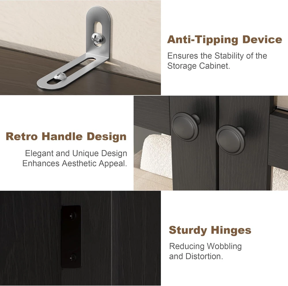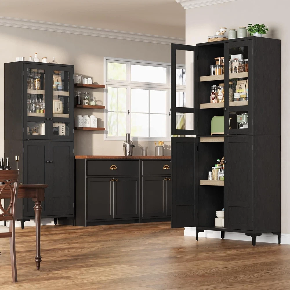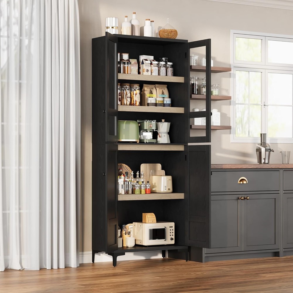 71 Inch Tall Storage Cabinet with Glass Doors, Kitchen Pantry 5 Tier Bathroom Cabinet with 4 Doors Adjustable Shelves for Kitchen, Dining Room, Bathroom (Black, 4 Door with Glass) Product Description About this item Vertical Elegance: Standing at 71 inches tall and measuring 27.56 x 13.78 inches, this tall storage cabinet features five tiers and four doors, providing ample space for organizing items. Its narrow design makes it ideal for tight spaces in your home Tailored Storage: This narrow wooden cabinet features one adjustable shelf for customized storage solutions. Modify shelf heights to accommodate items from pantry goods to bathroom essentials, ensuring everything has its place Built to Endure: Made from thick engineered wood and sturdy metal hardware, this bathroom cabinet offers stability and longevity. The magnetic closure secures the doors, and the elevated bottom guards against damage for added durability Multi-Purpose Use: This farmhouse storage organizer serves as a bathroom cabinet, pantry storage, accent cabinet, or garage and office cabinet. Its versatile design enhances organization throughout your home, making it a practical addition to any room Effortless Assembly: With clear instructions and labeled parts, assembly is simple. For best results, having two people assist is recommended, ensuring a smooth and efficient experience while you enjoy your new pantry cabinet Kitchen Pantry with Doors