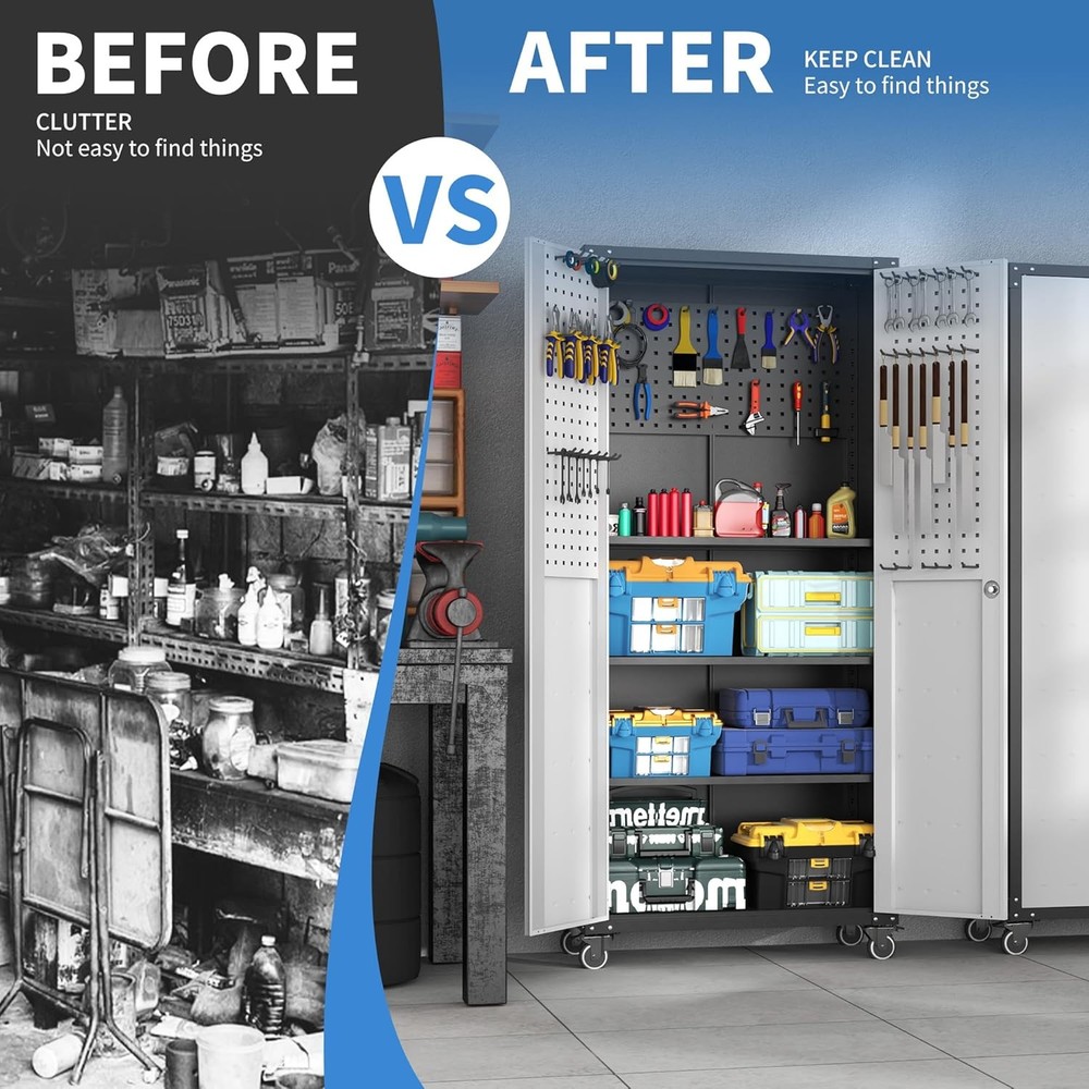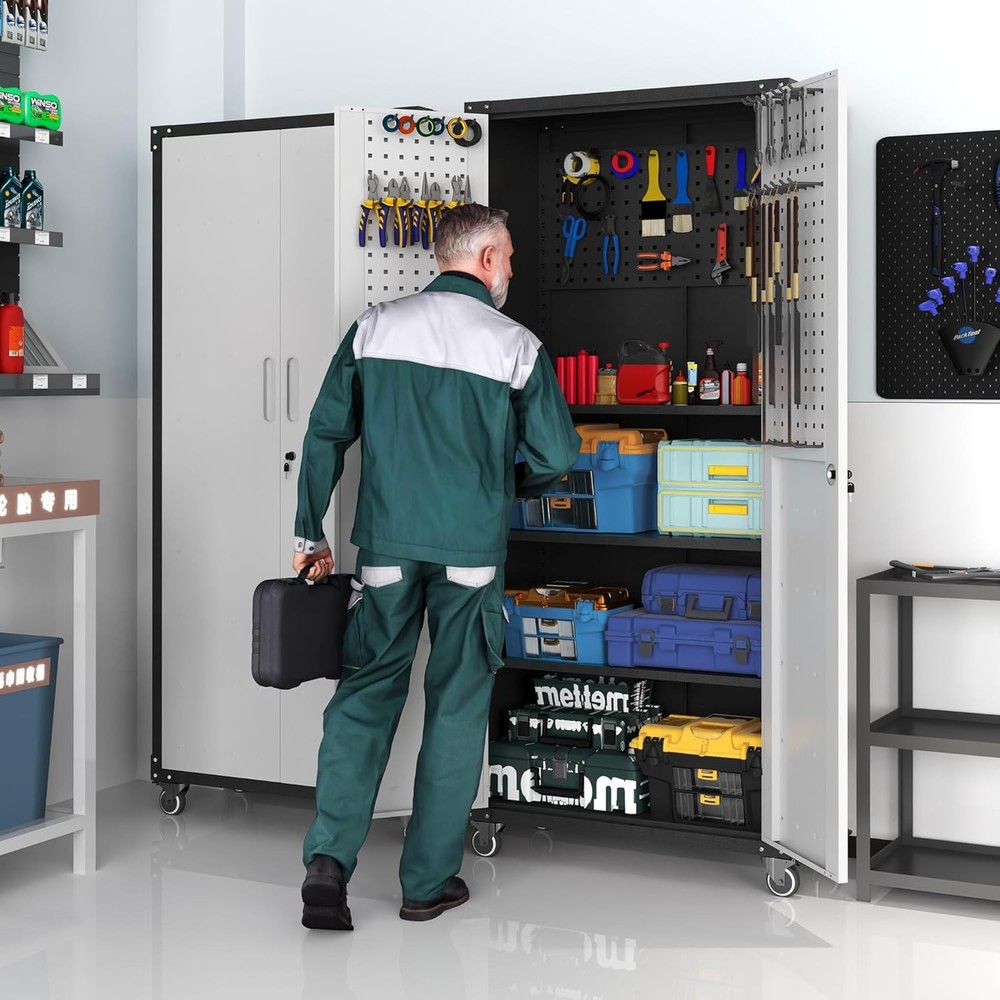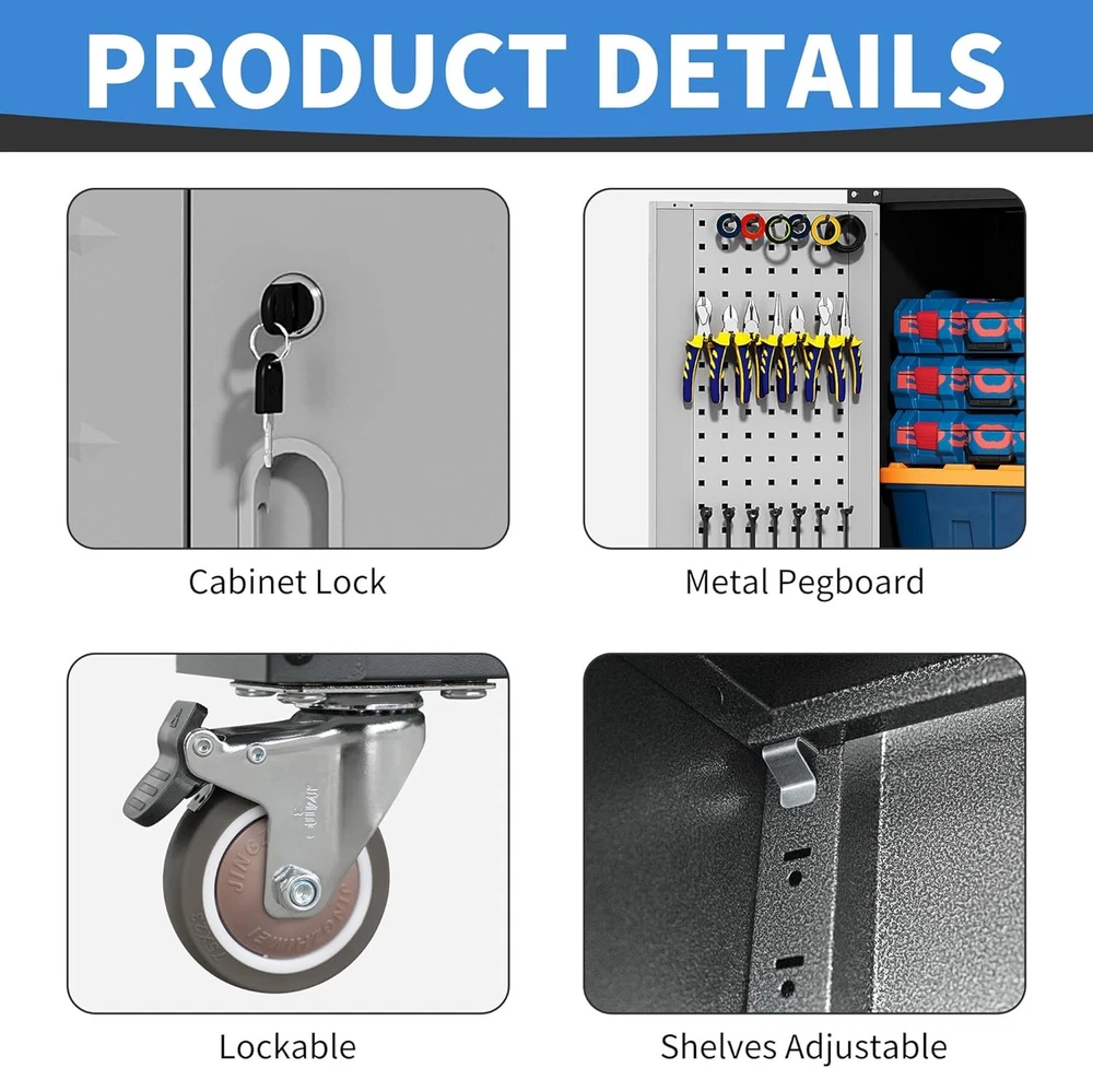 Product details: Product Size: The size of this tool storage cabinet is 71''H*31.5''W*16''D, made of high-quality cold rolled steel material stamping, and then powder coated to form a protective layer on the metal surface, which can effectively waterproof and fireproof, and prevent corrosion. Easy and Quick Assembly: In order to facilitate the quick assembly of the tool storage cabinet, we provide you with a detailed installation video and installation instructions. Watching the video and information before assembly will save you time. Adjustable Shelves: This metal garage storage cabinet comes with 3 adjustable shelves and 2 tool pegboard that can be adjusted to different heights depending on the height of the items. The 2 tool pegboard can be hung inside the tool cabinet or on the wall, both of which are able to organise your tools effectively. 360° Swiveling Wheels With Brakes:This tool chest with wheels is equipped with 4 silent rubber wheels with brakes.360° SWIVELING MOVEMENT can be moved freely according to your operation place, which is convenient for you to reach your tools. You can use the brakes to fix the tool cart when you are working in a fixed place. Brand BIZOEIRON Color Black & Grey Recommended Uses For Product Tools Product Dimensions 15.75"D x 31.5"W x 70.87"H Special Feature Heavy Duty, Lockable, Rust Resistant, Wheeled, Adjustable Shelf Material Metal Style Tall - 2 Doors & Pegboard Number of Doors 1 Shape Rectangular