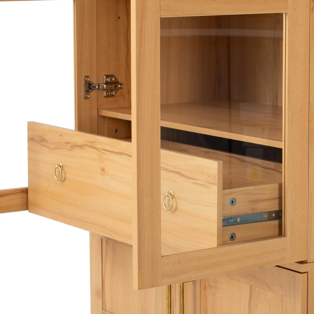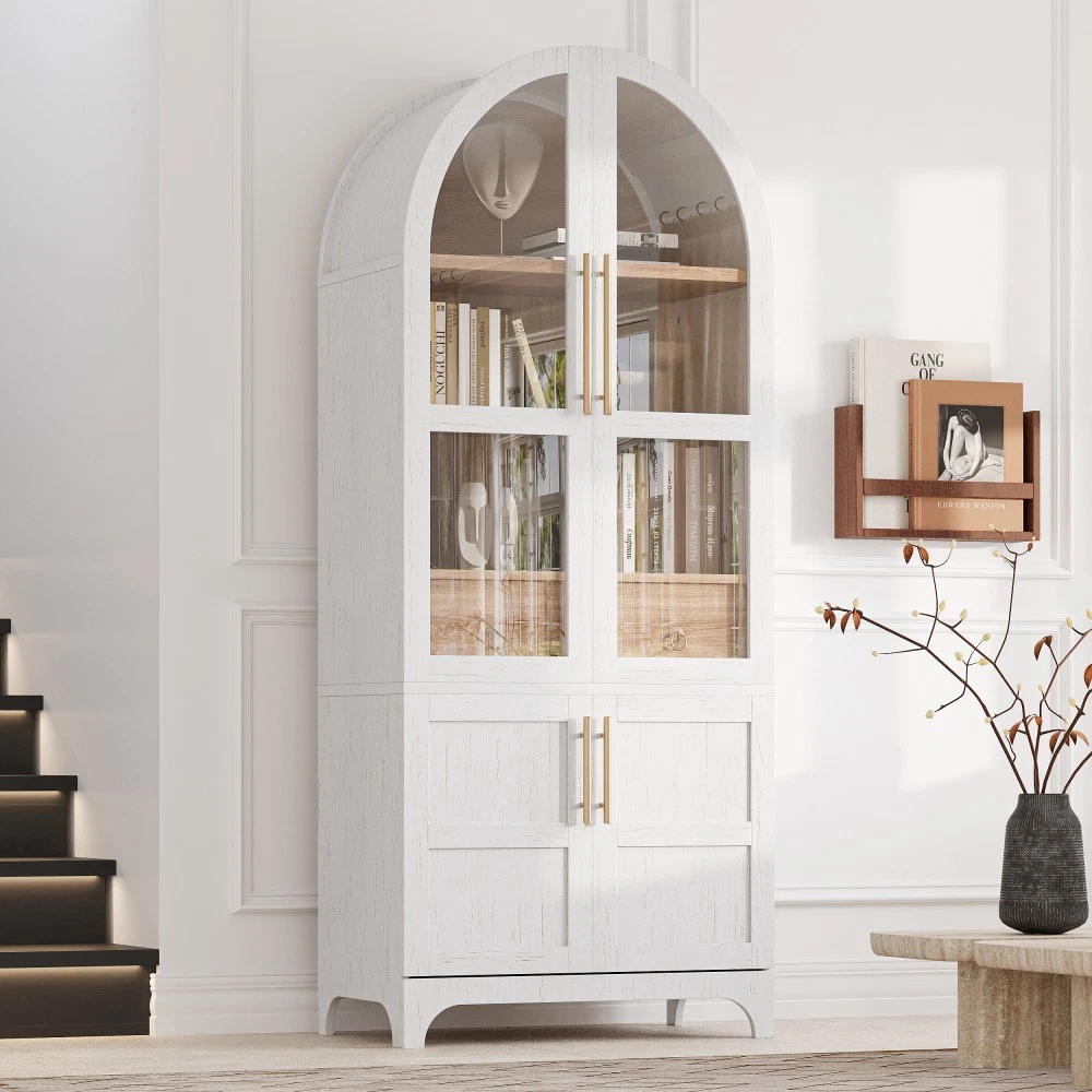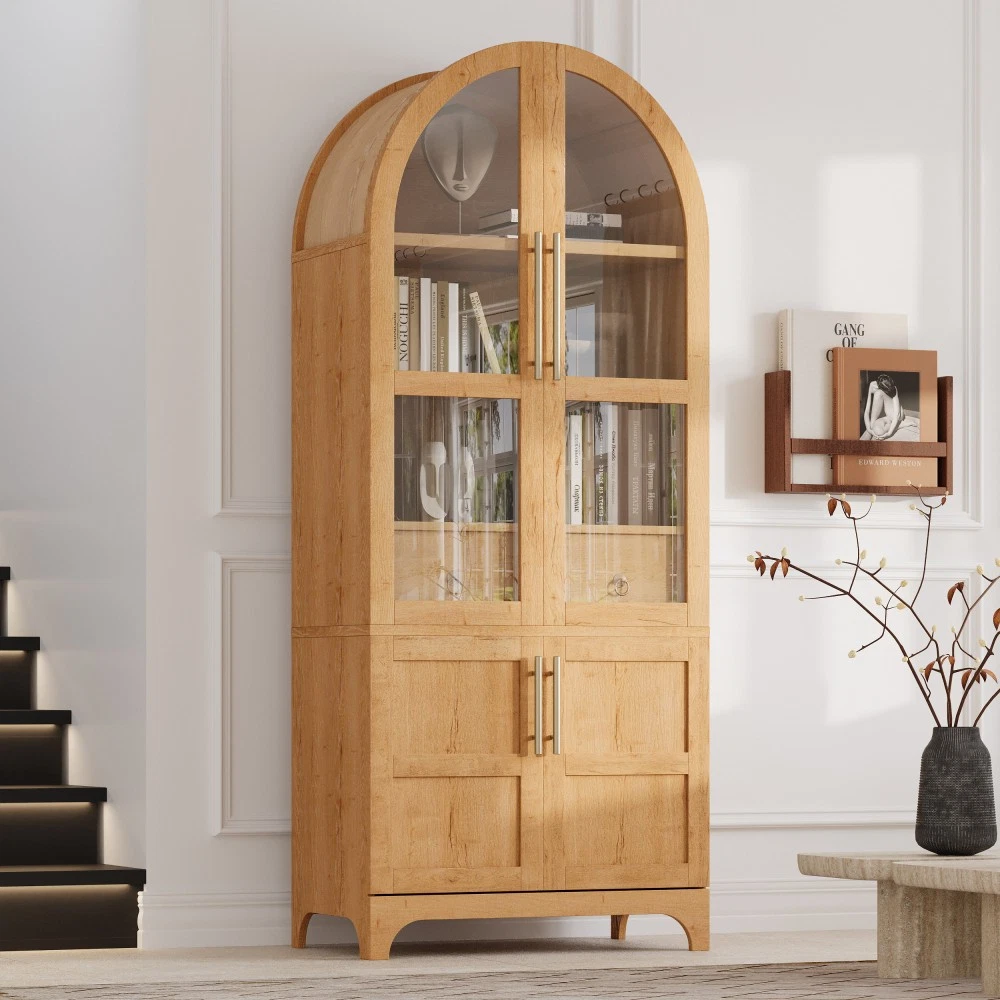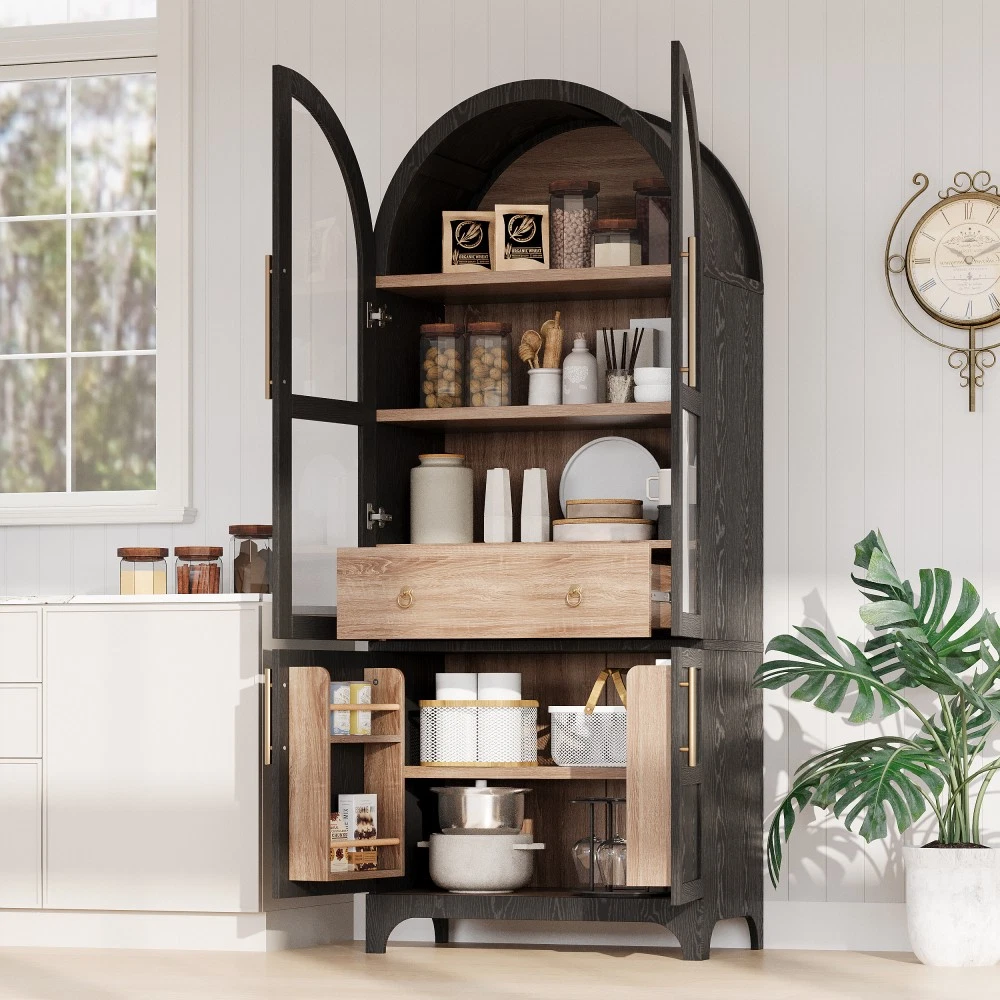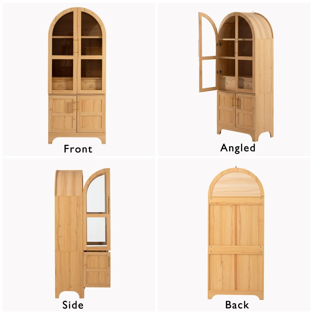 71'' Arched Farmhouse Kitchen Pantry Cabinet - Natural Wood Grain | Adjustable Shelves, Hidden Drawer & Glass Doors 🔹 Key Specs (At a Glance) Style : Farmhouse, American Traditional, Antique, Classic Color : Natural (two-tone wood grain finish) Material : High-Density MDF + Durable Melamine Laminate Overall Dimensions : 30”W × 15.75”D × 71”H Product Weight : 120.42 lbs Weight Capacity : 250 lbs (total) | 75 lbs (per shelf) | 50 lbs (drawer) Package Details : 1 box (65”L × 19”W × 9”H, 125.22 lbs) Assembly Time : 40–60 minutes (clearly labeled parts + instructions) Doors/Drawers : 4 doors (with glass panels) + 1 hidden drawer ✅ Core Features That Matter ✅ Timeless Arched Design – A charming arched dome top, farmhouse-style paneling, and elegant brass handles/metal pull rings create vintage appeal that never goes out of style. Soft-close hinges prevent slamming, reduce noise, and extend door life.✅ Customizable Storage – 2 adjustable shelves, 4 door-mounted storage racks, and a spacious hidden drawer offer 5 layers of organization. Store dinnerware, food, appliances, or decor—tall items fit easily with adjustable shelving.✅ Sturdy & Safe Build – Crafted from high-density MDF with reinforced hinges and smooth drawer slides. Includes an anti-tip kit to secure the cabinet to walls, keeping kids and pets safe (critical for tall furniture!).✅ Eco-Conscious Material – Made with P2 MDF (low-formaldehyde) and melamine laminate for durability, scratch resistance, and easy cleaning.✅ Multi-Room Versatility – Beyond the kitchen, it shines in dining rooms, home offices, bedrooms, or reading rooms—its natural finish blends with any decor. 🏡 Where to Use It This cabinet isn’t just for kitchens! Use it to: Organize kitchen essentials (spices, bowls, cookware) Store dining linens, serveware, or wine glasses Corral home office supplies (books, files, tech gear) Display decor or collectibles behind glass doors Hide clutter in bedrooms (linens, accessories) 🛠️ Assembly & Care Made Easy Assembly : All parts are labeled clearly, with step-by-step illustrated instructions and all hardware included. No special tools needed—assemble solo or with a helper in 40–60 minutes. Care : Wipe clean with a soft dry cloth; avoid harsh chemicals or abrasive cleaners (they can damage the finish). Periodically check hardware to keep connections tight. 🛡️ Risk-Free Purchase Guarantee We stand behind the quality of this pantry cabinet with: 1-Year Warranty : Covers manufacturing defects (hinges, hardware, structural issues). 30-Day Free Return & Exchange : If you’re not 100% satisfied, return it for a full refund or replacement—no hassle, no restocking fees.