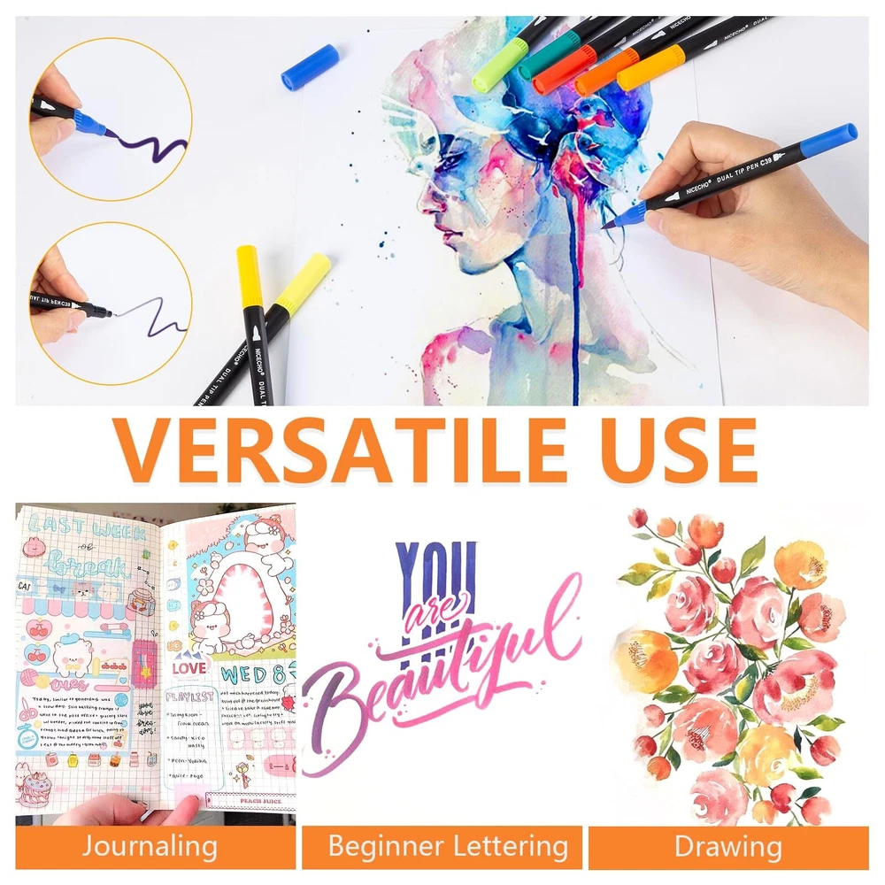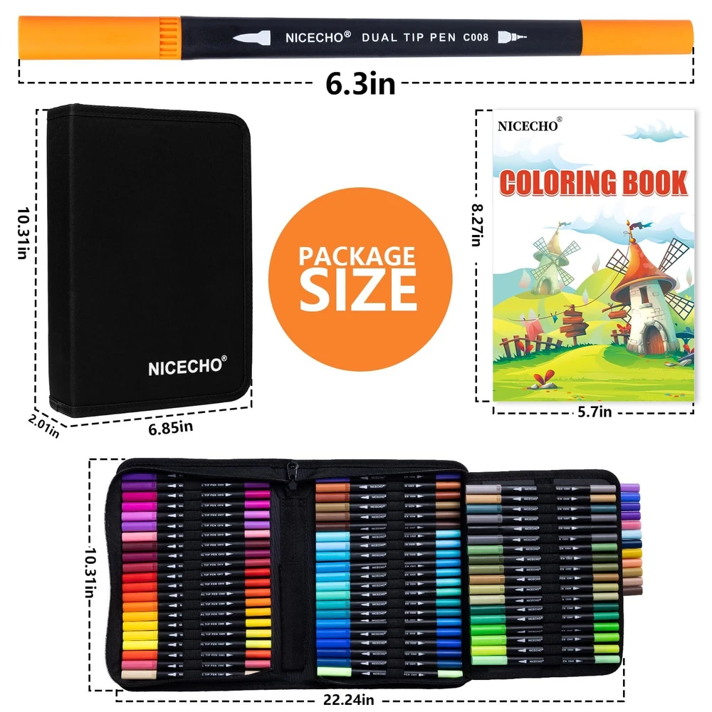 【72 VIBRANT COLORS】Each set Includes 72 primary and complementary colors, NO duplicate. You'll never run out of possibilities or color options with this deluxe coloring markers set. Just blend beautifully for added dimension to your artwork, and create one you never have before. 【CONVENIENT, STURDY DUAL TIPS】With 2 different tips to choose from, you have an infinitely wider array of coloring styles at your disposal! BRUSH for sweeping strokes and blending, FINE POINT for intricate details like sketching and writing. 【SMOOTH, NONTOXIC INK】Nicecho dual brush marker set come with high-quality water-based ink that flows smoothly. The ink's vibrant colors seamlessly blend, providing beautiful and consistent coloring effects without smudges. 【PORTABLE & DURABLE BAG】Our dual tip pens comes with a durable carrying case which have pen slots to organize all your colors. If you know someone who's artistically inclined in your life, this is a thoughtful gift that will keep on giving. 【MULTIFUNCTIONAL & SUITABLE FOR ALL AGES】Ideal for various artistic pursuits such as drawing, lettering, coloring books, and sketching. Perfect art suppliers for all ages, making it an excellent gift for artists, students, and creative enthusiasts.