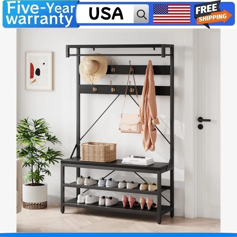 💓Multifunctional Hall Tree: The design of hooks, shoe rack, and drawers make your home tidy. The removable hooks are great for hanging your clothes when you back home. Also, shoe storage is very convenient for families to storage their shoes when coming back or going out. 💓Stable& Safe: The entryway hall tree is made of strong metal frame, sturdy particleboard, adjustable screw-in protective feet, and with extra anti-tip kits belt. These exquisite workmanship makes the standing coat rack perfectly stabled on uneven ground without floor scrapes and scratches, and prevent it from falling to keep safety of the family. 💓Easy Assembly: The assembly instructions are very detailed. And all necessary hardware & tools are included in the package. You will get a perfect clothes rack very fast. Also, If you have any questions when installing this coat rack, please feel free to contact us, and we will try our best to help you! 💓Dimension: The size of our hall tree is 39.97” L x 15.7” W x 72” H. Please check your measurement before purchase. Once assembled, Each hook can hold up to 6.6 pounds and the shoe bench can hold 300 pounds. 💓What's Included: Coat Rack, Shoe Bench, Adjustable feet, Hanging Bar, Floating Shelf with Mounting hardware, Easy-to-follow instructions and 24/7 service. Product Description Payment Delivery details Terms of sales About us Contact us Payment We accept payment either via PayPal or any of the following credit cards; Visa, MasterCard, Discover, and American Express. Wishing you a happy life! Delivery details We will provide you with the tracking number on the same day or the next day, and transport your package through UPS, DHL, FedEx and other courier methods. If you have any questions, please feel free to contact me and I will do my best to help you solve the problem. Wishing you a happy life! Terms of sales We offer a one month free return and exchange service, and you don't have to bear any losses. We will provide multiple solutions for you to choose from. If you have any questions, please feel free to contact me and I will do my best to help you solve them. We offer a two-year warranty period. If you have any quality issues with the product you purchased within two years, please feel free to contact me. I will provide you with a free replacement service. If you have any questions, please feel free to contact me. I will do my best to help you solve the problem. Wishing you a happy life! About us We are committed to becoming the best eBay seller, with high-quality suppliers, providing the most sincere service, including pre-sales and after-sales service, to give you a satisfactory shopping experience. If you have any questions, please feel free to contact me, and I will do my best to help you solve the problem. Wishing you a happy life! Contact us If you encounter any problems, please contact me by email at the first time, I will provide you with a solution as fast as possible so that I can give you a satisfactory shopping experience, wish you a happy life! Brand grvee Type Coat & Hat Racks Material ‎Wood, Iron, Metal Mounting Free Standing Product Dimensions 45.67 x 17.52 x 4.92 inches 45.67 x 17.52 x 4.92 inches Item Weight 44.3 pounds Manufacturer Warranty 5 Years