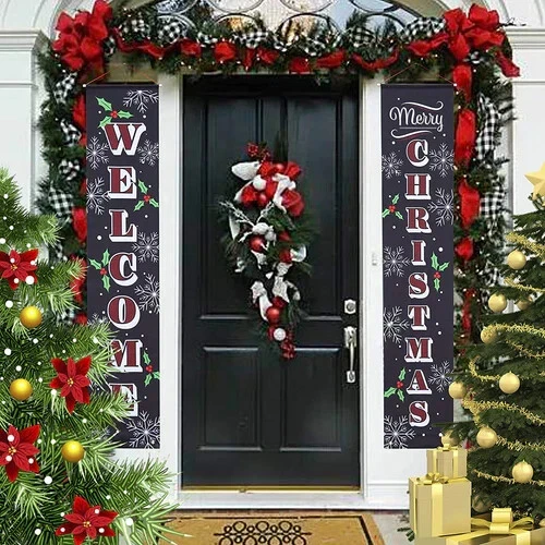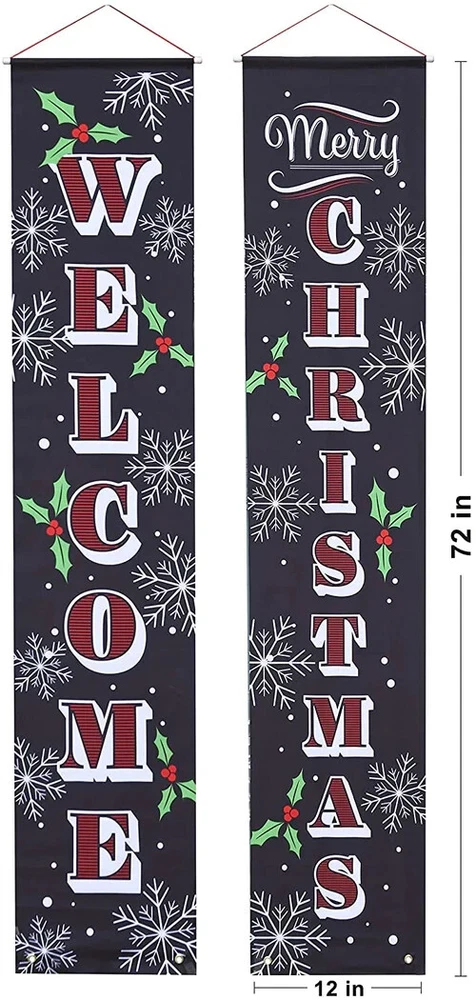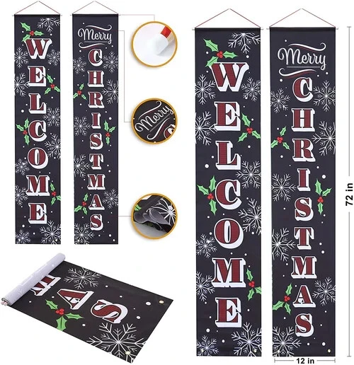 Description Our porch hanging sign set includes 2 banners with "Welcome and Merry Christmas" prints. Each vertical door banners measure 12 x 72 inches. The banner features two bottom holes that make it tidier and windproof. Easily hang these life-size hanging signs anywhere you like as this came assembled with rod and string. This is made of weather-resistant 600d polyester oxford fabric. Proven waterproof which makes it safer if hung outside. Child safe: non-toxic. Meet the US toy standard. Safety test approved.
