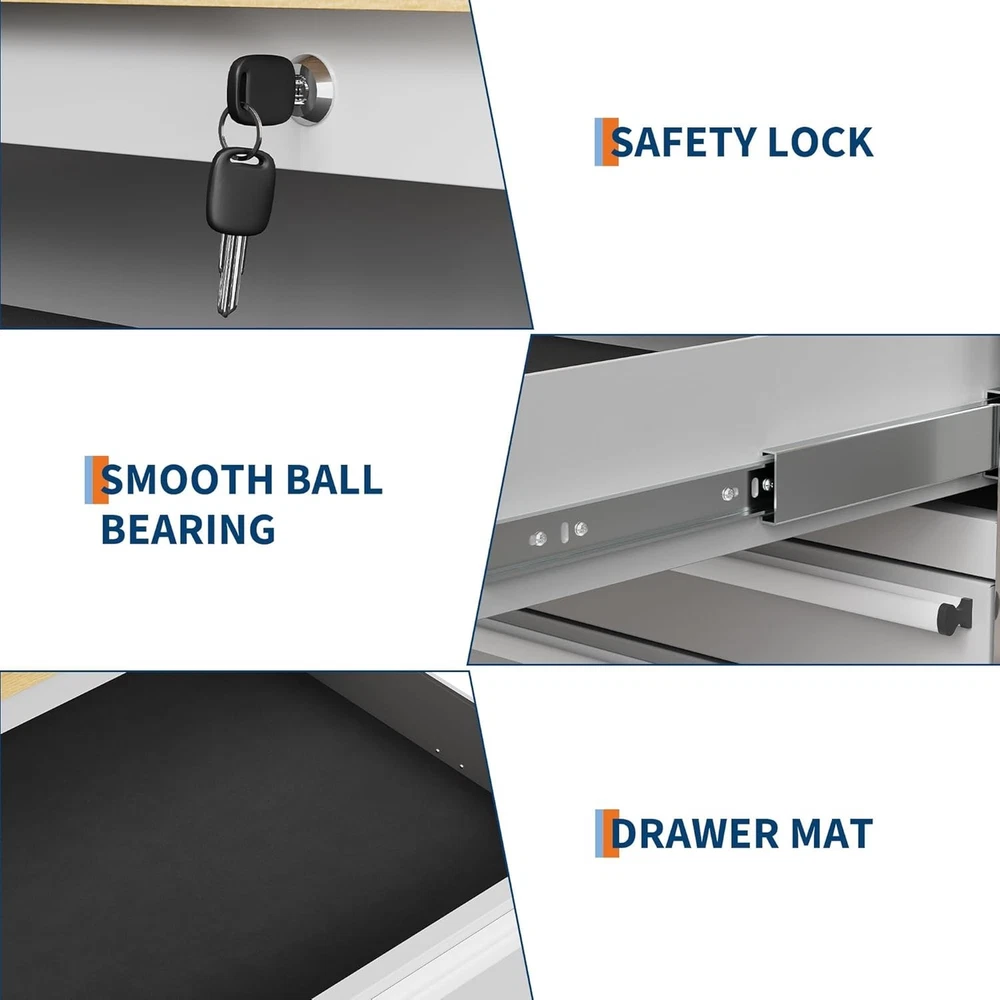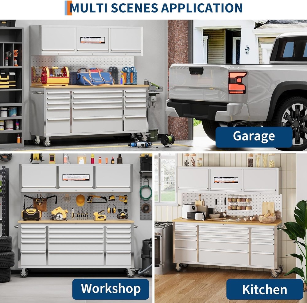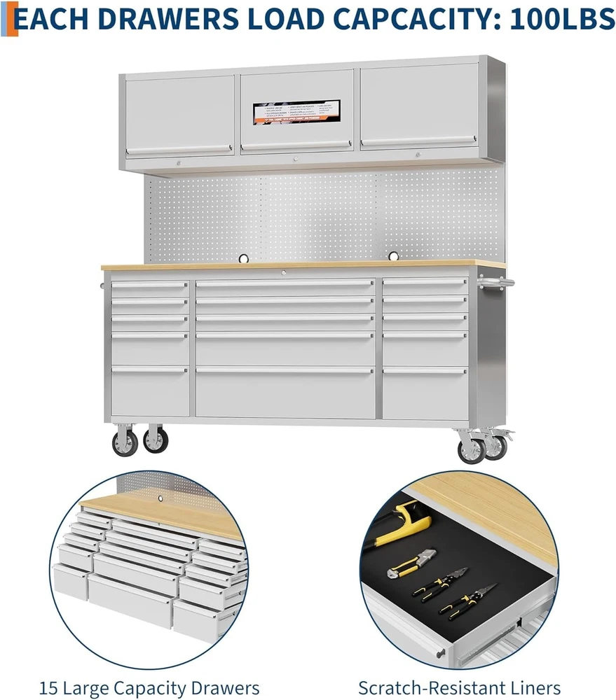 Product Description Ample Storage and Organization: This heavy duty 61 inch tool chest cabinet features 10 spacious drawers with smooth ball-bearing slides and anti-slip liners, providing an efficient tool storage solution for garages and workshops. Adjustable shelves offer versatile organization for all your hand tools and accessories. Durable Solid Wood Worktop: Equipped with a robust rubber wood workbench top, this garage workbench supports up to 1675 lbs. The large surface is perfect for heavy-duty repair projects, mechanical work, or DIY tasks, making this tool storage cabinet a reliable workstation for home or shop use. Rugged Steel Construction: Built from thick, powder-coated steel, this rolling tool chest is designed for maximum durability and long-lasting use. Each drawer holds up to 22 or 44 lbs, ensuring your tools remain organized and secure in a sturdy, professional-grade tool cabinet with drawers. Easy Mobility and Stability: With 4 swivel casters and a convenient side handle, this mobile tool cabinet moves effortlessly across your workspace. Locking wheels and brakes ensure stability, making it ideal for busy garages and work areas that require both portability and a secure, stationary workbench. Secure Locking System: Keep your valuable tools safe with the integrated lock and keys, which prevent unauthorized access and accidental drawer openings during transport. Protective corner bumpers help guard against collisions, ensuring a longer lifespan in high-traffic environments. Built-In Power Strip: Stay powered up with 4 standard outlets and 2 USB ports for charging and running your tools. This workbench with power strip is designed for efficiency, letting you keep power tools and devices within reach for maximum productivity in your garage, shop, or mechanic workstation.