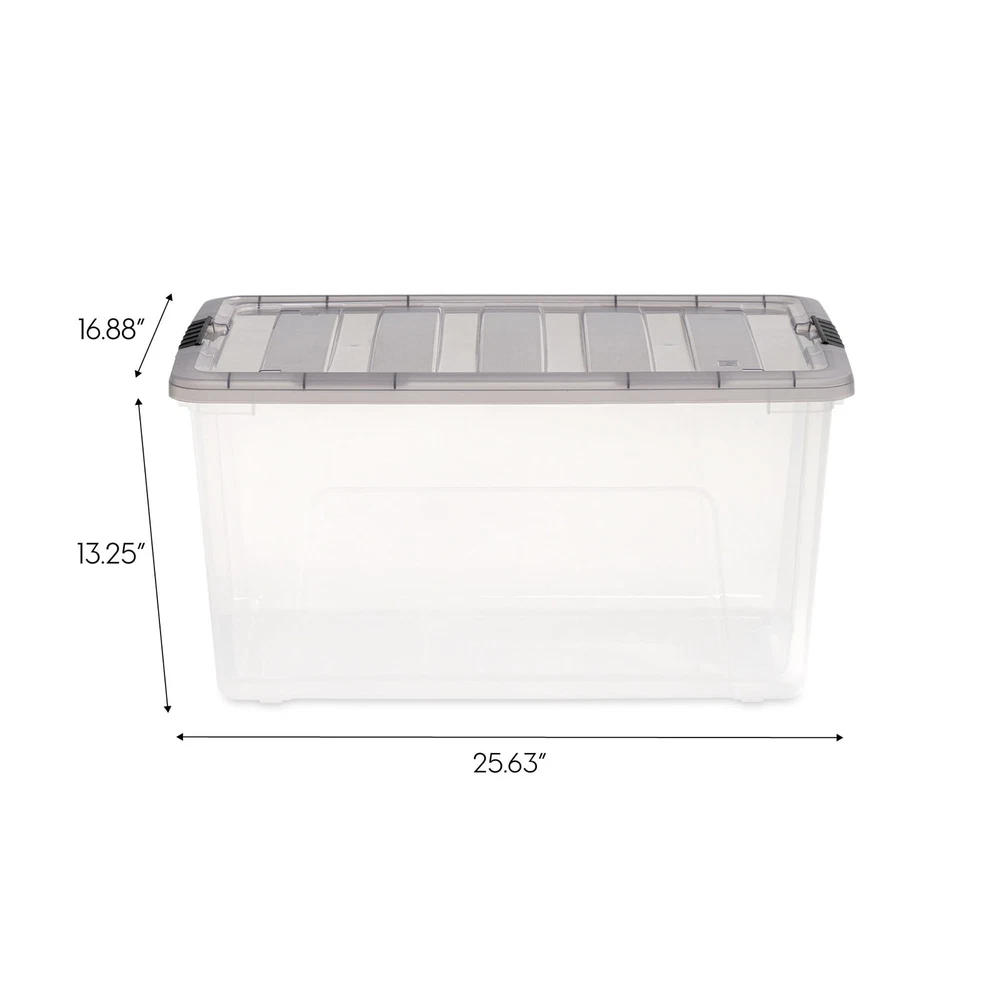 Declutter and organize with ease using these reliable storage containers designed for everyday use in any space. These plastic storage bins with lids are a practical and efficient solution for organizing your home, garage, office, or classroom. Whether you need to store clothing, tools, crafts, pantry goods, or holiday decorations, these storage totes offer the strength, capacity, and convenience you need. Each storage bin features a secure latching lid to keep contents protected from dust, dirt, and moisture, making them perfect for both short-term and long-term use. The storage bins with lids are ideal for storing seasonal items, kids’ toys, school supplies, or office materials. These totes for storage are designed to keep your space neat and your belongings easily accessible. Built-in handles make every storage tote easy to carry and move, while the stackable design allows you to save floor space and maximize vertical storage. These totes stack securely to help organize closets, shelves, pantries, basements, and garages. The sturdy construction of these storage totes with lids ensures long-lasting performance, even with frequent use. Perfect for any room or setting, these storage bins are a versatile choice for dorm rooms, laundry rooms, classrooms, or during a move. Whether you're creating a more organized home or simply need a dependable tote for packing away items, these plastic storage bins with lids are the ideal choice. Take control of clutter and simplify your life with these all-purpose storage containers. From everyday essentials to seasonal storage, these bins provide a dependable and stylish way to stay organized. Designed for durability, ease of use, and space-saving efficiency, these storage totes deliver reliable performance and flexible storage for any lifestyle. Bins with 72 Qt. capacity – Large interior provides ample room for bulky items, seasonal gear, or household essentials. Storage containers built for durability – Strong plastic construction ensures long-lasting use for all your storage needs. Storage bins with lids – Secure latching lids keep your items protected from dust, dirt, and moisture. Totes for storage and organization – Ideal for home, garage, basement, or office use to reduce clutter and stay organized. Plastic storage bins with lids – Durable bins with tight-fitting lids provide easy access to contents while keeping items protected. Storage totes with stackable design – Save space by stacking multiple bins vertically in compact areas. Storage totes made for convenience – Lightweight and easy to carry with built-in side handles. Bins for multipurpose use – Great for clothing, tools, crafts, decorations, and more. Storage totes with secure latches – Snap-tight latches keep contents secure whether you're storing or transporting.