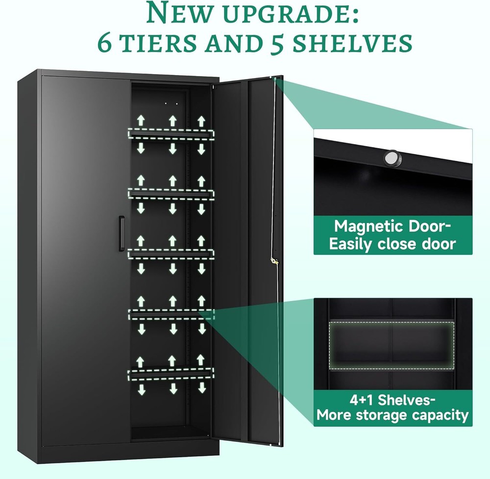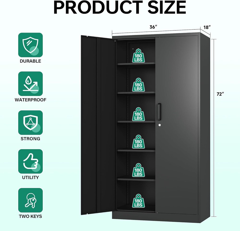 ** Only ships to Continental US; -Not ship to Alaska, Hawaii, Puerto Rico, U.S. Virgin Islands, American Samoa, Guam, Po Box/APO, etc ** - Metal Garage Storage Cabinets with Lock-72 Tall Tool Organizer Steel Lockers, 5 Adjustable Layers Shelves for Home,Office,Warehouse,Garage, - Size: 72 X 36 X 18 In(H X W X D) 『High-Quality Metal』: Letaya metal storage cabinet with whole-in-one reinforced heavy gauge steel deluxe welded frame, 2 locking doors are also strengthened by with additional steel bars, whole steel frame thickness up to 0.8 mm, rugged and not easily deformed, plate adopted environmentally powder coated finish, Moisture proof,capacity to resist corrosion and rust,Can be used for a long time. 『Large Storage Space』: Steel storage cabinets H72 * W36 * D18 inch , features 5 adjustable shelves, 6 floors in total, shelves can hold up to 180 lbs, which is very suitable for storing office documents supplies, garage tools or other large and heavy household items, ideal for long-term to use. 71-inch counter height perfect for use in homes, offices, garages, schools, shops, warehouses or other commercial spaces. 『Professional Design』: Metal cabinet adopts an upgraded version of the three-point lock system, and the steel rods are thickened to provide higher security for your valuables and important items;anti-collision reinforcements, keeping quiet while protecting when you opening or closing the door;Adjustable feet can ensure the balance of the metal cabinet in various environments;pre-holes on the back, enable to be mounted to the wall. 『Packaging Protection』: Letaya storage cabinet package uses a lots of foam and reinforced metal corners protect the edges from getting dented, to prevent damage to the panels during shipping.Of course, in the unfortunate event of an damage,please contact us in time for processing problem.(Note: ferrous metal corner guards are not part of the product) 『Assembly Instructions 』: Metal storage cabinets provide paper and video assembly instructions.