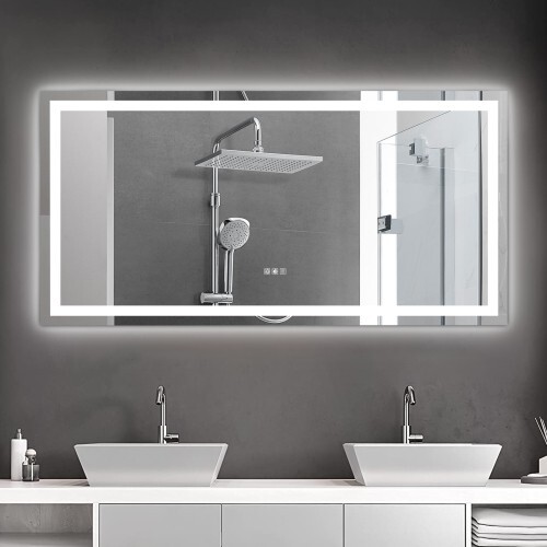 Description Lights & Super Bright: With built-in LED strip lights, LED lighted bathroom mirror gives out the lighting. The lighting mirrors are bright enough for makeup or shave or beauty care. Shatterproof & Corrosion Proof:Our mirror is made from stronger glass, that is armored glass. It will not get broken easily. Even it is broken, it will not shatter to piece, no harm, more safe to use. With epoxy coat, this mirror is corrosion proof. It will not get corroded after 30days acid test. Colors Changeable and Brightness Dimmable: This LED illuminated mirror is multifunctional. You can press the button to change the color temperatures: Warm(3000K), natural (4200K) and white(6400K). You can also dim the bright to your comfortable level. All these will be easily controlled by the touch button. The smart memory function will record the lighting setting and keep the previous lighting status after turning off and on. Easy to Install and Powered by Hard Wire Features Lights & Super Bright Colors Changeable and Brightness Dimmable Easy to Install and Powered by Hard Wire Press the button to change the color temperatures: Warm(3000K), natural (4200K) and white(6400K).