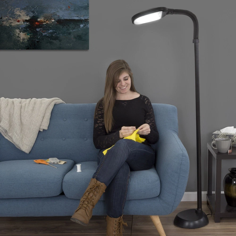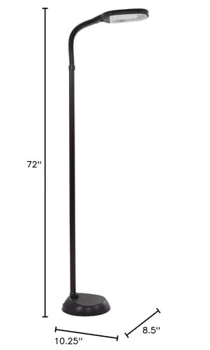 brings you form and function with the Natural Full Spectrum Sunlight Therapy Reading Floor Lamp that produces pure bright white illumination making colors appear more vibrant while reducing eye strain and fatigue. The supplied 27-Watt CFL Bulb gives as much light as an ordinary 150-Watt bulb, but uses far less energy. This bulb can last up to 5,000 hours, 5x longer than other bulbs. The flexible gooseneck design lets you adjust the lamp to any angle to direct light where you need it. Perfect for reading, working, or doing intricate craftwork. A must-have addition to your home or office, this lamp provides natural full spectrum daylight hues, brightening even rooms that have minimal sun exposure. IMPORTANT:Avoid buying counterfeit products and transacting with unauthorized sellers. Look for our logo on the packaging for every of our products. is committed to providing the consumer with the absolute best price and value on all our products, which we ensure by applying a rigorous Quality Control process. is a registered trademark protected by U.S. Trademark law and will be vigorously defended. MODERN FLOOR LAMP - This stylish standing lamp has a modern black finish with a matching 64-inch-long cord for versatile placement. The adjustable light has a simple rocker style on/off switch on the lamp head that is easy to use. IMITATES NATURAL LIGHT - Equipped with a PL-27W bulb with a 6400K color temperature, this lamp for living room projects bright natural light, helping to eliminate eye and fatigue, making it the perfect addition to your dorm room or office décor. ENERGY-SAVING - The included energy-saving replaceable bulb gives off about as much light as an ordinary 150W incandescent bulb while using less energy. The natural office lamp can also last up to 5,000 hours, so it won't have to be replaced as often. MULTI-DIRECTIONAL - The gooseneck arm on the bedroom lamp provides flexible height adjustment from 61.2-inches to 73.5-inches-tall when completely straight with unlimited angle choices, so it is simple to focus the light where you need it. PRODUCT DETAILS - Materials: Plastic and Metal. Dimensions: Straight Neck: (L) 10.2” x (W) 8.7” x (H) 73.5”; Angled at 90-Degrees: (H) 61.2”; Cord Length: 64”. Voltage: 120V. Sun Lamp Comes with PL-27W Bulb. Color: Black.