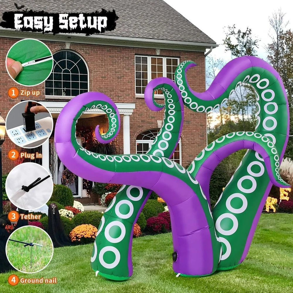 7.2FT Halloween Inflatable Octopus Outdoor Yard Decor w/ Built-In LED Lights About this item: Halloween Inflatable Octopus: The built-in bright LED light inflatable creates a wonder and magic atmosphere in the darkness, attention-grabbing; Perfect choice for halloween inflatable decoration, you can place it at your yard, garden, or entryway to decorate halloween Fast Inflate and Safe: Our Halloween blow up comes with Waterproof Powerful Blower; Just zip up and plug in, and the inflatable will Inflate to full within 1 minute automatically; The CE and UL standard safety-certified adapter with a 10 FT power cord means that you can safely place it anywhere in your home, yard, or garden Strong Materials: GOOSH Halloween blow up yard decorations are made of thickened, waterproof polyester material; Strong, which is against rips and tears; These inflatable Halloween decorations can still operate perfectly even in windy and rainy weather, ensuring that your outdoor space is filled with festive joy Easy to Use: Package included ground stakes, securing ropes, storage bags; Just attach ropes to stake and secure to the ground that the Halloween inflatables will stand firmly, no need to worry about it flying away in outdoors Safety First: Avoid inserting objects into the blower or decorations for safe and damage-free operation. Wish you have an unforgettable Halloween experience with GOOSH Halloween inflatables!