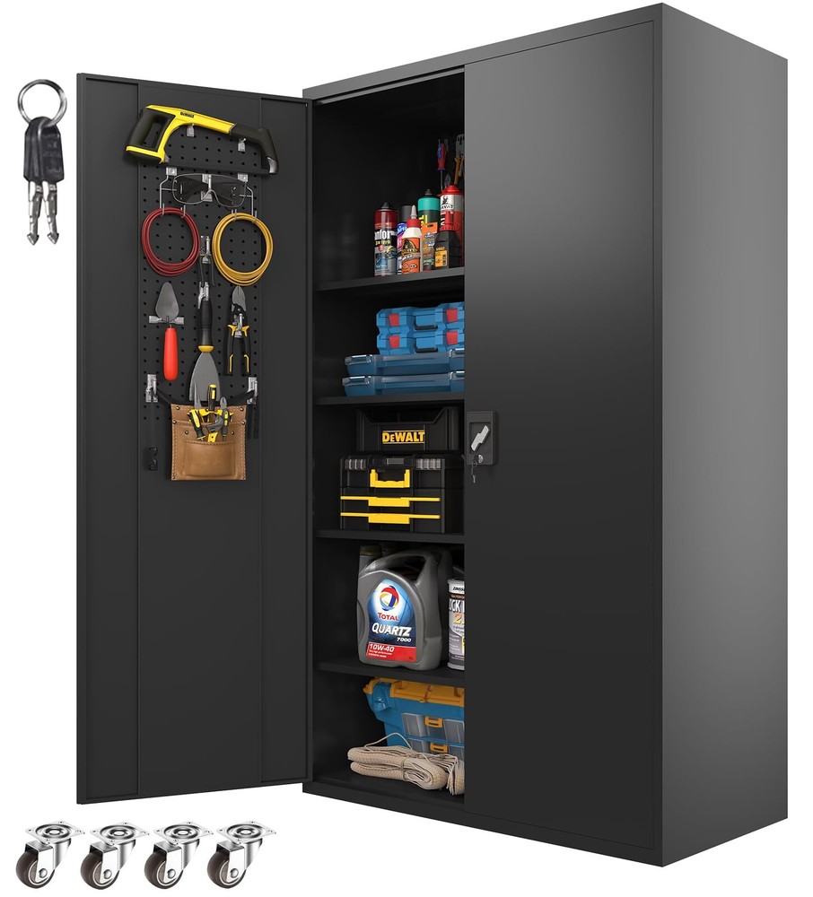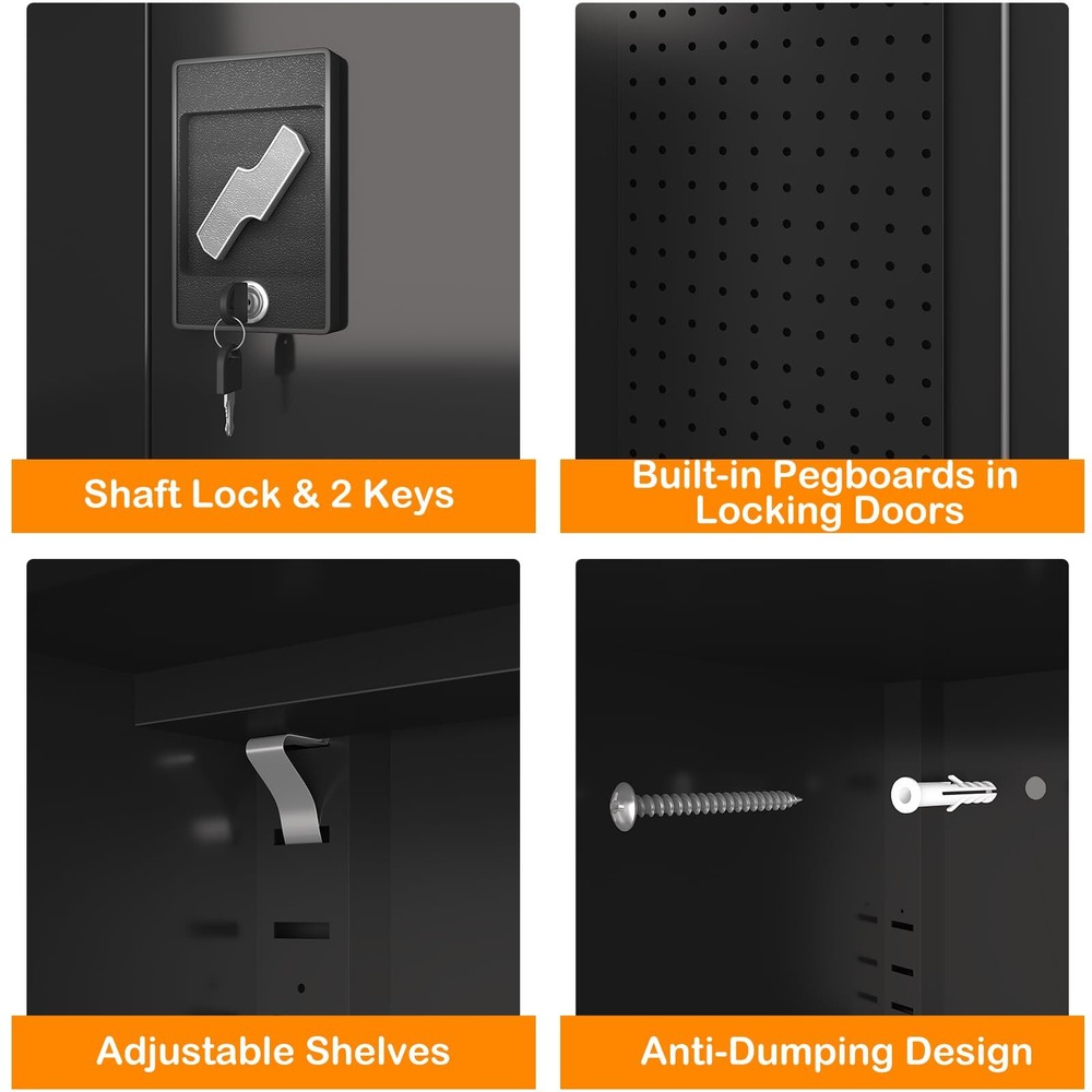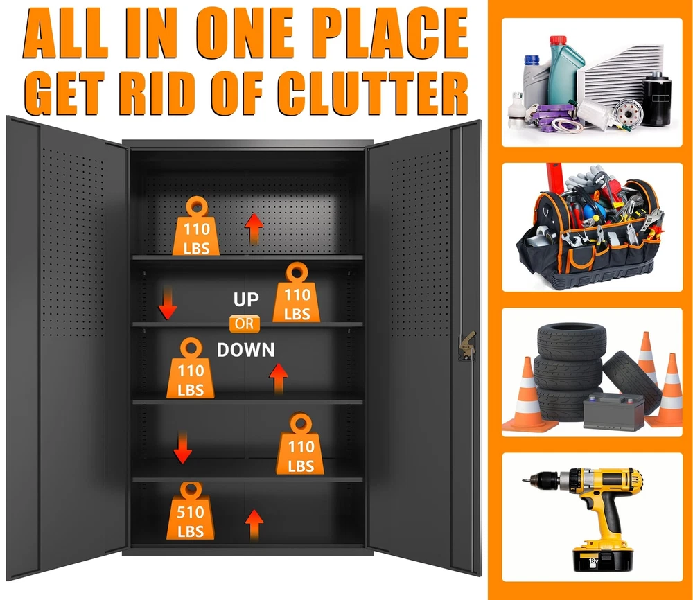 Upgraded Wide Metal Storage Cabinet - 72 Inch Black Lockable Garage Cabinet with 【HIGH CARBON HEAVY DUTY METAL】- Compared to other metal cabinet with carbon content 0.6%. Our metal storage cabinet with 0.75% carbon content is made of whole-in-one reinforced heavy duty metal construction and a corrosion and stain resistant powder coat, which can prevent rust and scratch. The steel storage cabinet can be used in garage, basement, kitchen, home office, classroom and laundry room, etc. 【5 COMPARTMENT FEATURING 4 ADJUSTABLE SHELVES】- 4 shelves with excellent load-bearing capacity guarantee maximum adaptability and convenience to meet your own unique storage and organization needs, holding up to 190lbs per shelf, 950 lbs in total, sturdy enough to store ammo, paint buckets, canned foods, file folders, etc. (Assembled Size: 70.86''H x 39.37''W x 19.69''D). 【DESIGNED PEGBOARD INCREASED FUNCTIONALITY】- SO CUSTOMIZABLE ! The extra pegboard could efficiently organize your small objects. It is neat and easy to find what you want. Furthermore, the pegboard of the lockable cabinet also can be removed and mounted to the wall. So this utility cabinet can be used in your home, office, garage, workshop, school, and more. The FOHUFO garage cabinets also come with pegboard on the doorsm, It can hang some tools. 【2 LOCKABLE SYSTEM AND DETACHABLE CASTERS】- This metal cabinet with a handle and a 3-point locking system with 2 keys to help keep files and important documents as well as your personal belongings safe. 4 detachable and lockable rubber wheels make this cabinet for storage with doors easy to move around. Easy and smooth to roll even fully loaded and not scratch your floors or leave any marks. 【EASY ASSEMBLE & FULL CUSTOMER SUPPORT】The package comes with detailed assembly instructions, easy to assemble and only a screwdriver is needed to complete the assembly. Please note that the screws cannot be tightened until the entire assembly is completed. replacement for installation problems, damaged and missing parts . Shipping We offer FREE shipping on all orders! We ship within Three business days of payment, usually sooner. We use a selection of shipping services such as UPS, FedEx, USPS etc. We only ship to the lower 48 states, no APO/FPO addresses or PO Boxes allowed. Local pickups and combined shipping options are not provided at this time. Return You can return a product for up to 30 days from the date you purchased it. Any product you return must be in the same condition you received it and in the original packaging. Please keep the receipt. Payment We accept payment by any of the following methods: PayPal Please pay as soon as possible after winning an auction, as that will allow us to post your item to you sooner! Feedback Customer satisfaction is very important to us. If you have any problem with your order, please contact us and we will do our best to make you satisfied. Contact Us If you have any queries, please contact us via ebay. We usually respond within 24 hours on weekdays. Please visit our eBay store to check out other items for sale! Thank you for shopping at our store.