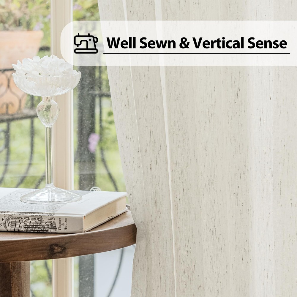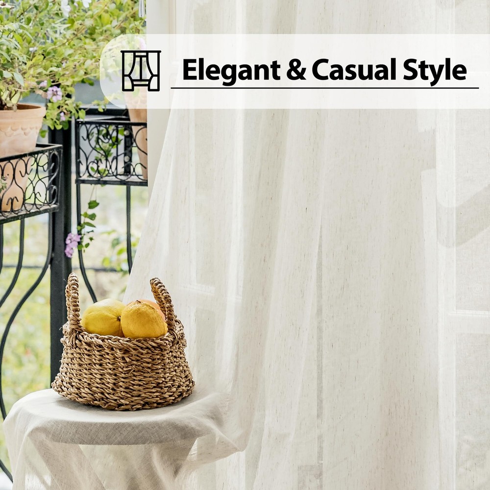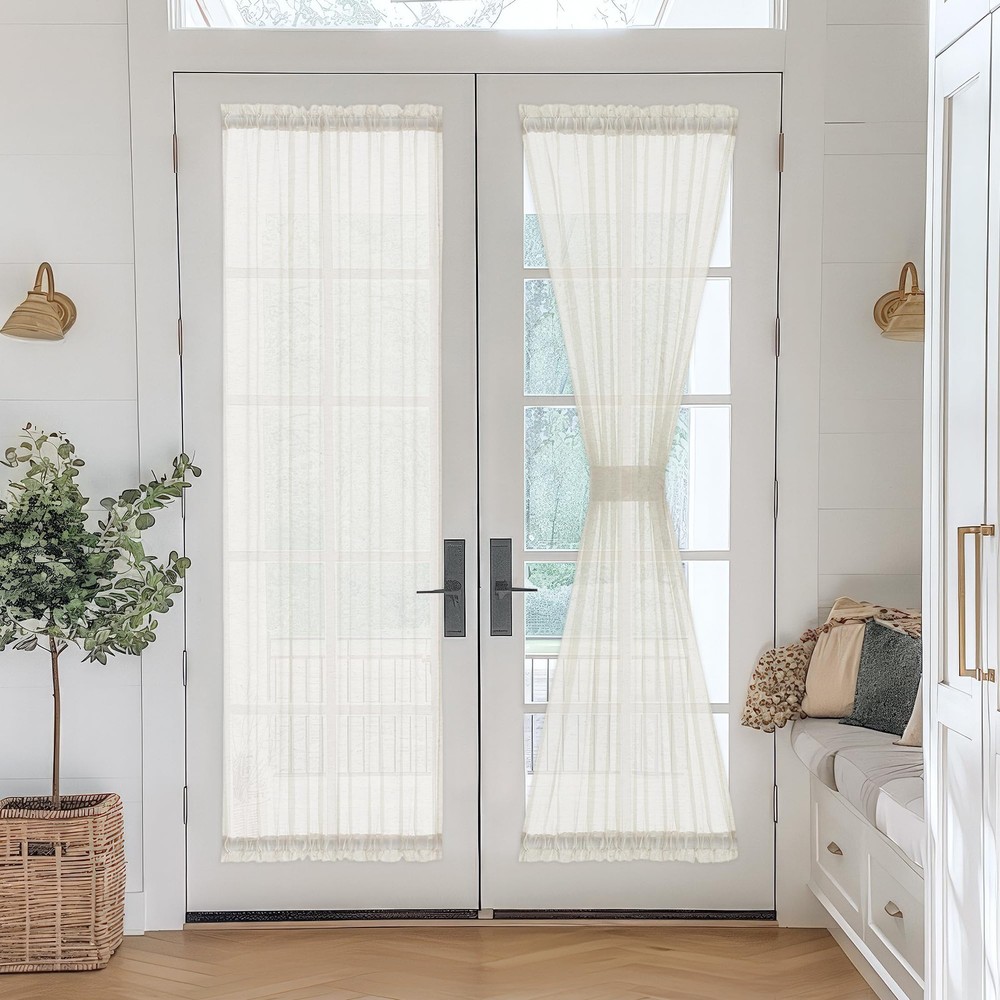 Want to create a slice of privacy but keep the light filtering through? You can’t miss these flax linen blend sheer door curtains ✅Light Filtering & Privacy Enhancing: Solid linen french door curtains diffuse harsh light from outside, give the entrance to your home more privacy and add elegance to your living space by easily hanging this curtain for your door. ✅Decorative and functional sheer french door panels: Control the amount of light in your space with an adjustable tieback, 3 press studs (adjustable length) to make it firm all the time and decorative appeal. This item features rod pockets construction to hang, 2-inch rod to make this curtain perfect for large French doors or windows. Made from 10% Linen blend fabric with guaranteeing long-lasting durability. Machine washable voile panels for easy care. ✅Package detail: 52”W by 72""L/Panel, 104”W by 72""L/Pair Measured from top of the upper rod pocket to the bottom of the lower rod pocket, exclusive of headers. Set of 2 Panels real solid flax linen sheer door curtains ✅More than door curtains: These linen curtains can be used as usual sheer curtains for general windows in the living room, kitchen, bedroom, office Notice: Due to the different screen display, the color of the actual item may vary slightly from the above images. Linen Door Curtains: Durable flax linen sheer door curtains add subtle Texture to Any Room. 2pcs french door panels, measures 52"W x 72"L/ Panel, 104"W x 72"L/ Pair Linen sheers. (Note: It is 72" L ong between the interior pockets.) Can be used on glass french doors or regular windows Stylish & Privacy: Real linen blend french door curtains create fresh & inviting atmosphere and light shines through while maintaining your privacy. With duo rod pocket design on top and bottom for easy installation. Gathered scalloped headers make it an elegant and nicer decoration. Bonus Matching Tie-backs: 2 tie back attached with press button to wrap around the center. 3 adjustable options to softly filter light in and get just the right amount of sunlight. Light Filtering: These faux linen curtains are crafted with a semi-sheer fabric that gently filters natural light, allowing a soft glow to fill your room. Enjoy a bright and airy atmosphere while maintaining a sense of privacy. Easy care: Made from machine washable polyester for easy care. Durable fabric promises long lasting quality. Machine wash with cold water, no chlorine bleach, and hang to dry. Custom sizes are available, please feel free to contact us.
