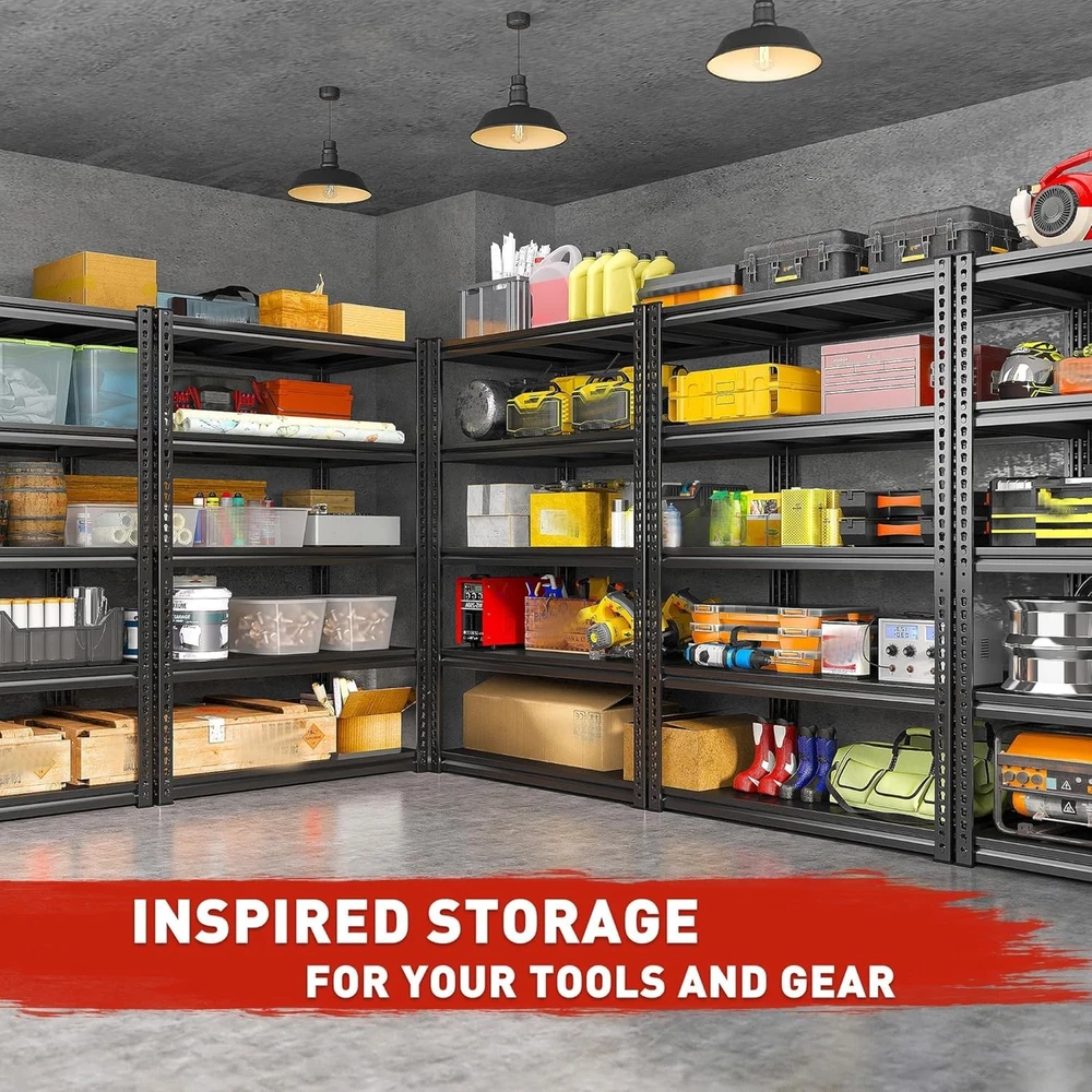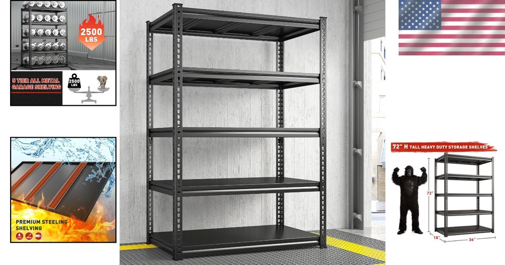 Weight Limit: 2500 Pounds Finish: Powder Coated Back Style: Backless Mounting: Free Standing Shape: Rectangle Product Dimensions: 18"d X 36"w X 72"h Shelf Thickness: 1 Inches Min. Required Door Width: 36 Inches Item Height: Garage Shelving Unit Number of Drawers: 0 Capacity: 2500 Lbs Unit Count: 5.0 Count Number of Items in Set: 1 Finish Type: Powder Coated Item Width: Garage Shelving Unit Room Type: Shop, Warehouse, Garage, Kitchen, Basement Recommended Uses For Product: Garage, Kitchen Suitable For: Indoor Number of Shelves: 5 Weight Capacity: Maximum Weight: 2500 Pounds Furniture Finish: Powder Coated Type: Storage Unit Material: Metal, Steel Number of Compartments: 0 Age Range (description): Adult Brand: Unbranded Item Length: Garage Shelving Unit Size: 72" H x 36" W x 18" D Style: Modern Item Weight: 38.6 lb Product Care Instructions: Wipe With Dry Cloth Product Name: Heavy Duty Garage Shelving Room: Garage, Kitchen, Basement, Living Room, Bedroom, Warehouse, Shop, Workplace Installation Type: Freestanding Number in Pack: 1 Care Instructions: Wipe with Dry Cloth gtin13: Does not apply UPC: Does not apply Color: Black Number Of Items: 1