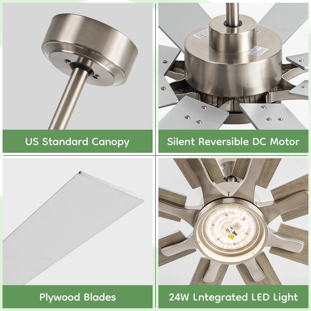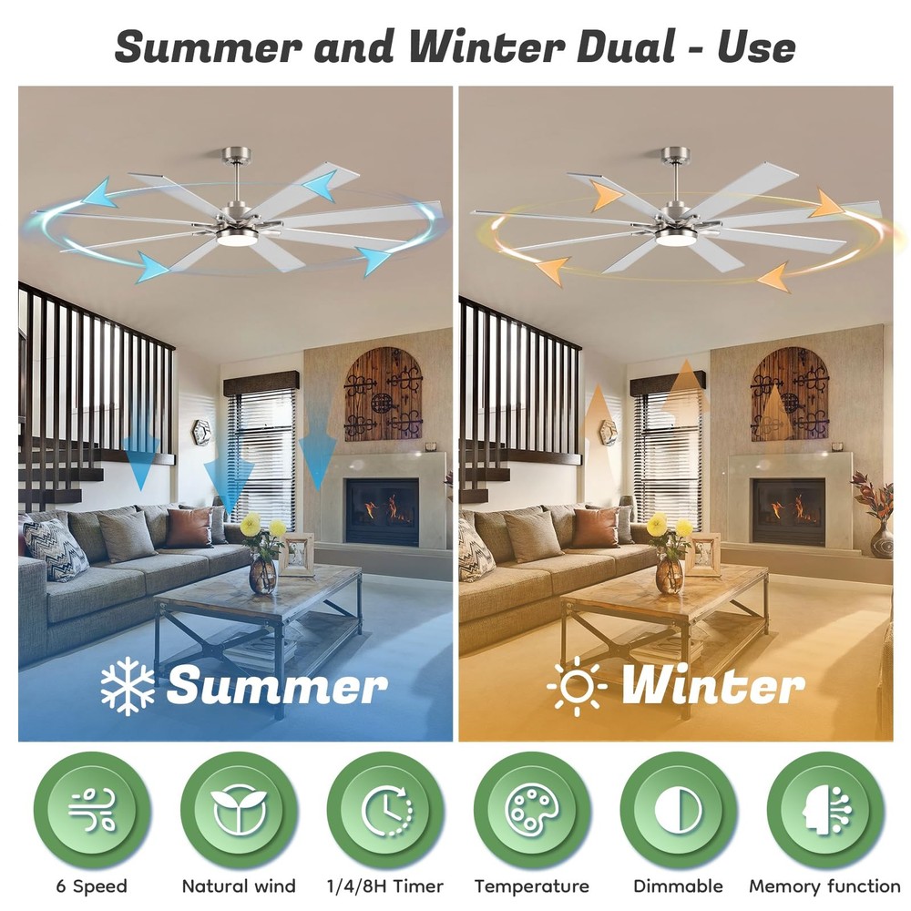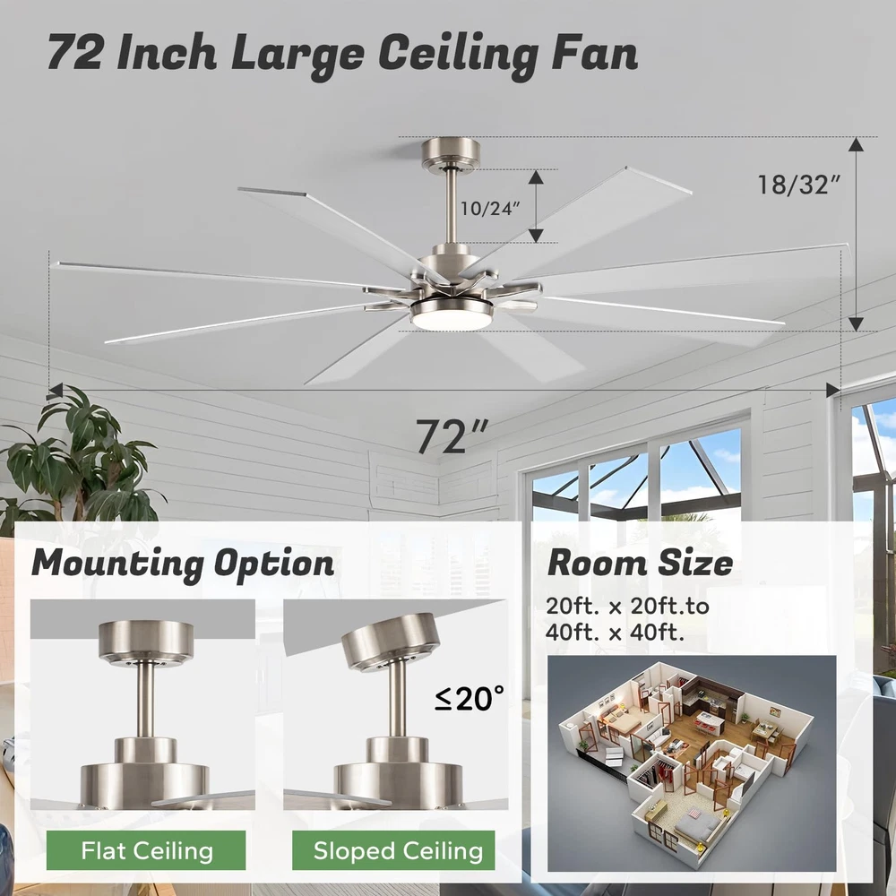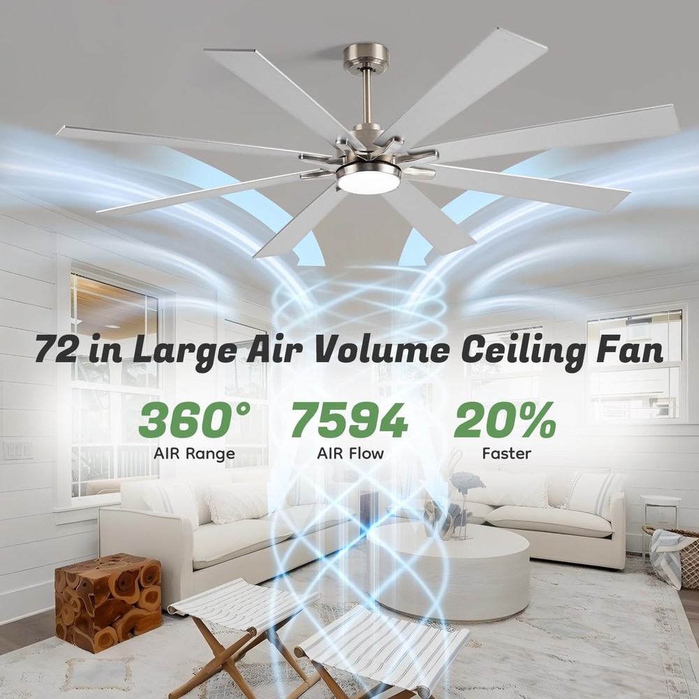 Experience superior air circulation and ambient lighting with this 72-inch ceiling fan, perfect for large indoor and outdoor spaces. Featuring a modern industrial design with 8 dual-finish blades and a powerful DC motor, this fan delivers exceptional performance while adding a stylish touch. The included light with 5CCT (Correlated Color Temperature) settings allows you to customize the ambiance, ranging from warm to cool white. Easily control the fan speed and light settings with the convenient remote control. Rated for damp locations, this versatile fan is suitable for bedrooms, living areas, patios, gazebos, porches, and even garages. With its large size and impressive airflow, this ceiling fan ensures optimal comfort and energy efficiency in expansive rooms or open-air environments. 72 INCH MODERN CEILING FAN: This big ceiling fan with light includes 10”, and 24“ down rods, making it a versatile choice for both low and high ceilings (12-32 inches high). Its stylish fan blades feature a sleek dual-color design in silver and light oak, perfectly blending industrial and modern styles. With 8 fan blades, the ceiling fan light offers a cost-effective and eye-catching solution, replacing the need for multiple smaller ceiling fans. Ideal for living room, garage, barn, or covered patio DIMMABLE & 3 COLOR-TEMPERATURES: This farmhouse ceiling fan with light uses an LED light (24W,2200LM )to provide brightness while saving 75% energy compared to traditional lamps. It offers 5 available color temperatures (2700K, 3000K, 4000K, 5000K and 6500K). The wet rated outdoor ceiling fan's remote control allows you to adjust the brightness from 10% to 100% HIGH CFM REVERSIBLE CEILING FAN: Brushed nickel ceiling fan has six speeds to choose from to meet your multiple airflow needs. In the summer, forward mode circulates air downward to cool you with a large ceiling fan with over 7594 CFM. In the winter, the reverse mode circulates air upward so that the warm air produced by your indoor heating unit is evenly distributed throughout the room.You can use it all year round. Complete control and comfort all year round CONVENIENT MULTI-FUNCTION REMOTE:The remote can be set to mute without any beeping, ensuring quiet convenience without disturbing your family. You can easily control 4 key features with the remote: 6 wind speeds ♮ breeze, reversible mode, 1/4/8-hour timer, Dimmable light, providing remarkable convenience SILENT DC MOTOR: industrial ceiling fan's DC inverter motor adopts thickened silicon steel sheets, thickened copper wires, and precision double bearings, which can more accurately control the airflow and motor surface temperature. Not only does it have a long service life, but it is also very quiet(noise level≦ 30db). Moreover, the energy-saving DC motor ensures eco-friendly operation, providing 75% more energy efficiency compared to traditional AC motors. Enjoy top-notch performance while saving energy OUTSTANDING CUSTOMER SUPPORT: : At we prioritize your 100% shopping satisfaction. This LED Ceiling Fan includes clear installation instructions and is backed by a 2-year customer support. If you have any questions or concerns. We're here to help. (Tip: Find our ceiling fans from your order and click on the Customer Support button)