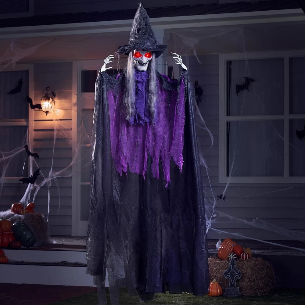 JOYIN 72” Halloween Animated Hanging Talking Witch with Light-up Eyes, Creepy Sound, Sound-Activated Hanging Witch for Halloween Indoor Outdoor Decorations, Haunted House Prop, Yard, Lawn Decorations REALISTIC HALLOWEEN DECOR: Our animated talking witch features a realistic appearance that is sure to impress your guests. With intricate details, such as flowing grayish-white hair that cascades down her back. The witch's eerie face is full of wrinkles, giving her a truly menacing look. To add to the scare factor, her hands are fully adjustable and move in a spooky way. The figurine is completed with a classic witch costume, featuring the traditional colors of black and purple. EASY TO USE: Hanging this Creepy Purple Witch decorations from trees, windows, ceiling, porch or doorways to create a spooky atmosphere at your house to scare your guests. This animated sound-activated talking witch decoration requires 3AAA batteries (not included). With this product, you can bring the spooky season to life in your home or office, and add a touch of eerie charm to any space. ENDLESS FUN: Bring surprise and delight to trick-or-treaters with our detailed Tall Witch Halloween Decor. This dark and creepy villain floats around in a very terrifying aura making it the perfect addition to your Halloween decorations. Perfect to be hung for Perfect for Halloween Outdoor, Lawn, Yard, Patio Decoration, Halloween Haunted House Decorations Halloween tree, window, yard, porch, doorway, haunted house, Halloween party decor, Halloween outdoor decoration DURABLE MATERIAL: Made from high-quality plastic and fabric, these decorations are durable and safe. Our animatronic hanging witch decoration is designed to last for many Halloweens to come. Scare Your Guests: The Halloween hanging witch decor is the perfect way to scare your guests and give them a Halloween they won't forget. It's a fun and unique way to add some extra spookiness to your Halloween home decorations!