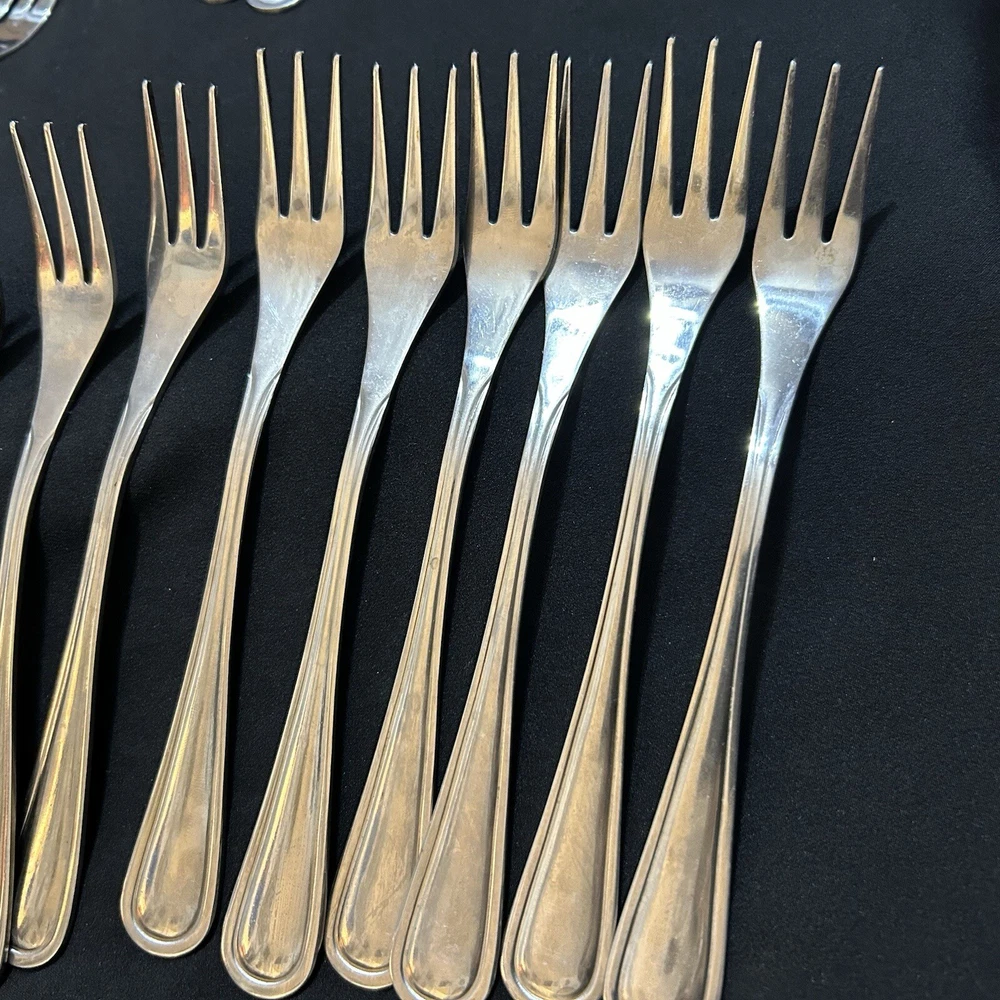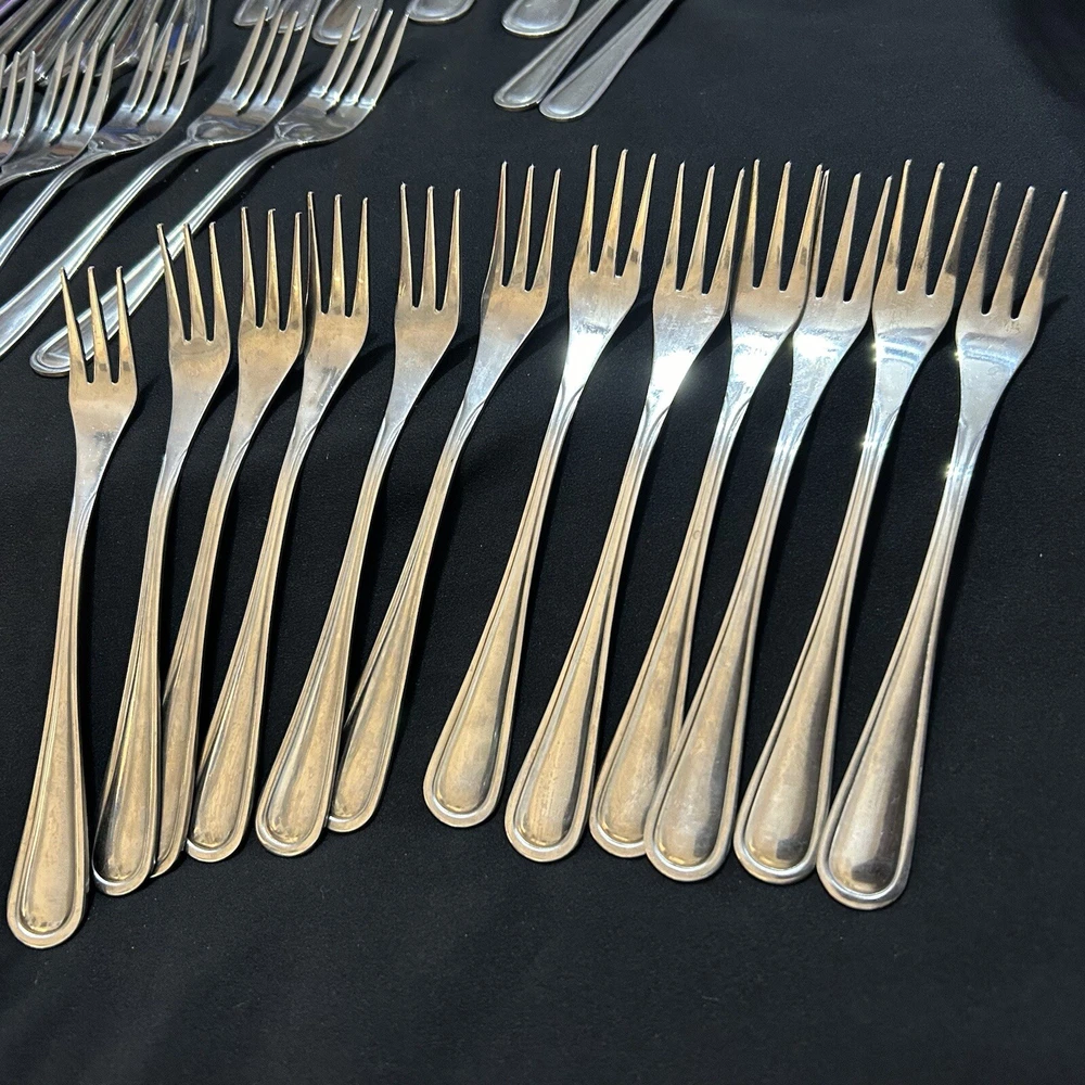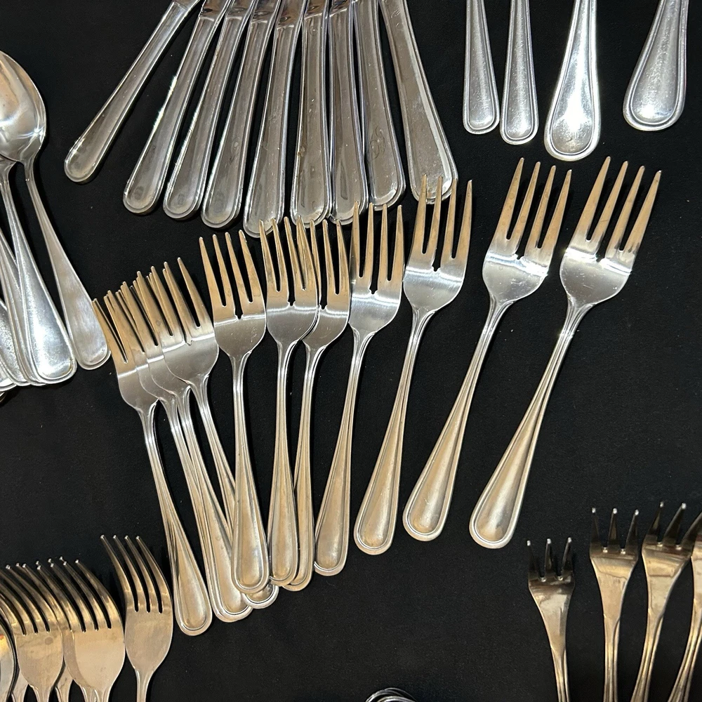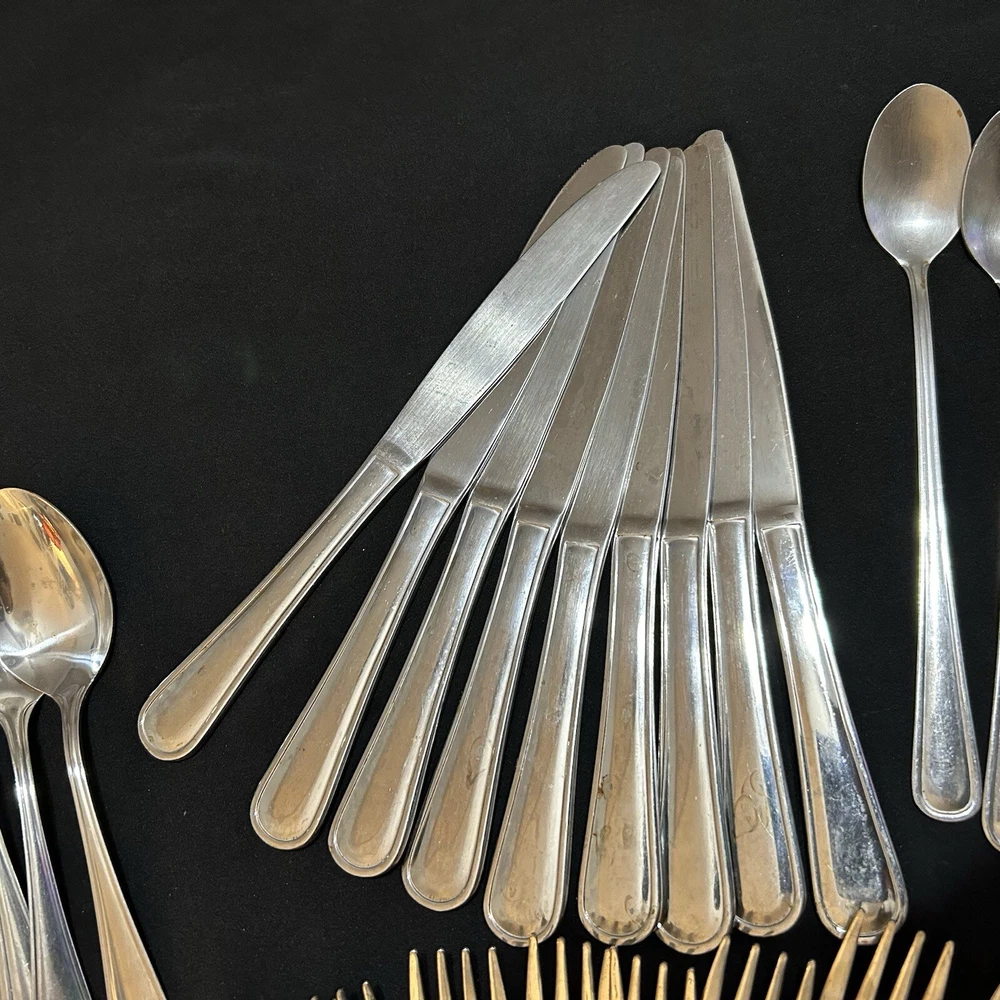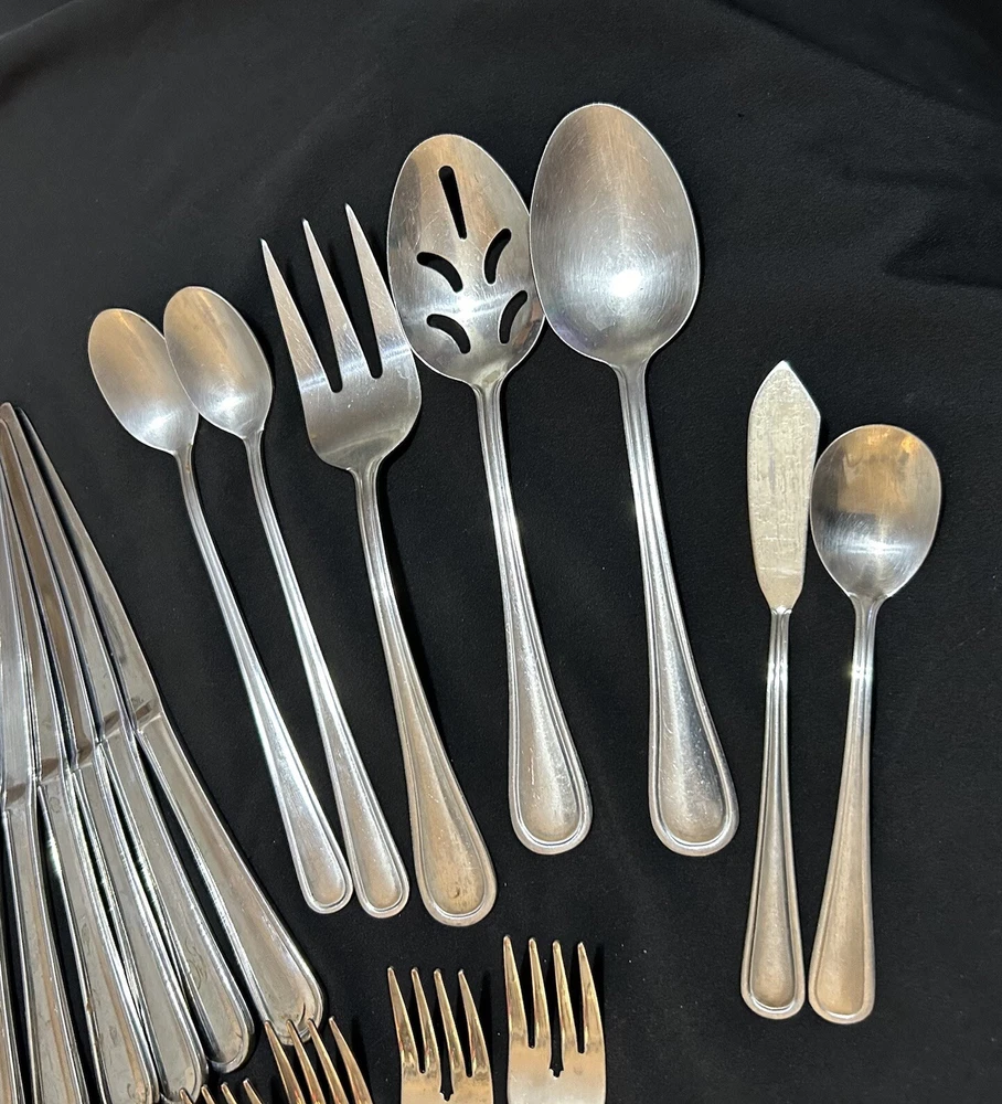 71pc Gibson Stainless Classic Dinner & Serving Hostess Set Forks Knives Spoons 12 Teaspoons 10 Dinner knives 12 Salad forks 9 Dinner forks 10 Dinner spoons 12 Cocktail forks 2 ice tea spoons 5pc Serving set Good vintage condition . Normal signs of wear and tear, Minor scratches, and some discolorations. Please study pictures carefully before purchasing Feel free ti ask any questions. Thank you for visiting our store! Bag70A