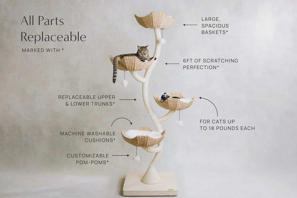 Product Dimensions 37"L x 23"W x 73"H Breed Recommendation Large Breeds Specific Uses For Product Active, Weaning, Teeth, Joints, Weight Recommended Uses For Product Indoor Material Wood, Metal, Sisal FOR LARGE CATS WEIGHING UP TO 18 POUNDS: This beautiful piece of modern cat furniture is meant to hold cats weighing up to 18 pounds or even multiple cats! Its quality materials are extremely sturdy and meant to last for years to come. You can rest assured knowing this tree can fit some of the largest cats out there with no issues whatsoever. EASY TO CLEAN: The cushions are MACHINE WASHABLE (and replaceable with a variety of different colors) and the rest of the tree can easily be vacuumed or cleaned with a dry foam cleaner. MADE TO LAST & ENDLESS SUPPORT: These trees are extremely high quality and made to last for years to come. You’ll always be able to keep your cat tree looking new because replacement parts can be purchased for ANY part on the tree. BEAUTIFUL & UNIQUE DESIGN: Unlike most cat furniture, this rope and wicker cat tree tower will enhance the look of your home. It includes over 73” of scratching area where your kitties can have fun and climb, along with four beautifully crafted, hand-woven wicker baskets containing comfortable cushions (removable and machine washable). It is perfect for your kitty to have a glorious time napping while you can enjoy looking at a beautiful piece of art that adds to the aesthetics of your home.