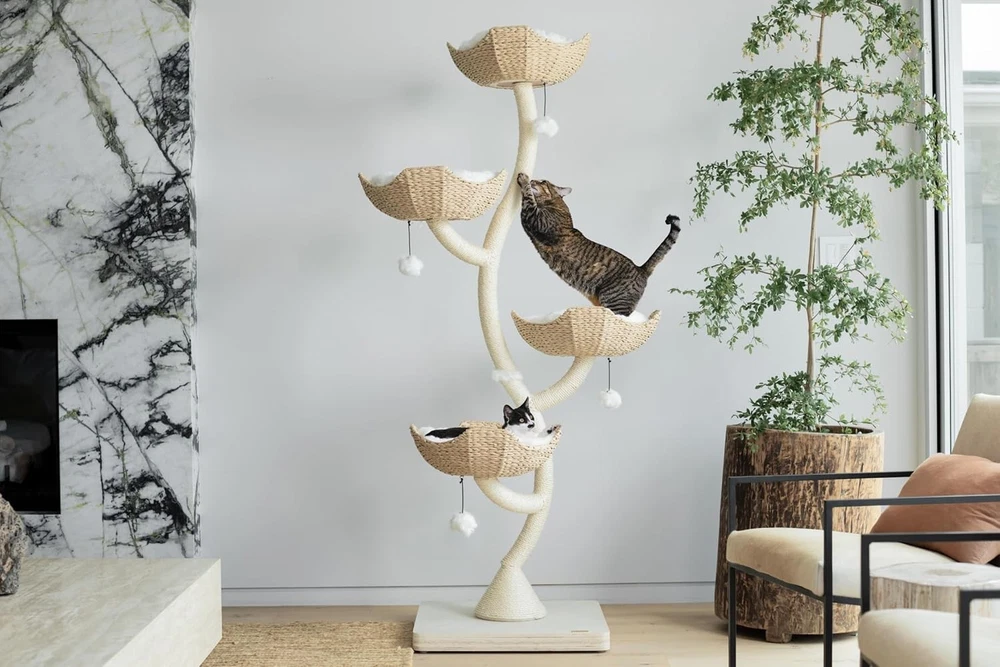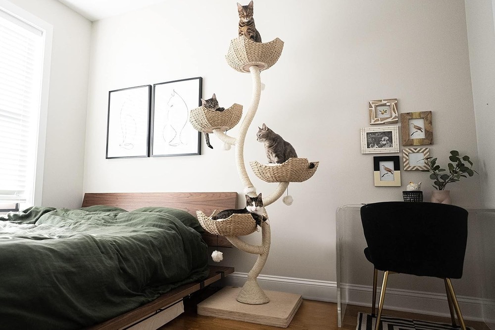 This cat tree is a game-changer for big cats! The sturdy wood and sisal construction holds up perfectly, even with my 16-pound Maine Coon jumping all over it. The multiple levels and scratching posts keep him entertained for hours, and the modern design blends seamlessly with my home decor. It’s super stable, easy to assemble, and built to last—worth every penny for active large breeds!