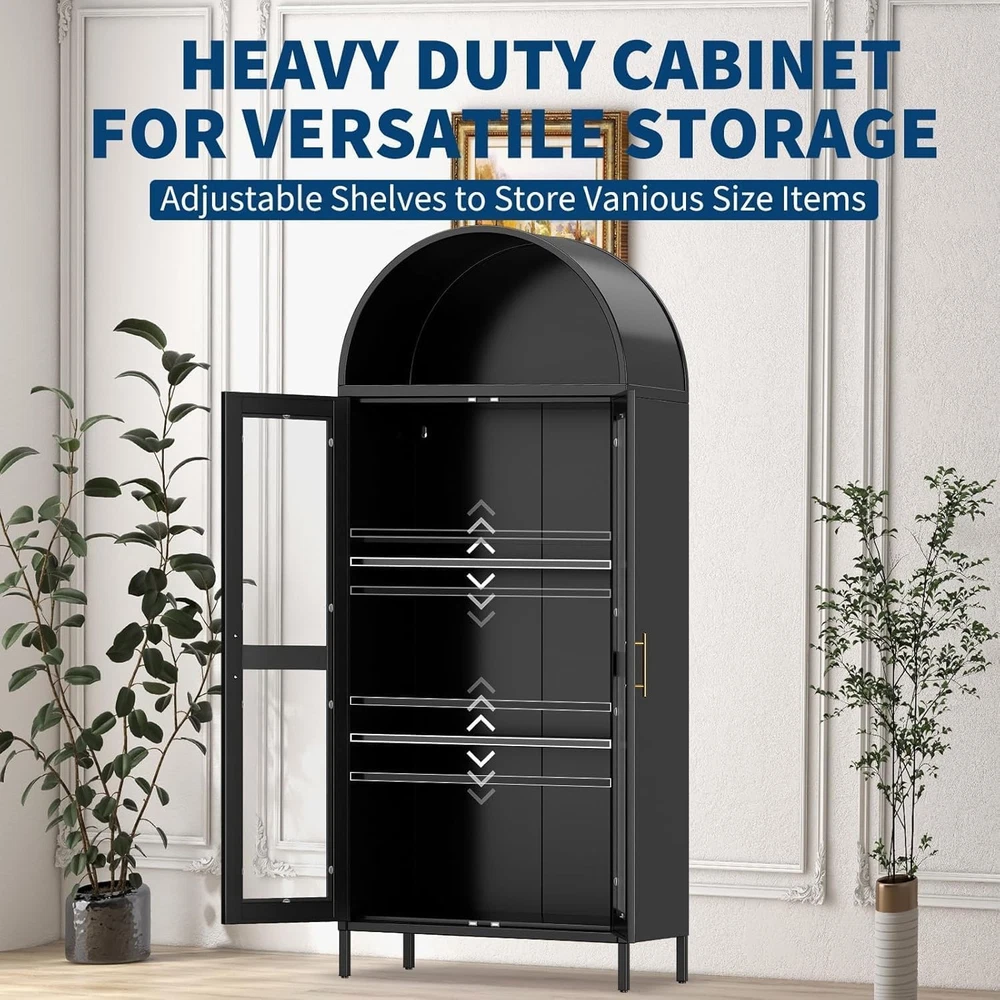 Product Description About this item Stylish Modern Farmhouse Design - Elevate your decor with this 73" arched storage cabinet featuring a striking metal frame and tempered glass doors. The timeless black finish and graceful arch silhouette blend rustic charm with contemporary elegance, seamlessly enhancing living rooms, dining areas, or entryways. Spacious & Customizable Storage - Maximize organization with 73" of vertical storage space. Two adjustable shelves and a smooth-gliding drawer accommodate pantry staples, books, collectibles, or decor. Reconfigure layouts effortlessly to suit evolving needs while keeping items tidy and visible. Premium Durability, Built to Last - Crafted with heavy-duty metal steel construction, this cabinet withstands daily use while maintaining stability. Shatter-resistant glass doors protect contents without obscuring displays, ensuring both practicality and lasting aesthetic appeal. Multi-Functional Versatility - Transition effortlessly between roles: pantry cabinet, bookcase, china display, or home office organizer. Perfect for kitchens, bedrooms, reading nooks, or workspaces—its adaptable design solves storage challenges across your home. Hassle-Free Assembly & Support - Quickly assemble with clearly labeled parts and intuitive instructions. Backed by responsive customer service for guidance or replacement needs, ensuring your complete satisfaction from unboxing to everyday use. On Aug 14, 2025 at 00:57:19 PDT, seller added the following information:
