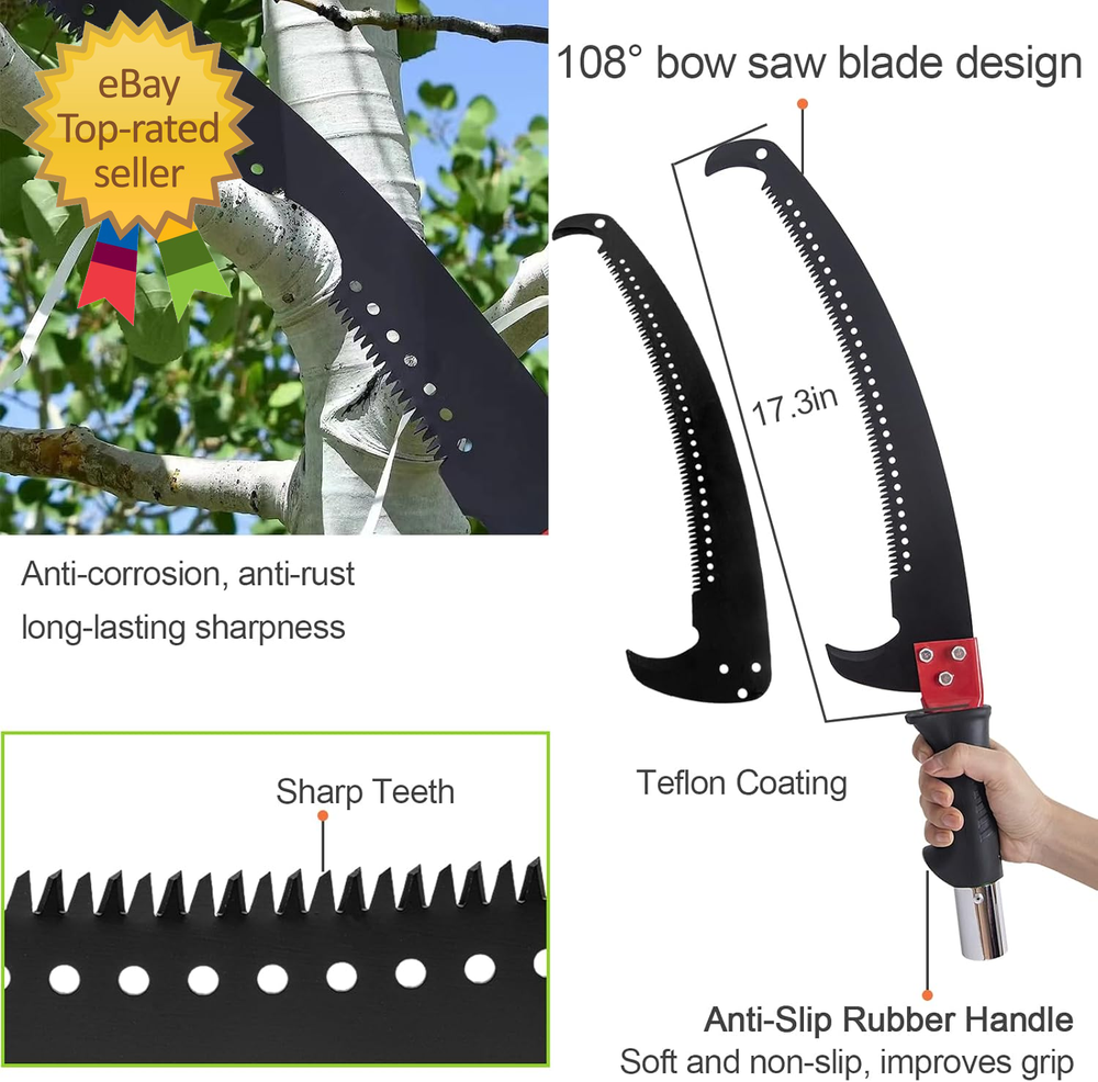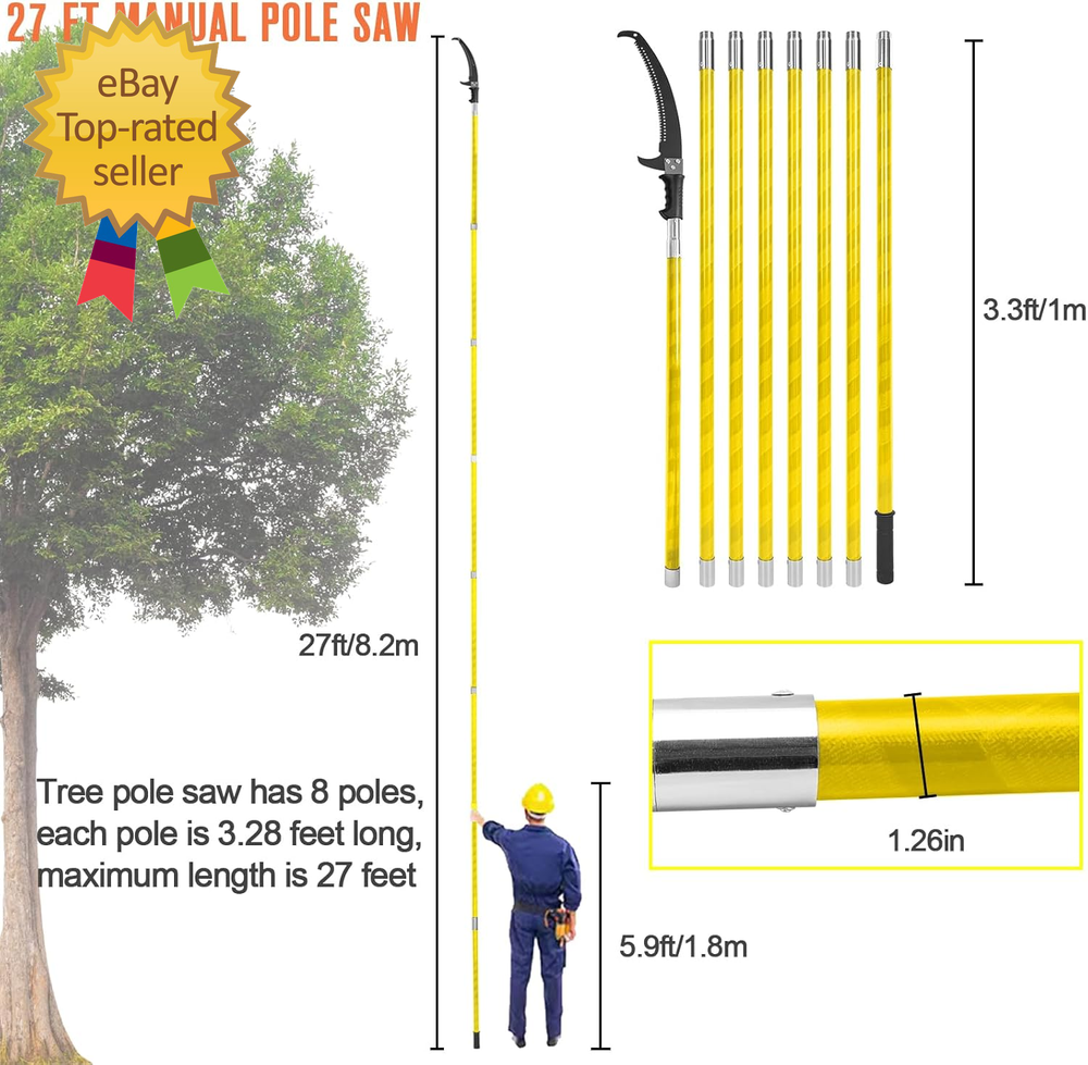 Store New Arrivals Add to Favorite View Feedback Contact Pole Saws for Tree Trimming, 7.3-27 Ft Tree Pruner Manual Pole Saw, Extendable L Description Item model number Pole Saws for Tree Trimming Batteries Required? No Power Source manual Included Components 1 x Saw Sleeve, 1 x PE Bag, 8 x Poles, 1 x Extra Double-Hook Saw Country of Origin China Warranty Type Limited Warranty Item Weight 15.67 pounds Surface Recommendation Fiberglass Handle Material Fiberglass Batteries Included? No Blade Shape Rectangular Blade Length 27 Inches Blade Material Carbon Steel Special Features Dual Systems Number of Teeth 120 Special Feature Dual Systems Product Dimensions 1.26"L x 1.26"W x 324"H 【Pole Saws for Tree Trimming】This tree pruner pole saw is designed for easy tree trimming. With its strong toughness and sharpness, it can effortlessly cut through branches. Suitable for palm trees, pine, fir and oak and more. This manual pole saw is widely used in lawns, gardens, forestry and other places where trees need to be trimmed. You can also easily trim high and hard-to-reach branches without bending down, climbing a ladder, and avoiding the dangers of working at heights. 【Spring-Action Pruning Jaws and Hacksaw Head】 Ideal for shearing smaller branches, the pulley-operated spring-action pruning jaws are made of hardened carbon steel. The high-strength alloy hacksaw head, after high-temperature heat treatment, features sharper grinding teeth on three sides for smoother cutting, making it very suitable for sawing thicker branches. 【Extendable Pole Saw】 The tree pole saw has 8 poles of 3.28 feet each, with a maximum length of 27ft, this extendable tree trimmer allows you to reach higher branches without the need for a ladder. It provides convenience and safety during tree trimming. 【Durable and Sturdy】 The long branch trimmer blade is crafted from rust-proof and long-lasting 0.05" / 1.2 mm thick carbon steel. The epoxy resin pole is lightweight and durable. Corrosion resistance, strong bearing capacity, and good insulation performance. It ensures long-lasting performance and can withstand tough tree trimming jobs. 【Easy Assembly】 The tree pole pruner is easy to assemble, the pole connection is threaded structure, easy to install and remove. Palm tree trimmer comes with a sturdy nylon bag for easy portability. Buy with confidence. We provide 90 days warranty service, if you have any questions, please feel free to contact us via email. We will solve it for you within 24 hours. 27 Foot Extendable Tree Trimmer Parameters: Blade Material: Alloy steel Pole Material: Epoxy resin Max Length: 27 Foot Package Included: 1x Saw Blade with Handle 2x Backup Saw Blade 1x Base Pole with Handle 6x Epoxy Resin Poles 1x Saw Sleeve 1x Pruning Jaws 1x Canvas Bag for Pole Saws Extendable Design: Featuring an extendable design, this manual pole saw can reach heights of up to 26ft, allowing you to trim high branches without the need for a ladder. This not only saves you time but also ensures your safety during tree trimming. High Quality Steel: Durability is a key feature of our pole saw. Crafted with high-quality materials, it is built to last. The strong toughness and sharpness of the blade ensure precise cuts every time. Rest assured, this manual branches pruner is not easy to deform or fracture, making it a reliable choice for all your tree trimming needs. Wide Range of Applications: With its strong toughness and sharpness, this long branch trimmer is designed to make tree trimming a breeze. Whether you have palm trees, long branches, or need to prune your trees regularly, this extendable tree trimmer has got you covered. Long handle pruner ideal for pruning, trimming leaves at forestry, lawn, garden and other place that needs to trim the branches and leaves. Double Systems: Tree tree pole pruner is equipped with two systems,Scissor head and saw blade head can be easily switched as required. Safe and Stable: Strong bearing capacity and good stability of aluminum alloy interface. Easy to Carry: Palm tree trimmer kit comes in a canvas bag for easy carrying and moving. Easy to Install: Assembly is a breeze with this pole saws for tree trimming. It is designed with ease of use in mind, allowing both beginners and experienced users to set it up quickly. ABOUT US We offer the best prices around on high quality products. Our E-store includes media such as books, movies, music and games while offering electronics, toys, sporting apparel, clothing, tools, general home, garden items and more. SHIPPING We are always working hard to ensure your package arrives as soon as possible. Please understand that some factors like weather, high postal traffic, and the performance of shipping companies are outside of our control. We offer free shipping to the lower 48 states and ship within 2 business days of payment, usually sooner. We do not accept P.O. Boxes. Please provide a physical address. For shipping outside of the continental USA, we only use eBay's Global Shipping Program. The item is shipped to IL and then sent to the rest of the world. International customers are responsible for all duties and taxes. Continue to 'check out' to calculate costs for shipping the item to your country. Messages regarding eBay's Global Shipping Program MUST be directed at eBay EXCLUSIVELY. RETURNS We do not accept returns under normal circumstances. However, we will gladly consider a return if the item is received broken or if the wrong size is sent to you. In all other cases, returns will not be accepted. CUSTOMER SATISFACTION We try our very best to make sure every customer is completely satisfied. If there's a problem, message us! We're happy to help.