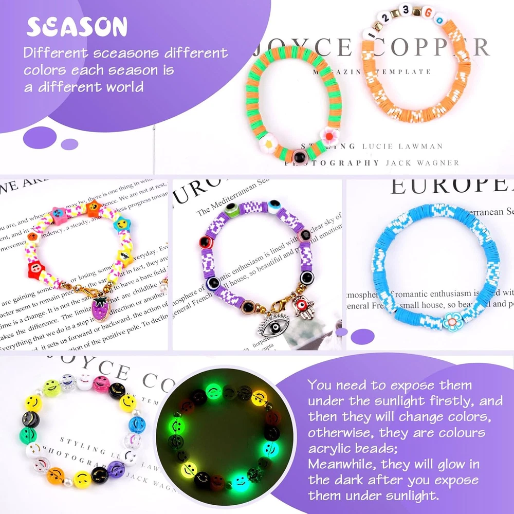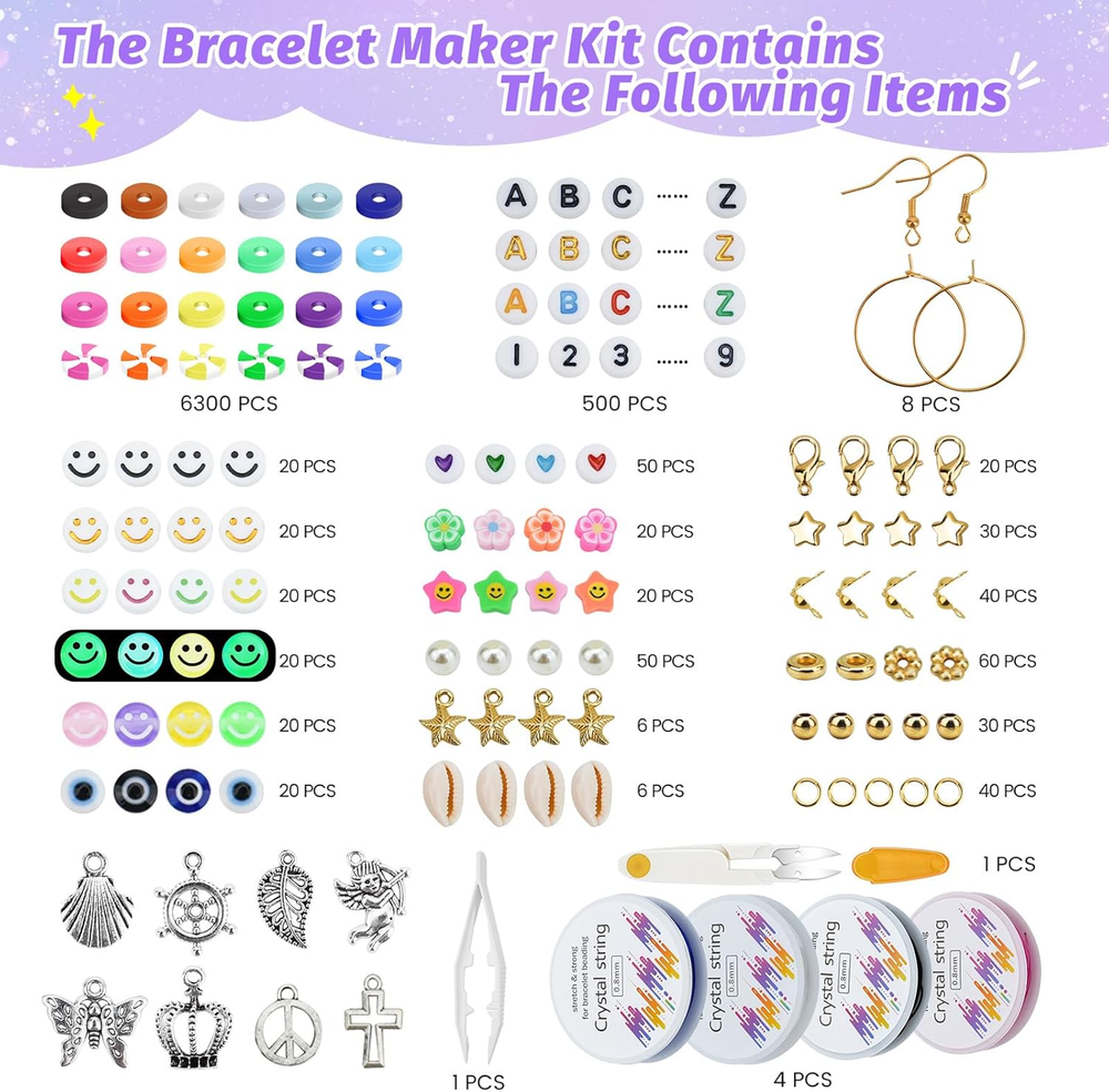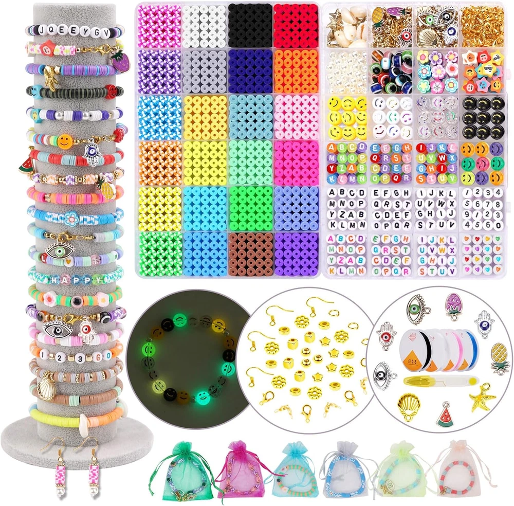 ใ€๐๐ž๐š๐๐ฌ & ๐๐ž๐š๐ ๐€๐ฌ๐ฌ๐จ๐ซ๐ญ๐ฆ๐ž๐ง๐ญ๐ฌใ€‘: 6300pc clay flat beads, 450pc alphabet beads, 100pc happy face beads, 20pc expression beads, 20pc eye beads, 20pc flower beads, 50pc love beads,50pc number beads, 50pc pearl beads, 30pc gold spacer beads, 30pc star beads, 40pc crimp beads, 40pc jump loop, 30pc gold flat beads, 30pc gold flower beads, 30pc gold round beads, 20pc lobster clasp, 6pc Shell beads, 8pc random charms, 6pc starfish pendant, 6pc ear hook, 4roll colored strings, a scissors. ใ€๐๐ซ๐ž๐ฆ๐ข๐ฎ๐ฆ ๐๐ฎ๐š๐ฅ๐ข๐ญ๐ฒ, ๐’๐š๐Ÿ๐žใ€‘: Clay beads with smiley beads kit are made of PVC craft environmentally friendly materials, the beads are light in weight and soft, are not easy to fade, safe and environmentally friendly, non-toxic and pollution-free, Suitable for beachใ€surfers etc wear. ใ€๐๐ž๐š๐๐ฌ ๐Ÿ๐จ๐ซ ๐ƒ๐ข๐ฒ ๐๐ซ๐š๐œ๐ž๐ฅ๐žใ€‘: Many colors heishi beads for jewelry making support you to make many different types of bracelets or necklace. You can easily make a trendy bracelet, no skills are needed, just an idea needed! ใ€๐๐ฅ๐ข๐œ๐š๐ญ๐ข๐จ๐ง ๐Ÿ๐จ๐ซ ๐–๐ข๐๐žใ€‘: Trendy polymer clay beads kit help keep kids away from video games, improve their creativity, imagination, color perception, hands-on ability, concentration. which is a cute gift for your children, friends, family and yourself. ใ€๐‘๐ข๐ฌ๐ค-๐…๐ซ๐ž๐ž ๐๐ฎ๐ซ๐œ๐ก๐š๐ฌ๐žใ€‘: JQEEYGV committed to provide unique luxurious quality and affordably-priced jewelry. Customer completely satisfaction is very important to us. If you find any problem of our bulk pack aesthetic beads, please feel free to contact us. We promise to give you a satisfactory solution within 24 hours! Product Description JQEEYGV BRACELET MAKING KIT Add to Cart Add to Cart Add to Cart Add to Cart Customer Reviews 4.6 out of 5 stars 1,250 4.6 out of 5 stars 1,250 4.6 out of 5 stars 1,250 4.6 out of 5 stars 217 โ€” Price $12.99 $ 12 . 99 $7.99 $ 7 . 99 $16.99 $ 16 . 99 $17.99 $ 17 . 99 โ€” Quantity 7300 PCS 5500 PCS 11000 PCS 3380 PCS โ€” Colour 24color 24color 48color 12color โ€” Letter โœ” โœ” โœ” ร— โ€” Box 2Box 1Box 3Box 1Box โ€” Size 6mm 6mm 6mm 3mm โ€”