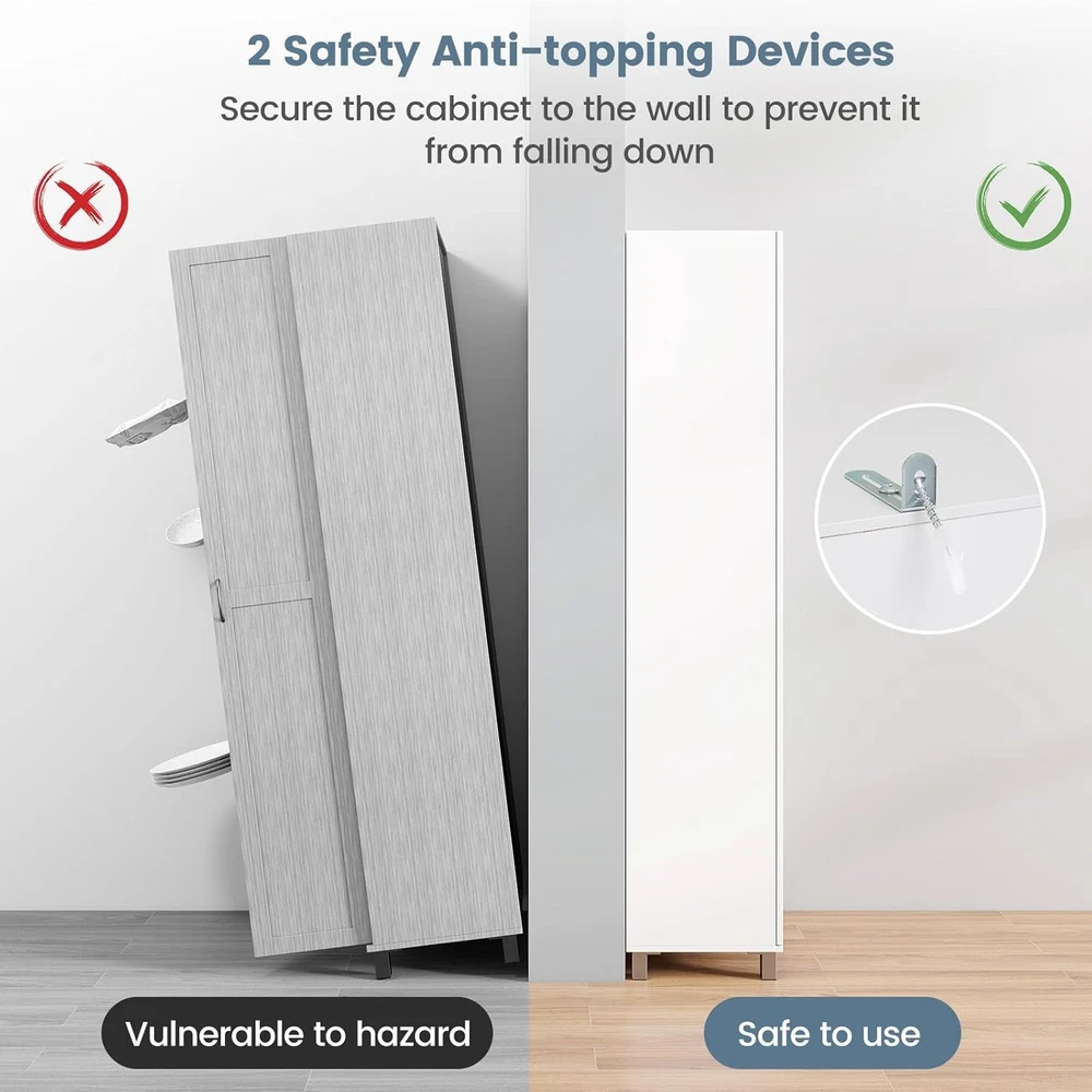 Product Description About this item Clutter-free Storage Solution: The storage cabinet features 5 storage shelves to enlarge storage capacity and classify daily supplies, such as books, documents, and kitchen utensils, capable of catering to different needs. Plus, this double door cabinet gives you ample private storage space, thus to keep a neat and tidy room. Customized Storage Space: The storage organizer comes with 3 fixed shelves and 1 adjustable shelf for flexible usage. Moreover, the shelf can be adjusted in 4 positions freely, which makes it easier to accommodate a variety of different sized items. And you can remove the partition to be a large storage shelf. Ultra Stable & Rugged Structure: Made of thick engineered wood and MDF, our floor cabinet shows perfect performance in lasting durability. Besides, equipped with anti-toppling device, the pantry cabinet can be fixed to the wall to prevent wobbling or tipping over. 4 heavy-duty support legs further enhance stability. Modern Style & Versatile Use: With modern style and elegant appearance, this freestanding storage cabinet adds refined sensation to your home and matches seamlessly with interior decoration. The utility storage organizer is an ideal choice for living room, bathroom, kitchen or any other space. All for Your Convenience: Metal handles are easy to open and close the door while magnetic door catch keeps the cabinet closed firmly. Under the detailed guidance of instruction, you can put all parts together effortless. The smooth surface will not take you too much time and effort in daily clean-up and maintenance.