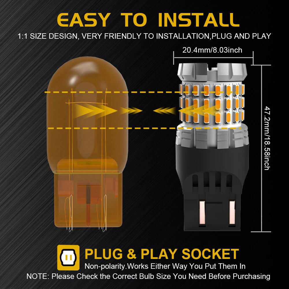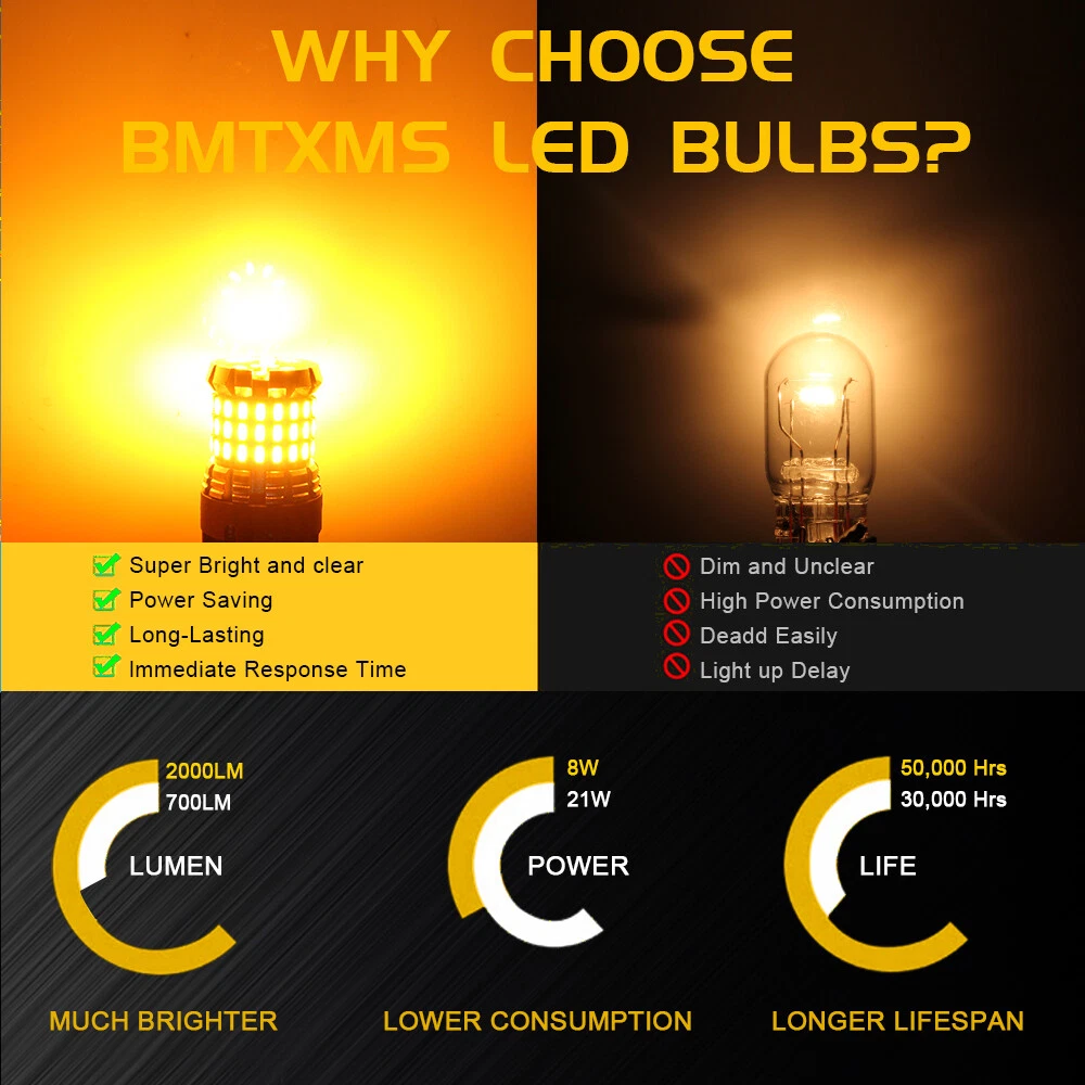 Specifications: Lumens: 4000lm/Pair Working Power: 16W/Pair Operating Voltage : DC9-18V IP Rate : IP68 WaterProof Light Source Model: 66PCS 3014SMD Color Temperature : White Operating Life: 50,000hrs Operating Temperature: -40°C~+80°C Compared with halogen bulbs: Brighter 400%+ Heat Dissipation: Theory Aviation aluminum 6063 Application: Turn signal light 7443 7440 7444 LED Yellow 3000K Front Turn Signal Light for GMC Yukon 2009-2012 Specifications: Lumens: 4000lm/Pair Working Power: 16W/Pair Operating Voltage : DC9-18V IP Rate : IP68 WaterProof Light Source Model: 66PCS 3014SMD Color Temperature : White Operating Life: 50,000hrs Operating Temperature: -40°C~+80°C Compared with halogen bulbs: Brighter 400%+ Heat Dissipation: Theory Aviation aluminum 6063 Application: Turn signal light Attention: CANBUS ERROR FREE: No. For most vehicles, just directly plug and play. Yet for some vehicles with CAN-BUS system, it may require install decoder or load resistor (NOT included) to avoid hyper flash or fast blinking.Those are NOT problems of LED bulb and NOT covered by warranty. (decoder must be purchased separately) Bulb Size: (For Reference Only) 7441, 7444, 7444NA, 7443, 7443ST, 7443LL Application: For Replacement of Turn signal light,etc. Note: ● Compatible List can not show up all Car model. Please confirm whether the item matches your car before you purchase. ● This item fits different positions, depending on the bulb size of your vehicle's make, You can also send us your car informations (Maker, Model, Year) To get support. Package included: 2pcs Led Lights. (with package) Installation: ▶ Please turn off the light first before installation and be careful while removing the stock bulb, it may be very hot. ▶ Simply remove your old bulb and install the new LED bulb in it's place. If the light doesn't immediately turn on flip it 180 degrees. ▶ Please kindly move the metal pin clips closer so that they can mount the festoon tighter in case the bulb is slightly loose in socket. Payment Delivery details Terms of sales About us Contact us Payment We only accept eBay payment . If you have any questions with your payment, please let us know and we will do our best to help you. Your satisfaction is our service tenet. We Only Ship To eBay Confirmed And Verified Address, Please Update Your Shipping Address On eBay Before Placing The Order. Delivery details Our facility ships Mon-Fri at 2pm CT, except for holidays. Your product will ship the items within 24-48 hours Items are shipped via USPS First Class (2-5 business days). Tracking information will be uploaded to your eBay purchase history. Terms of sales Warranty 12-month No-hassle warranty is standing back of our products, with fully confidence in our products. If your new led bulb won't light up, take it out and Flip it 180 degrees ( to reverse the polarity). Please note for the Festoon lights you can move the metal clips closer or further apart so they can fit the festoon led bulb tighter, Be gental with the clips so they do not break. About us About us BMTxms® sells only high-quality automotive LED lamp. You will get good quality, safe and reliable, after-sales care LED lamps. Delivering better products to you and your satisfaction is our service tenet. Contact us Contact us Our Working Time:(GMT+8)Monday to Friday,9:00-18:00.Please contact us through eBay's "Ask seller a question" link or "My Messages". Negative feedback will not help resolve any problems you have, please contact us via eBay messages before leaving negative feedback or open any ebay dispute Our customer service will make best effort to help you with the issues. We maintain high standards of excellenceand strive for 100% customer satisfaction! Feedback is very important to us. We appreciate all our customers to leave a positive feedback and 5 Scores DSR