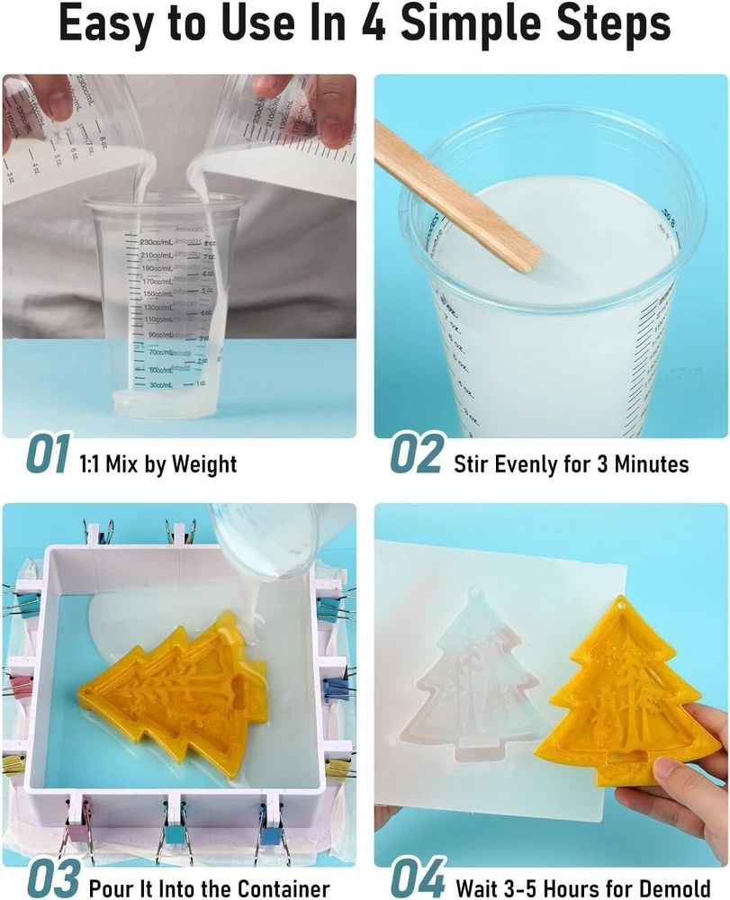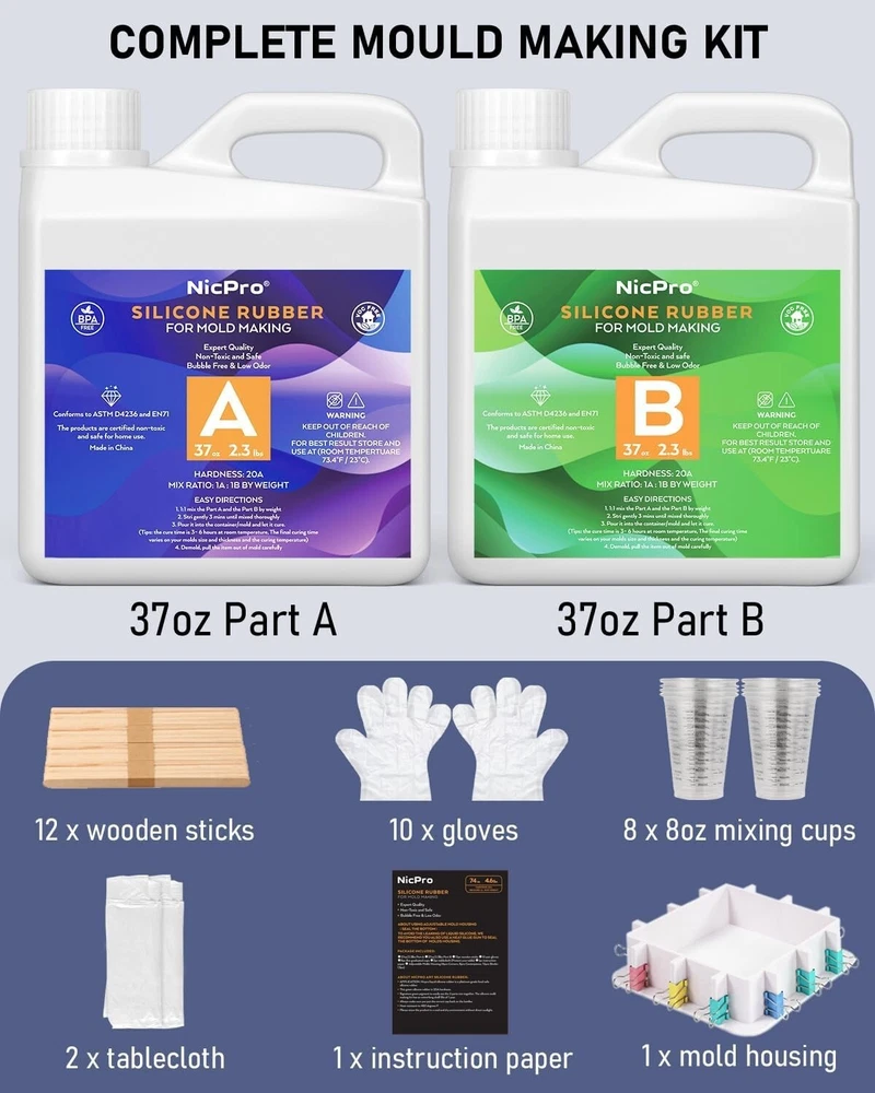 About this item 4.63 lbs / 74oz Mold Making Kit: Nicpro silicone mold making kit including 37oz part silicone A and 37oz part silicone B, 12 pcs wooden sticks, 10 pair gloves, 10pc 8oz graduated cups and 2pc tablecloth (keep your table clean) and 1pc instruction paper. A perfect slicone mold kit for beginners and professionals Premium Mold Making Silicone Materials: Our food grade translucent silicone rubber are platinum-cured silicone and made by safe silicone material, NON-TOXIC and odorless. Silicone hardness: 15A, features highly elastic and excellent flexibility. You could also mix clear silicone liquid with mica powder / pigment to create your favourite colors Easy To Blend and Fast Cure: This rubber silicone mix ratio is 1:1 by weight. Pour the Part A and Part B together, then stir the silicone liquid for 2 minutes, just make sure to stir the mixture thoroughly for better results. The working time is within 30 minutes and the cure time is 3-5 hours at room 23℃(73.4℉) temperature. Note:The final curing time varies on your molds size, thickness and the temperature Self Degassing and No Bubbles: Nicpro silicone mold kit is specially designed for all kinds of silicone molds making. If you give enough time for it, the bubbles will rise and break by itself quickly due to its excellent low viscosity feature, no vacuum degassing is necessary. Once cured Wide Application: Our mold making kit is great for craft use. You can DIY your own epoxy resin molds, cake molds, candle molds, soap molds, etc. Easy to pour and mix, perfect detail copy. the silicone is flexible. Also perfect for middle size project such as 2-piece 3D silicone molds, 1-piece 3D silicone molds, 1-piece flat silicone molds