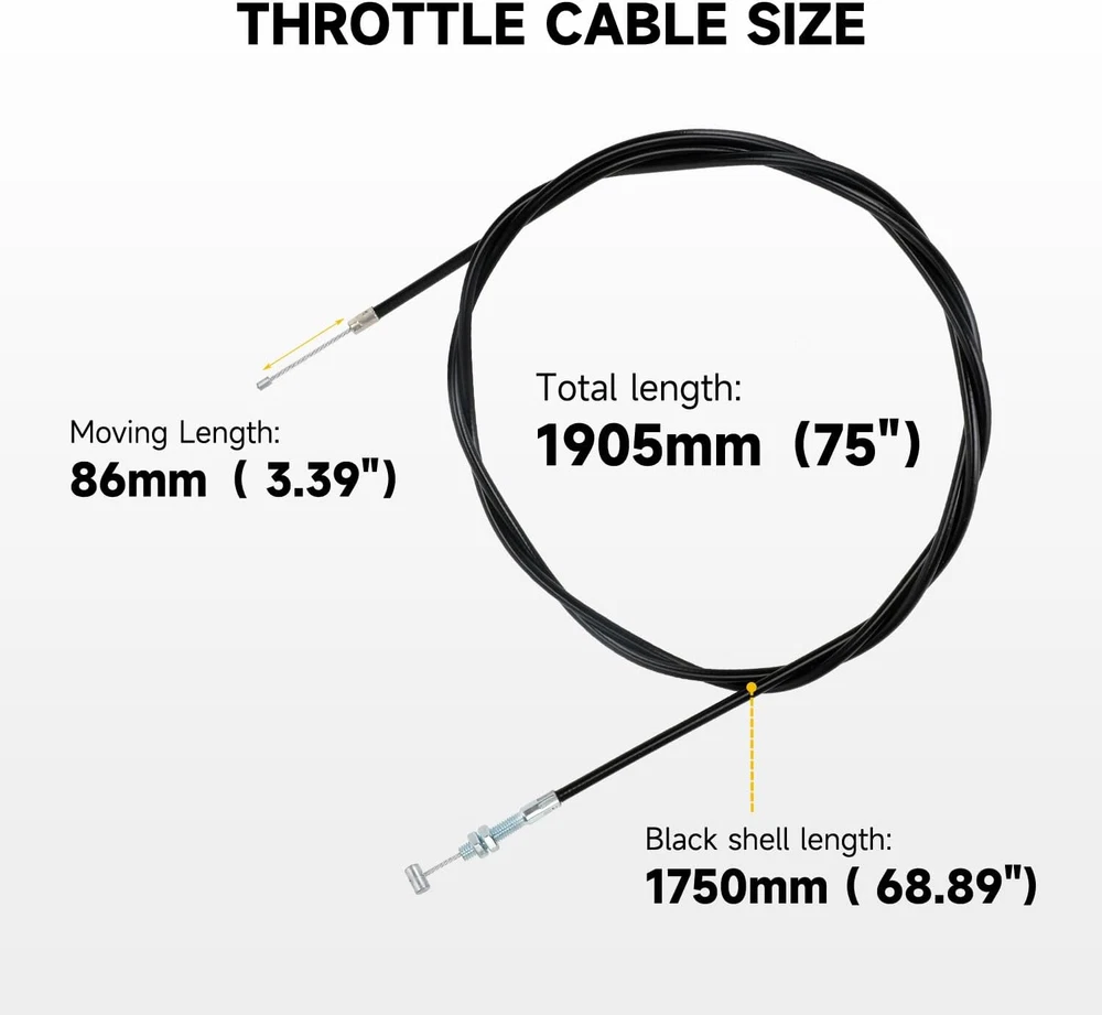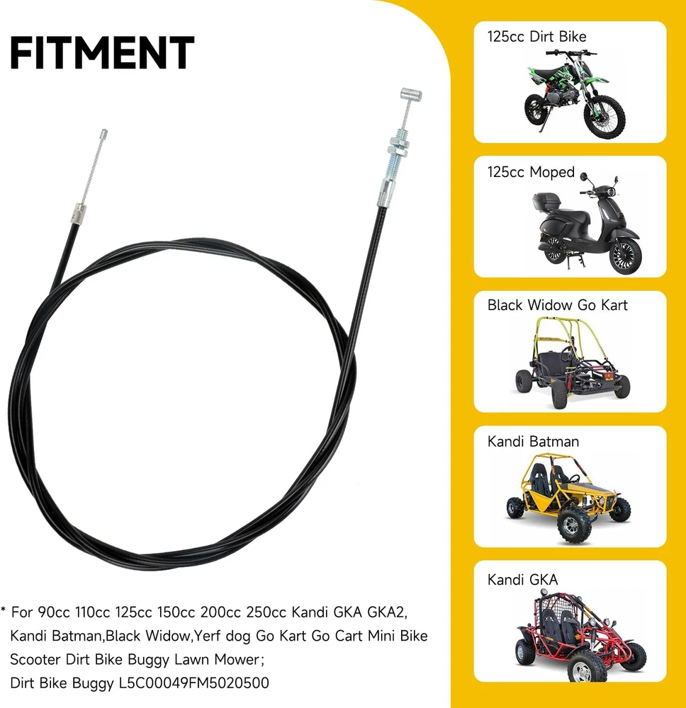 Fitment:This 75 inch go kart throttle cable kit compatible with 90cc 110cc 125cc 150cc 200cc 250cc Go Kart, Mini Bike, Gas Scooter, Pit Dirt Bike,Buggy, Motorcycle, Lawn Mower, such as Kandi GKA GKA2, Kandi Batman, Black Widow, Yerf do* Size: The total length is 75 inch (1905mm), moving Length is 3.39 inch(86mm) and go kart throttle cable casting cength is 68.9''(1750mm), which is suitable for most go kart mini bike scooter dirt bike buggy Strong and Durable: 75 inch twist throttle cable is made of high quality PVC protective shell, which can protect the inner from wearing down effectively for a long time. The chrome cable head is universal heavy duty cable head, which is extremely strong and durable Package Includes: 1 x 75 inch universal throttle cable, 1 x throttle pedal return spring, 1 x brake pedal return spring, 2 x cable stop, 6 x zip ties Function: Go kart throttle cable connects to the gas pedal and the engine's throttle plate as a link. When the gas pedal is pressed, the cable is pulled and the throttle starts. In addition, control your throttle and brake smoothly with our brake and return spring Product Description Cable Stop Please get the cable through carefully, screw to press and fix tightly. Throttle Pedal Brake and Return Spring Replace your brake pedal return spring with our attached springs to control the throttle and brake smoothly. Zip Ties To keep the cable tidy and from dangling, we specially add six ties for better cable management. Kindly Reminder Please check the cable length carefully before you order. About HIAORS HIAORS is a leading manufacturer and exporter which is concerned with the design, development and production of aftermarket parts for motorcycle HIAORS considers more on safety and practicability, pursuing to let all users enjoy the reliable products. Quality Control The company has a complete assembly line production and installation, after inspection.