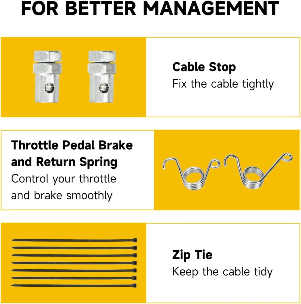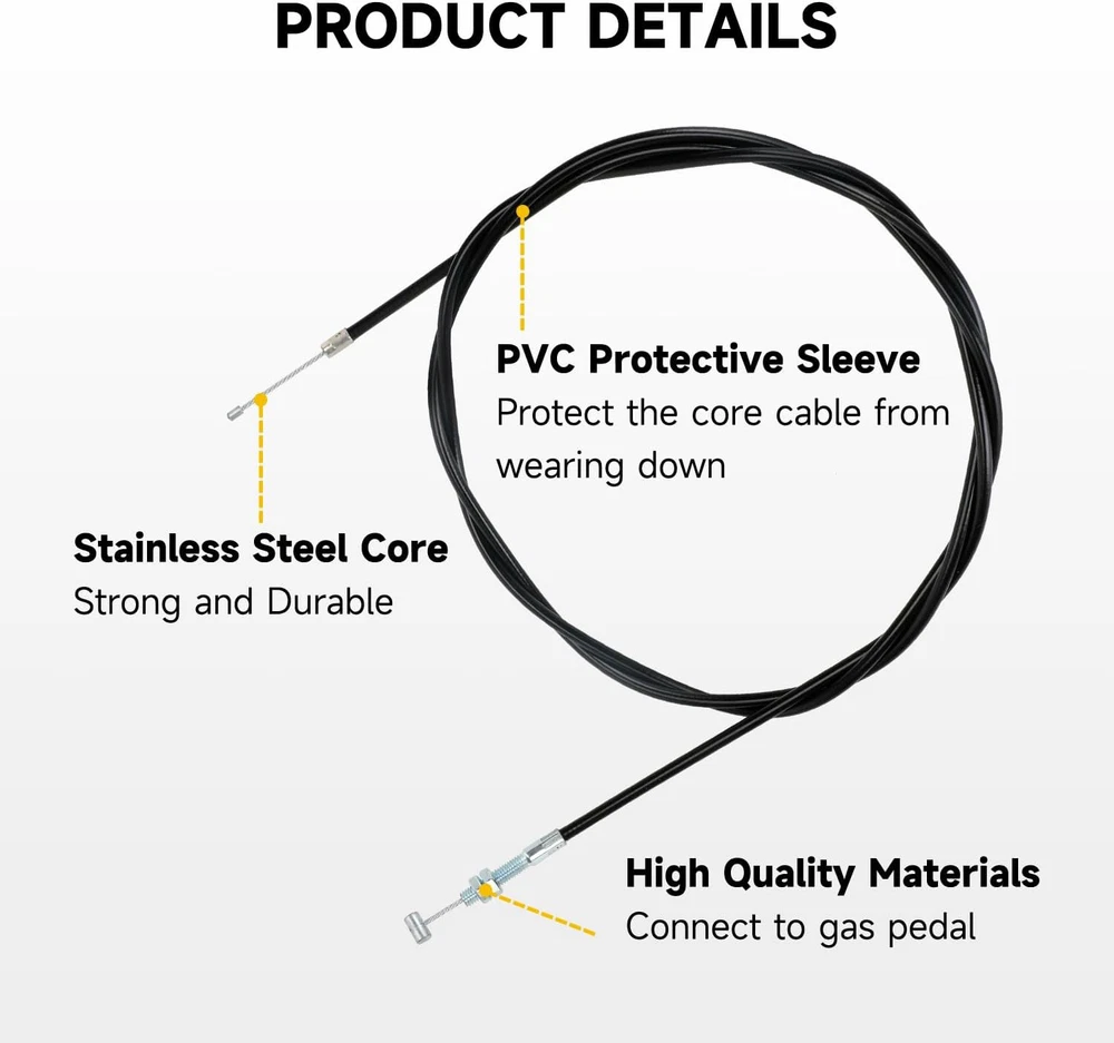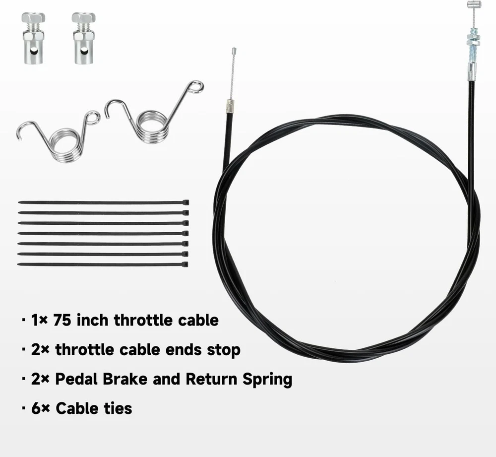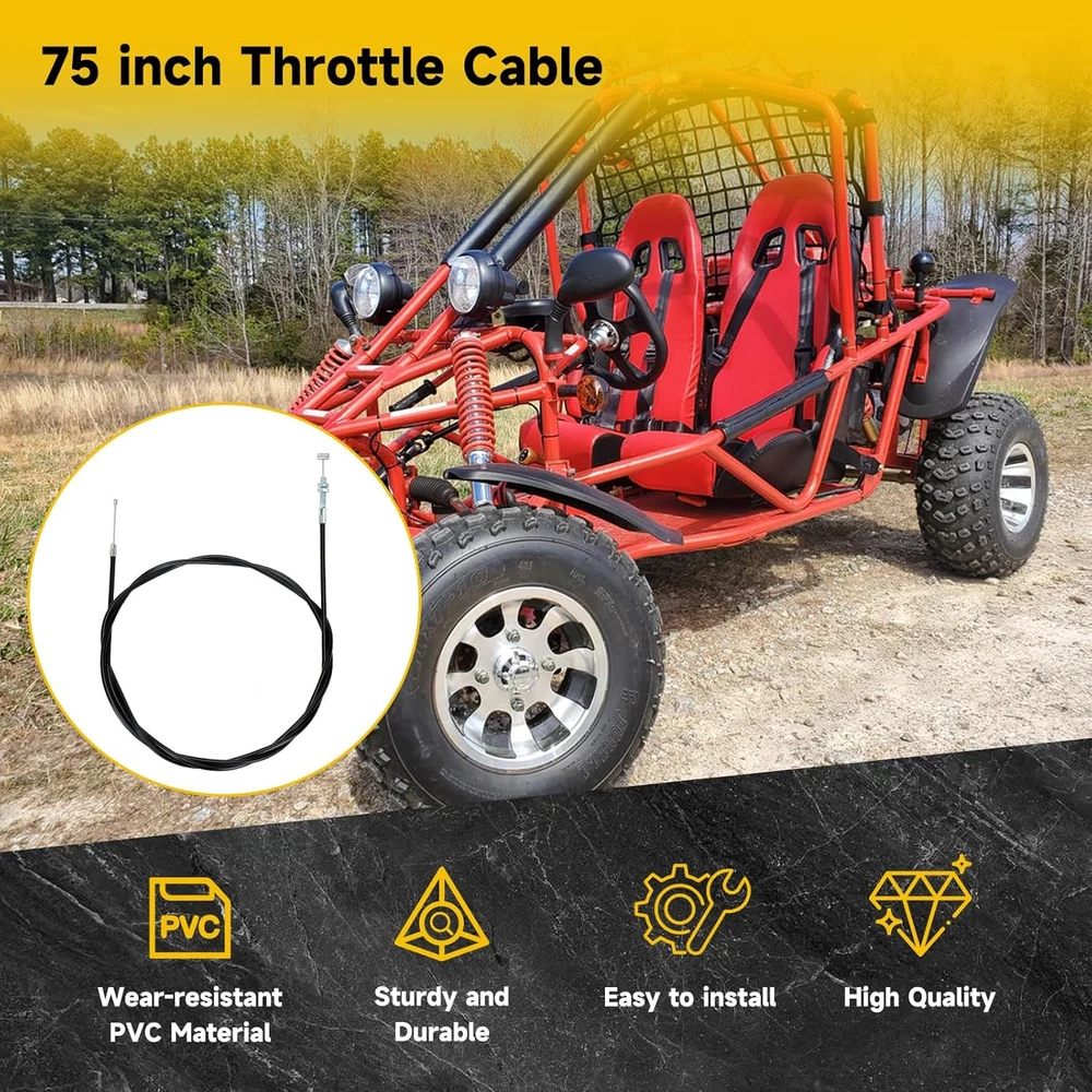 Store New Arrivals Add to Favorite View Feedback Contact 75 Inch Universal Straight Throttle Cable Compatible with 90Cc 110Cc 125Cc 150Cc Description Item model number HO-TH075-03 Number of Items 1 Country of Origin China Batteries Included? No Unit Count 1.0 Count Batteries Required? No Finish Chrome Exterior Finish Stainless Steel, Chrome Material Stainless Steel Specific Uses For Product Vehicle Included Components Cover Number Of Pieces 1 Item Weight 6.4 ounces Special Features Durable, Sturdy Special Feature Durable, Sturdy Color Black Handle Material Stainless Steel Finish Type Chrome Metal Type Stainless Steel Handle Type Lever Shape Round Product Dimensions 5.91"L x 8.66"W Size 1 Pack Fitment:This 75 inch go kart throttle cable kit compatible with 90cc 110cc 125cc 150cc 200cc 250cc Go Kart, Mini Bike, Gas Scooter, Pit Dirt Bike,Buggy, Motorcycle, Lawn Mower, such as Kandi GKA GKA2, Kandi Batman, Black Widow, Yerf do* Size: The total length is 75 inch (1905mm), moving Length is 3.39 inch(86mm) and go kart throttle cable casting cength is 68.9''(1750mm), which is suitable for most go kart mini bike scooter dirt bike buggy Strong and Durable: 75 inch twist throttle cable is made of high quality PVC protective shell, which can protect the inner from wearing down effectively for a long time. The chrome cable head is universal heavy duty cable head, which is extremely strong and durable Package Includes: 1 x 75 inch universal throttle cable, 1 x throttle pedal return spring, 1 x brake pedal return spring, 2 x cable stop, 6 x zip ties Function: Go kart throttle cable connects to the gas pedal and the engine's throttle plate as a link. When the gas pedal is pressed, the cable is pulled and the throttle starts. In addition, control your throttle and brake smoothly with our brake and return spring Product Description Cable Stop Please get the cable through carefully, screw to press and fix tightly. Throttle Pedal Brake and Return Spring Replace your brake pedal return spring with our attached springs to control the throttle and brake smoothly. Zip Ties To keep the cable tidy and from dangling, we specially add six ties for better cable management. Kindly Reminder Please check the cable length carefully before you order. About HIAORS HIAORS is a leading manufacturer and exporter which is concerned with the design, development and production of aftermarket parts for motorcycle HIAORS considers more on safety and practicability, pursuing to let all users enjoy the reliable products. Quality Control The company has a complete assembly line production and installation, after inspection. ABOUT US We offer the best prices around on high quality products. Our E-store includes media such as books, movies, music and games while offering electronics, toys, sporting apparel, clothing, tools, general home, garden items and more. SHIPPING We are always working hard to ensure your package arrives as soon as possible. Please understand that some factors like weather, high postal traffic, and the performance of shipping companies are outside of our control. We offer free shipping to the lower 48 states and ship within 2 business days of payment, usually sooner. We do not accept P.O. Boxes. Please provide a physical address. RETURNS We offer a 30-Day Return Policy on items which you are not completely satisfied with. You have the option for a full-refund or an exchange of the item. No returns are available on items shipped outside of the USA. PAYMENT We accept PayPal. CONTACT US This page content is yet to come Please ad us to your favorite seller and visit again later Thank You CUSTOMER SATISFACTION We try our very best to make sure every customer is completely satisfied. If there's a problem, message us! We're happy to help.