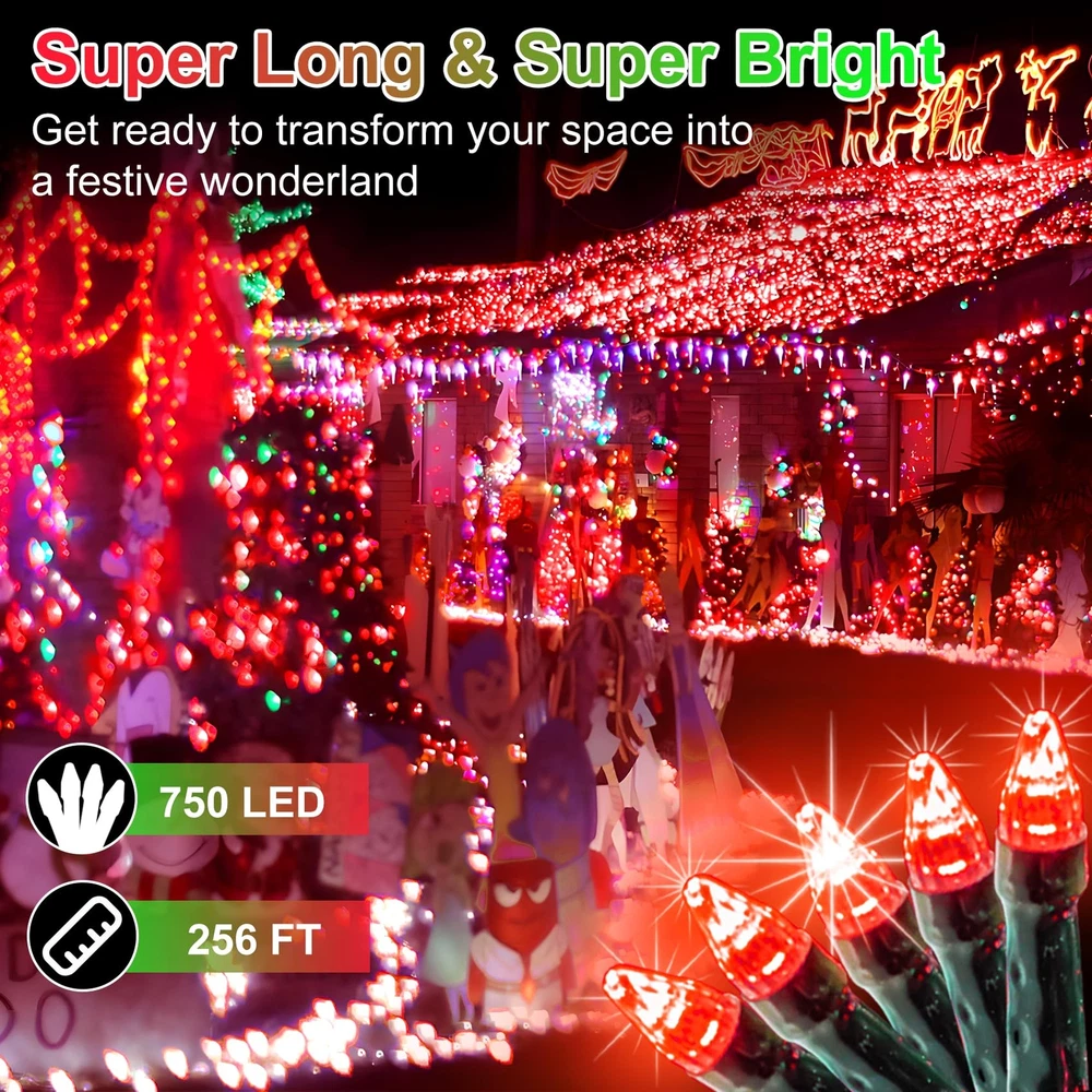Light up your festive celebrations with our incredibly long and bright 256ft Christmas lights! Boasting 750 enhanced LEDs, these super-long string lights brighten any outdoor area, making them perfect for transforming your garden, patio, or backyard into a vibrant space ideal for holiday gatherings and celebratory events Light up your festive celebrations with our incredibly long and bright 256ft Christmas lights! Boasting 750 enhanced LEDs, these super-long string lights brighten any outdoor area, making them perfect for transforming your garden, patio, or backyard into a vibrant space ideal for holiday gatherings and celebratory events Featuring 8 unique lighting modes like Combination, In waves, Sequential, Slo-glo, Chasing/flash, Slow fade, Twinkle/flash, and Steady on—our lights cater to every mood and occasion. Easily control your settings with a simple push of a button on the plug. For added convenience, these lights come with a timer function for automated 6 hours on and 18 hours off cycles, while a memory chip retains your last used setting. Experience hassle-free installation and user-friendly operation that makes setting up your holiday display a breeze Prioritize safety with our LED Christmas lights designed for secure indoor and outdoor use. The 29v low voltage and advanced safety features offer peace of mind, especially in households with young children and pets. Our lights are cool to the touch with minimal heat emission, ensuring safe handling and a secure environment throughout the holiday season Durable and reliable, our waterproof Christmas string lights are crafted from high-quality materials and feature advanced LED for enhanced beauty and brightness. Perfect for both indoor and outdoor decorations, they withstand harsh weather conditions like rain or snow. Enjoy a long lifespan and enduring brilliance, making these lights a mainstay of your holiday decor for years to come This set includes 1 x 750 LED String Light, 1 x Power Plug, and 1 x User Manual, backed by 24-hour friendly customer service. If you have any questions, please feel free to contact us. Embrace the holiday spirit and use these robust string lights to adorn your garden throughout the Christmas season and beyond