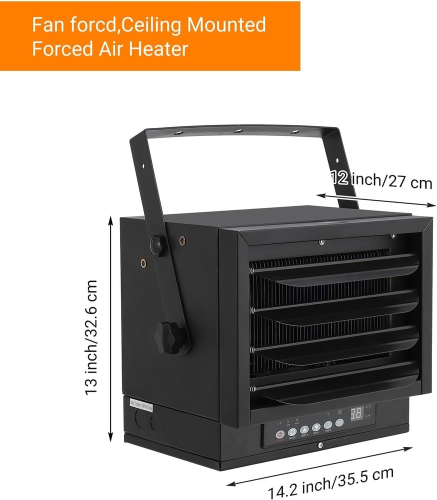 Specifications: Color:Black Form Factor:Cabinet Indoor/Outdoor Usage:Indoor Power Source:Hard-Wired Heating Method: Forced Air Heat Output:25600 British Thermal Units Material:Steel Power Range:6250/7500W Voltage:240V Area Covered:1250 sq. ft. Thermostat: 45-95°F/7-35°C Timer Function: 12H Timer Amperage: 31.3 Amps Features: Superior Heating Performance: This powerful 7500 W electric garage heater generates an impressive 25,600 BTUs; effectively warming spaces up to 1,250 sq. ft. with adjustable settings of 6,250 W and 7,500 W for tailored comfort Robust and Long-lasting Design: Built for demanding environments, this ceiling-mounted electric heater features a heavy-gauge steel construction and a dust-protected motor; this ensures reliable performance and an extended lifespan Precise Airflow Control: This hardwired garage shop heater features a louvered design with three adjustable mounting angles; easily direct airflow to specific areas while the fan-forced mechanism ensures consistent warmth throughout the space Thermostat & Overheat Protection: Equipped with an integrated thermostat, this electric garage heater allows for effortless temperature adjustments from 45 °F to 95 °F; an automatic shut-off function prevents overheating and ensures safe use Two Control Methods: Manage your heating effortlessly with the intuitive control panel and included remote for this adjustable electric heater; a built-in 12-hour timer helps you maintain warmth according to your schedule Payment Delivery Returns Feedback We accept Payoneer only. All major credit cards are accepted through secure payment processor PayPal. Payment must be received within 7 business days of auction closing. If you have bought multiple items from me, you can send me one payment for all the items instead of paying for them individually. When you click the Pay Now button, eBay will automatically determine if there are other items you have won or purchased from me and will combine them for your review. NOTE: Import duties, taxes and chargers are not included in the item price or shipping charges. These charges are the buyer's responsibility. Please check with your country's customs office to determine what these additional costs will be prior to bidding buying. 1. We will delivery out at the handing time when we receive the payment. 2. The delivery time is 3-5 business days to US by usually time.The parcel maybe delay 1-2day of the weekend.Due to the bad weather,Holidays,Hot Season ect.the parcel maybe delay,If you have any problems,mssage us,we will try our best to solve it. 3. We ship to your eBay address. Please make sure your eBay address is correct before you pay. 4. If you want to change the shipping address,message us before our send out. 5. We cannot deliver your order if your state is PR. 1. If you donot receive the items at the delivery time,the parcel has broken/missing,Please message us before you open case/return,we will try our best to solve it. 2. We offer a 30 day return policy from checkout winning date. 3. An RMA number is required for all returns. Message us for return instructions. Items Returned without a RMA number will not be processed. 4. Items defective upon receipt must be packaged in their retail packaging as if new and returned with a detailed description of the problem. 5. Return shipping fees are not refundable.We reserve the right to decline any returns if the above guidelines are not followed. If you are not satisfied with the item for any reason, please do not quick to leave negative/neutral feedback even open request and case without any communication with us. We devote ourselves making EVERY CUSTOMER in 100% Satisfactory and resolve any problem. Thank you for your understanding and recognition,we are always leave positive feedback to all our customers. About Reply: All replies will be sent to your email box, if you do not get response within 24 hours (Sat. & Sun. excluded) please check your eBay My Messages in case that our emails will be filtered automatically by your settings.
