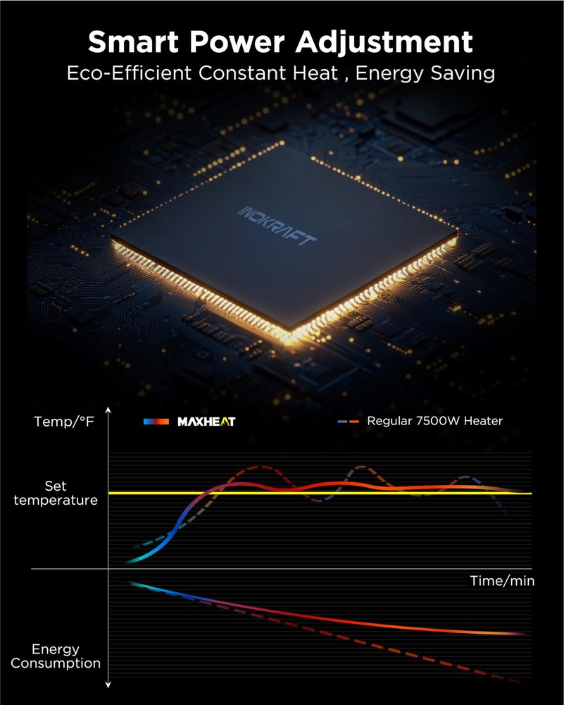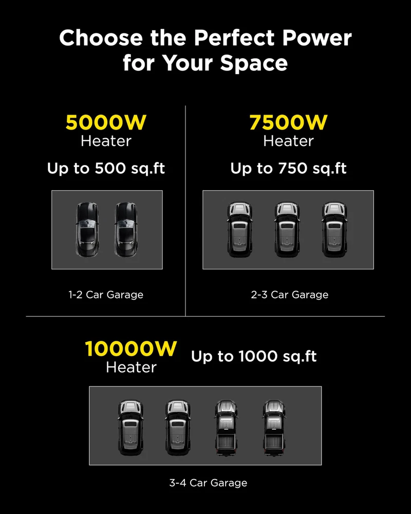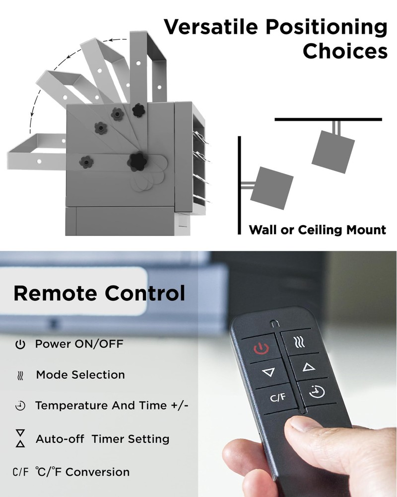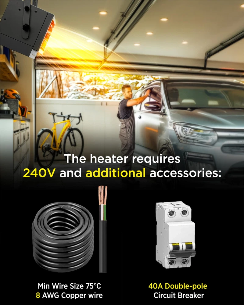 Immerse yourself in cozy comfort with Max Heat powerful 240V 7,500 watt fan-forced wall heater, perfect for heating up large spaces quickly. It can raise the temperature by 90℉ in a 750ft² room. Operating quietly at 60 dB, it ensures a peaceful environment. With 2 heat settings (Standard Power/Eco Mode), this heater guarantees optimal warmth for your space. Ideal for garages and workshop, this heater is a must-have for chilly days. Take control of your comfort with the digital thermostat feature of this garage heater. Easily adjust the temperature within the range of 40℉ to 95℉ and set a timer from 1 to 12 hours for added flexibility. With the convenient remote control, you can manage the settings from anywhere in your garage, ensuring effortless operation. The garage heater features a smart ECO mode and timer function. The ECO mode automatically adjusts the operation based on ambient temperature and can even switch off to save energy. You can set a timer for auto-shutoff to reduce energy costs. Additionally, the heater comes with a built-in thermostat for customizable power settings and includes overheat protection with automatic shut-off for safety. Providing five angle adjustments during installation, allowing you to accurately direct warmth where needed. The flexible louvers can be adjusted to ensure even heating throughout the garage, creating a comfortable environment. Designed for wall or ceiling mounting and hard-wired installation, it offers a convenient solution to maximize floor space in busy areas. Our garage heater offers wall-mounted or hanging options for space efficiency. It includes an automatic fan delay function for effective heat distribution and energy conservation. Professional installation by an electrician is necessary to ensure proper grounding and hardwiring according to safety standards, such as the National Electric Code and local regulations. This guarantees safe operation and optimum performance, freeing up valuable floor space in your garage or workspace.