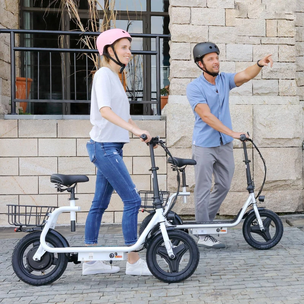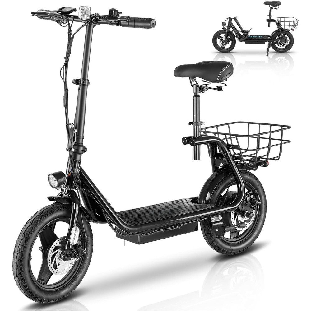 Product Description About this item đ´ăPowerful Motor & Long Battery LifeăCaroma electric scooter adults with a 750W(Peak 1200W) electric brushless hub motor allows for speeds up to 20mph. This adult electric scooter has a capacity 48V battery with a max travel range of up to 30 miles under specific conditions and a maximum load of 300 lbs. đ´ăSmooth & Safe RidingăE scooter for adults with Larger 14" rubber pneumatic tires increases shock absorption from bumpy city riding, bringing a smooth ride. Caroma escooter electric for adults with a 9.5" wide deck and adjustable saddle make it more comfortable even on a long-range commute. Disc brake & E-ABS, ensuring an effective braking distance and safety. đ´ăDesign for CommutersăEletric scooter for adults comes with a basket above the rear wheel, perfect for shopping trips and short errands around the block. Built-in spot headlight makes the road visible and safe to ride at night. đ´ăFoldable & Easy to CarryăElectric scooter with seat for adults has a folding design. The compact folded size makes it easy to store in car trunks and other tight spaces, detachable scooter seat is included. Electric Scooter with Seat & Basket
