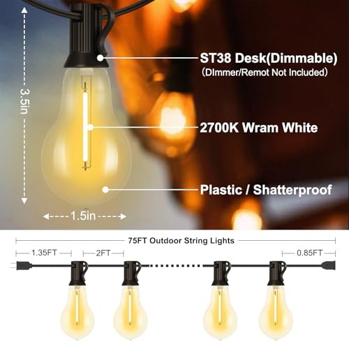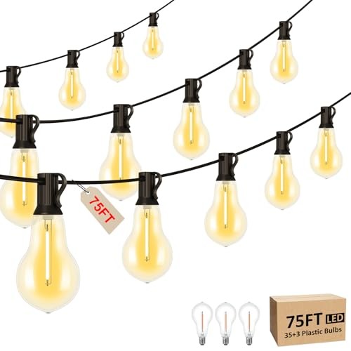 Menu 1. We require immediate payment. 2. We currently accept payment via eBay managed payments only. 3. Once payment is cleared, we will dispatch your shipment within 1-3 business days. Please refer to the "Shipping" tab for more information regarding shipping speed to your destination. 75FT LED Outdoor String Lights with 35+3 Shatterproof Bulbs(Gourd Shape), IP44 Waterproof, Commercial Grade Patio String Lights for Outside Porch Backyard Garden Deck Decor, 2700K Dimmable Product description 【???? ???? ??+? ?????】? 75 FT A39 outdoor string lights with 38 edison bulbs (3 spares). Each bulb size 3.5 x 1.5 inches, E12 Bulbs base, distance between bulbs2FT(others 3.8FT). It provides the ultimate sense of ambiance and is the best commercial grade light string 【?????????? & ????????????】? patio string lights have IP44 waterproof rating to withstand rain, sun, wind, snow, humidity and extreme temperatures. Each shatterproof bulb is made of plastic material and will not be damaged during transportation or installation. 【??????-?????? & ????????】? LED outdoor string lights are more energy efficient than traditional incandescent bulbs, saving more than 90% of energy and reducing power consumption. These Bulbs have a lifespan of 30000+ hours and provide high brightness without generating heat. 【???-??-??? ???????】? outdoor string lights waterproof connect up to 7 sets end-to-end for the ultimate in ambiance, perfect for gardens, patios, backyards, gazebos, balconies, cafes, bistros, parties, and wedding decorations. 【???? ??????? ?????????】? light strings are all ETL or UL certified, It is made of high quality base and plastic bulb. Which s that you can use them safely. We offer two year war-ranty and 7/24 online customer service! 【???? ???】? 2700K light string is dimmable, but not include a dimmer or remote. PLEASE MESSAGE US IF YOU HAVE ANY OTHER QUESTIONS, AND MANY THANKS FOR READING ALL OF THIS. Copyright ©#. All Rights Reserved.