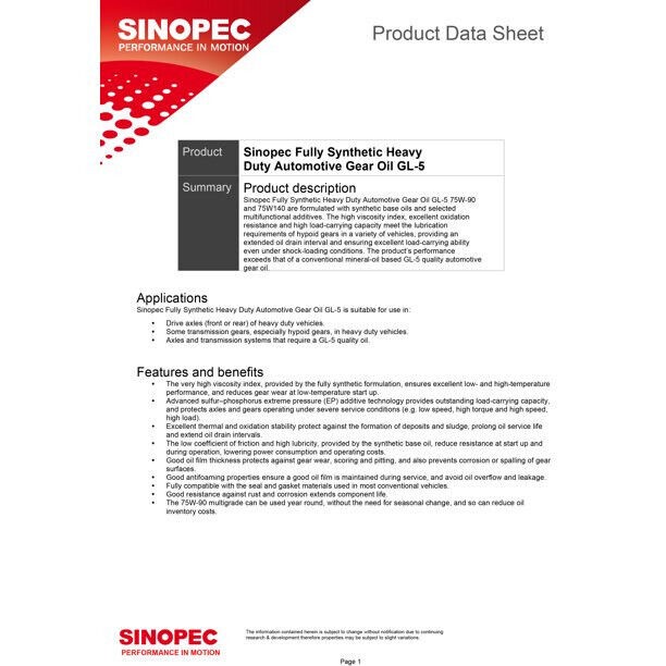 Sinopec GL-5 Synthetic Heavy Duty Automotive Gear Oil is a high-performance gear oil, formulated with high-quality synthetic base oil and an advanced multifunctional additive system to meet the requirements of API GL-5. Designed for the lubrication of hypoid gear sets in passenger vehicles and commercial vehicles, where they offer excellent extreme pressure (EP) and anti-wear properties. Certifications: API GL-5, MIL L-2105D, SAE J2360, MAN 342 Type M2, MACK GO-J Plus, International TMS-6816, Dana Shaes 429, Shaes 256 rev. c, ZF TE_ML 05A, TE-ML 19B, TE-ML 21A, TE-ML 07, TE-ML 08 Pack Size: 5 Gallon Pail, actual volume of oil is 18 liters or 4.755 gallons Applications Sinopec GL-5 75W90 Synthetic EP Gear Lube is suitable for use in: Axles, final drives and power take-off units in trucks, buses and off-highway vehicles used in various industries, including the construction, agricultural, forestry and mining sectors. Differentials, gear boxes and steering gears, where a hypoid oil is required. Some industrial gear sets, where an extreme pressure (EP) gear oil is required. Features & Benefits Excellent extreme pressure and anti-wear performance protects gears operating at high speeds and tooth pressures from abrasion, wear and welding, even in severe high-load and shock-loading conditions, extending component life. Excellent thermal and oxidation stability minimize the build up of deposits and varnish, reducing wear, extending component life and ensuring longer oil life. Protection against corrosion and rusting extends equipment life, and reduces maintenance costs. Good low-temperature fluidity ensures optimum lubrication, even in cold start-up conditions, and prevents start-up wear. Good anti-foaming properties ensure optimum oil film thickness, protecting components against wear, and minimize oil leakage. Multi-grade oils can be used over a wider temperature range, and so can reduce the need for seasonal oil change thus reducing maintenance costs. Fully compatible with common seal materials, to extend seal life and prevent fluid leakage. 5 Gallon Pail (18L - 4.75 GAL) On Aug 4, 2025 at 20:43:29 PDT, seller added the following information: On Jan 4, 2026 at 04:43:13 PST, seller added the following information: