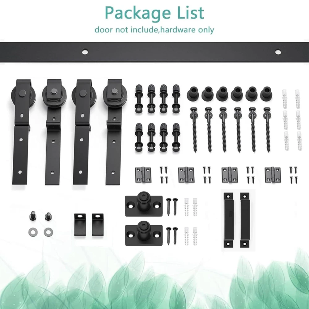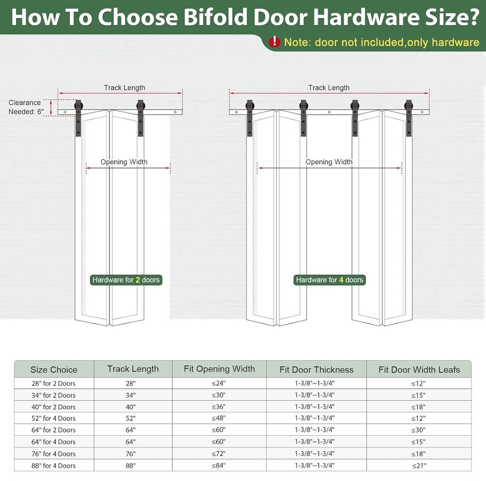 Bi-Folding Sliding Barn Door Hardware Kit 【Superior Quality】Made of black heavy-duty steel, it has the benefits of sturdy, durable, wear-resistant and corrosion-resiatant. The roller is a combination of high-quality bearings and nylon wheels, matched with 6mm thick track to improve the bearing capacity of the product. And it has undergone 120,000 tests to ensure quiet and smooth sliding. 【Unique Design】Different from the traditional hardware kit on the market, the folding door kit can greatly save you space. And the scope of application is wide, can be used in a variety of living occasions, such as living room, dining room, study, etc. 【Package List】Packing: 2x 3.2FT track, 4x roller, 4x roller rotating bracket, 2x roller fixator, 5x spacer, 6x hinge, 2x floor guide, 1x Sealing Strip. Fit Door Thickness: 1-3/8"~1-3/4"(35mm~45mm). [Friendly reminder: DOOR NOT INCLUDED] 【Easy to Install】The total width of the door panel plus 4" is the length of the track. We provide detailed Bi-Fold sliding barn door kit instructions with pictures and text, which can be intuitively installed by yourselves, saving the time and cost of finding an installation team for you. 【Easy Install & 24 Hours Stand By】We have a professional customer service team 24 hours online to help you. If there is any problem about our products, please let us know and we will try our best to solve your problem.