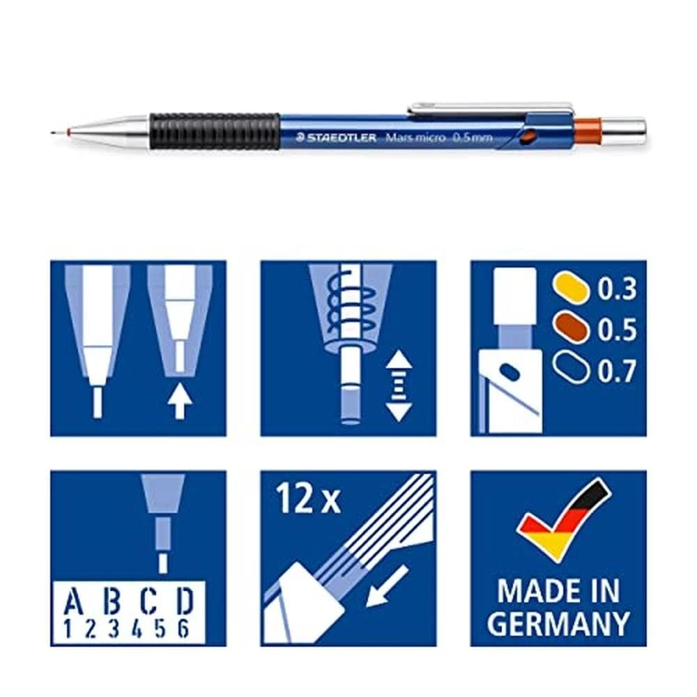 Set of 10 Blue Pencil 0.3 mm refillable plastic body with rubber grip 775 Mars Micro Blue Plastic Body, Metal Clip. Rubber grip. Canon right return. Shatterproof Shock Absorber mines. Push button to move lead forward. Lead hardness: Retractable: :