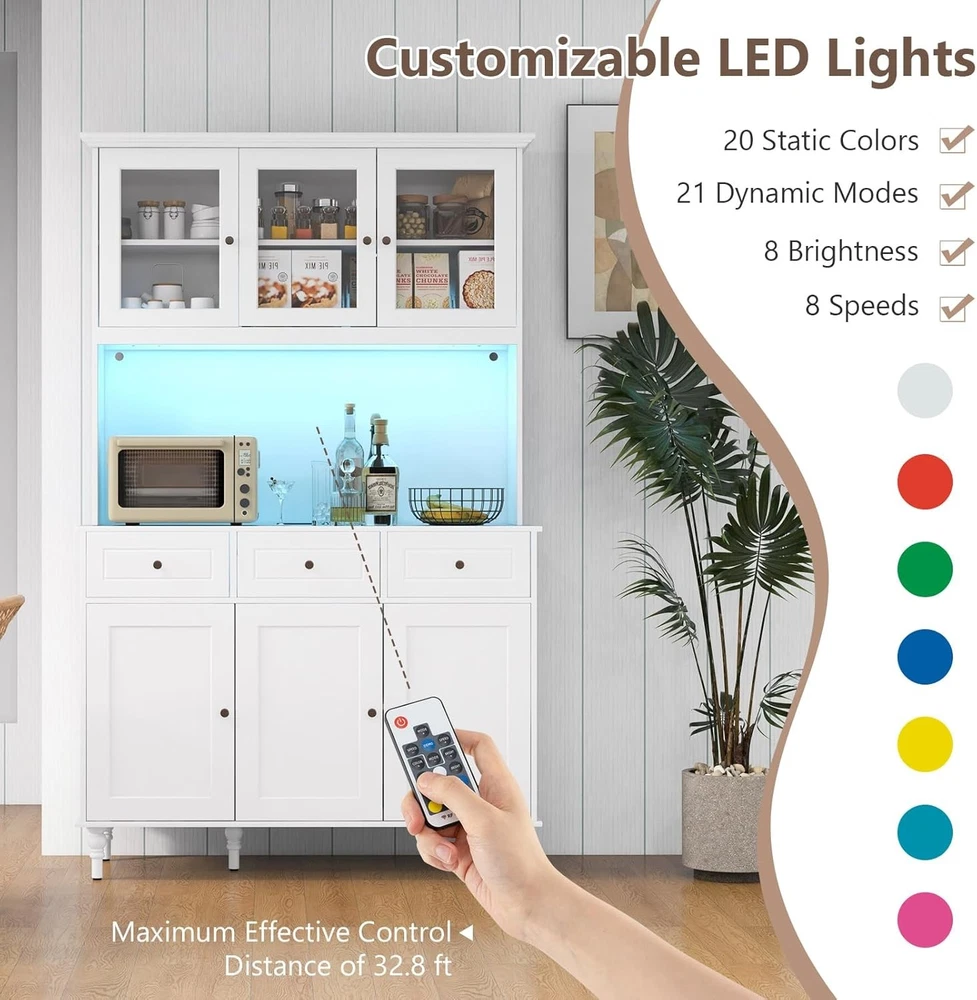 Product Description About this item Customizable Storage: Flexibly customize the storage space with our kitchen hutch cabinet, featuring 3 drawers and 4 doored cupboards. Each of the 4 shelves within can be adjusted among 3 positions at an increment of 2.5”, providing tailored storage space for items of varying sizes. Enhanced Workspace: With a wide countertop, our kitchen utility cabinet doubles as an additional workspace. The built-in charging station offers 2 AC outlets, a USB port and a type-C port, so that you can keep your essential kitchen appliances charged up and ready for use. Adjustable LED Lights: The dynamic LED lighting system integrated within our pantry storage cabinet features 21 dynamic modes and 20 static colors. Additionally, it comes with 8 levels of brightness and speed adjustments, ensuring the ambiance is perfectly suited for any occasion. Sturdy Design for Safety: Our freestanding hutch cabinet, fortified with anti-toppling devices and an additional support leg, is more stable and safe for your family and belongings than the traditional cabinets. The cabinet's see-through tempered glass doors blend style with strength, providing enhanced durability. Effortless Maintenance: Maintain your doored pantry cabinet with ease—its easy-to-clean surface requires little effort. The spacious 5" clearance facilitates the smooth passage of vacuum robot underneath, eliminating the necessity to bend or kneel during cleaning. Description: Our kitchen buffet cabinet offers 3 spacious drawers for easy access to your kitchenware, complemented by 4 doored cupboards with adjustable shelves for your versatile storage needs. The dual tempered glass doors on the upper cupboards exude a modern elegance, offering both a clear view of your organized contents and an added layer of strength and safety. The large countertop of this tall cupboard serves as an additional workspace, and is equipped with a built-in charging station, which enables you to plug in your household appliances at all times. Safety is prioritized with anti-toppling devices and a support leg for stability, and cleaning is made easy with generous ground clearance for vacuum robots. Upgrade your kitchen with our stylish and practical utility pantry cabinet! Features: Ample storage space with 3 drawers and 4 doored cabinets All 4 shelves are 3-position adjustable for item of different heights Wide countertop expands your kitchen workspace Included charging station to keep your kitchen appliances ready 8-level adjustable brightness and speed for dynamic ambience Increased stability with anti-toppling devices and central support leg See-through and unbreakable tempered glass doors are as stylish as they are sturdy Abundant ground clearance for vacuum robots to enter at ease Round metal knobs and slide rails facilitate easy opening and closing Easy-to-clean cabinet surface minimize maintenance efforts Comes in 3 boxes and you may receive them on different days Specifications: Color: White Materials: MDF, Engineered Wood Product Dimensions: 47" x 18" x 77" (L x W x H) Size of Countertop: 46" x 17.5" (L x W) Height of Countertop Part: 19" Ground Clearance: 5" Length of Power Cord: 4.6 ft Net Weight: 152 lbs Max Weight Capacity: 365 lbs 2 USB Ports: 5V 2A Each Type-C Port: 5V 3A 2 AC Outlets: 125V 12A Each Package Includes: 1 x Pantry Cabinet 1 x User Guide