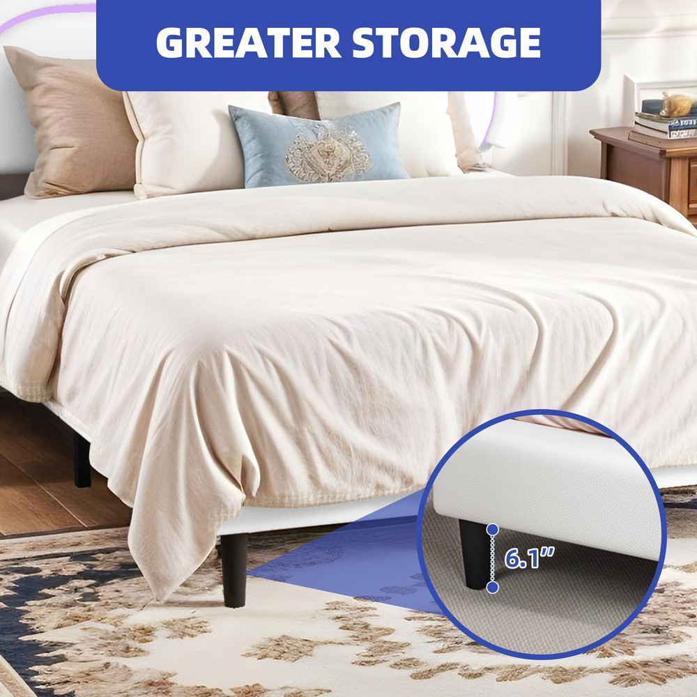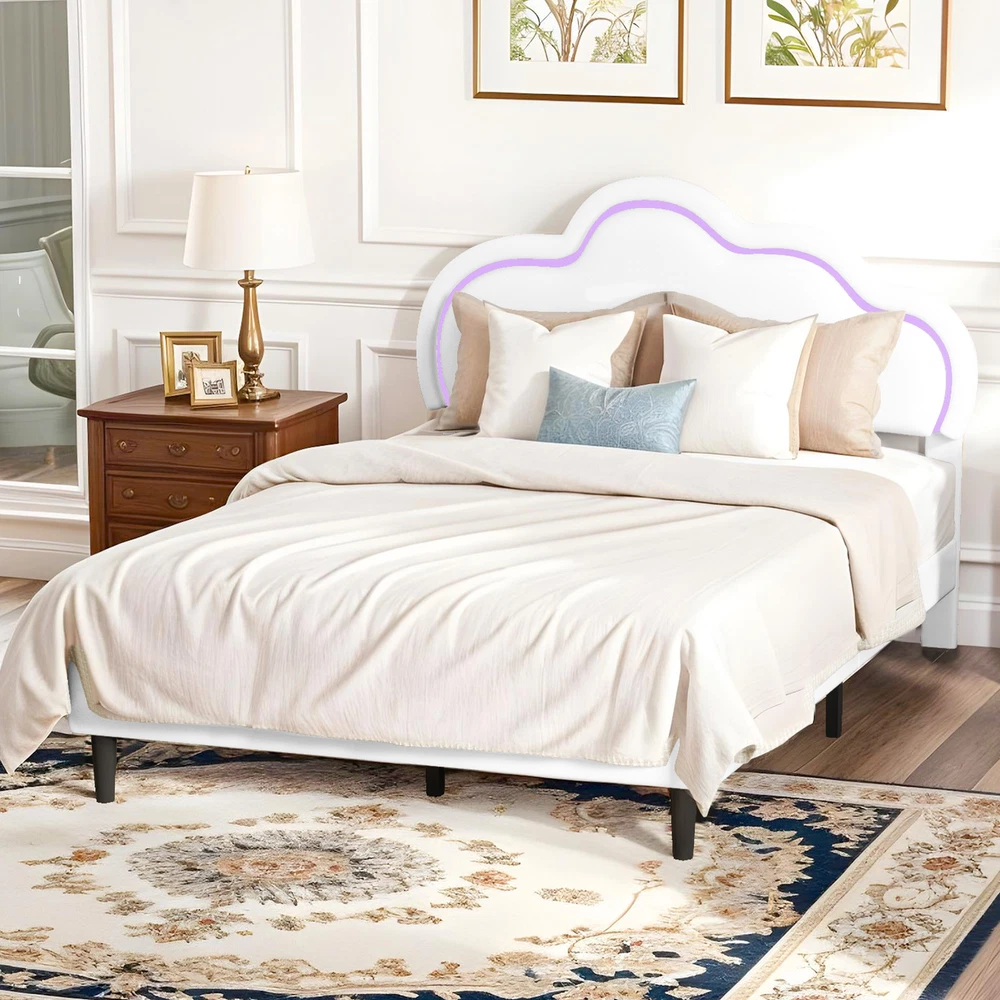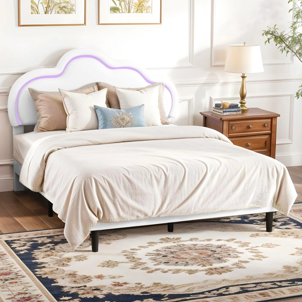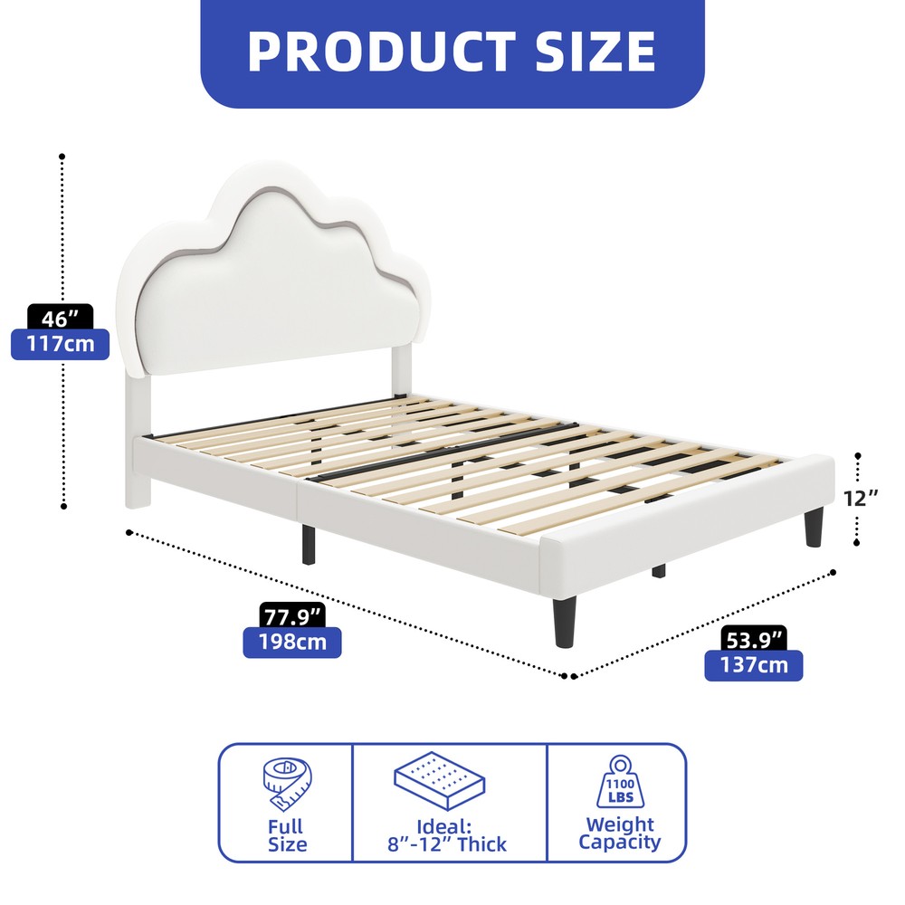 Metal 78"x54" Bed Frame Full w/ Headboard Shelves Cloud Design, Easy Setup Product Description NOTE: Professional Installation would be Highly Recommended. Description: 1. Material: Metal Aluminum 2. Color: White 3. Features: Cloud Shape, Underbed Storage, Easy to Connect Support, Noiseless Design 4. Mattress Include: NOT INCLUDED 5. Mattress Size: Full Size Features: 1. Chic Cloud Headboard Design: The headboard features a charming cloud shape, adding a whimsical yet sophisticated touch to your bedroom decor. Its soft, cushioned surface offers a cozy spot for relaxation and reading. 2. Dynamic LED Lighting Options: Customize your room’s atmosphere with the integrated LED lights, which offer a range of colors and settings. Easily adjust the lighting to suit your mood, creating a personalized ambiance with the remote control. 3. Adjustable Headboard Flexibility: The headboard’s adjustable height allows for seamless integration with various mattress sizes. This feature ensures a tailored fit and enhances the overall aesthetic of your bedroom. 4. Efficient Underbed Storage : Maximize your space with the generous under-bed storage area, perfect for storing extra linens and seasonal items. This practical feature helps maintain a tidy and organized living space. 5. Robust and Quiet Design: Crafted from durable metal aluminum, this bed frame provides reliable support and a noise-free experience. The easy assembly process, complete with all necessary tools, ensures a quick and stress-free setup. Dimensions: 1. Overall Size: 77.9" x 53.9" x 46" Package Included: 1. Set of Bed Frame (MATTRESS NOT INCLUDED) 2. Assembling Hardware Kits 3. Instruction Manual Book Shipping 1. Normally the item will be dipatched within 1 business day if payment is cleared before 12pm PST. 2. Please verify the correct shipping address in your PayPal account before making the payment. We only dispatch the item to the address that is sent to us at the time of checkout. 3. We don't ship to Hawaii, Alaska, Puerto Rico, APO/FPO/PO Boxes. 4. We don't provide local pick-up service. 5. Normally we will use USPS, UPS, FedEx & LTL to dispatch items. Payment 1. We accept PayPal and credit card. 2. We will ship to the confirmed Paypal shipping address that is provided with the payment only. Return 1. 30 days Money Back Guarantee. 2. Please contact our customer service to receive a RMA form first if want to return the item. 3. All returned items MUST in new condition with the original package. Contact If has any problem, please contact us by sending an ebay message. Our customer service will resolve the problem as soon as possible. On Feb 12, 2025 at 23:20:51 PST, seller added the following information: