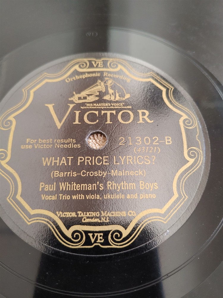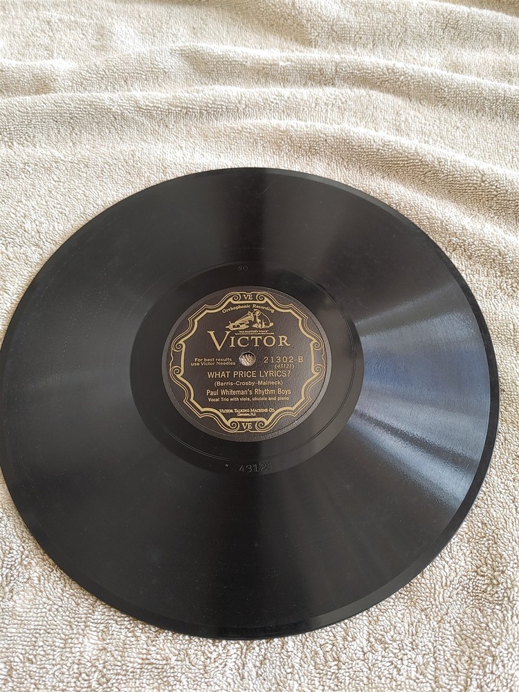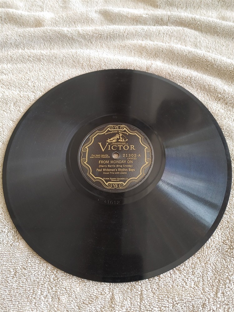 78 RPM Paul Whiteman's Rhythm Boys VIC 21302 From Monday On Bing Crosby 1928 EXC 78 vintage Victor VE 21302 record from 1928 - Paul Whiteman's Rhythm Boys - Bing Crosby, Harry Barris, Al Rinker From Monday On / What Price Lyrics?- rates E to E+, still shiny , slight rubs or scuffs, plays well on my Dual 1219 turntable with 2.7 78 stylus, noticeable but not overpowering background noise. Please look at the photos. jazz pop blues I try to avoid records that are simply not an enjoyment to own due to condition or inability to play well. All records are graded using my simple categorization: Near Mint (M-) nothing is rated mint Excellent (E+) possibly a flea bite or hair scratch or smudge, super shiny (E) scuff or light scratch or two, still super shiny (E-) slight scuffing or very slight scratches, still shiny Good (G+) light scuffs, scrapes or hair crack, shiny still very playable (G) scuffs, scrapes, light cracking, some shine, still playable (G-) scuffs, scrapes, cracking, playable, not necessarily enjoyable Poor (P-) wall art due to playing condition These are fragile artifacts from the last century. Disc records are sandwiched securely between several pieces of corrugated cardboard of appropriate size, wrapped in bubble-wrap and securely boxed for shipping. I have shipped hundreds of records around the world using this method with no damaged records. Single cylinder records are shipped in cylinder record boxes, bubble-wrapped and shipped in sturdy boxes. I pack all items carefully for a secure mail delivery. I will gladly combine shipping when possible. Photos are of actual item for sale and are part of the description of that item. Please check out my other auctions . Powered by SixBit's eCommerce Solution