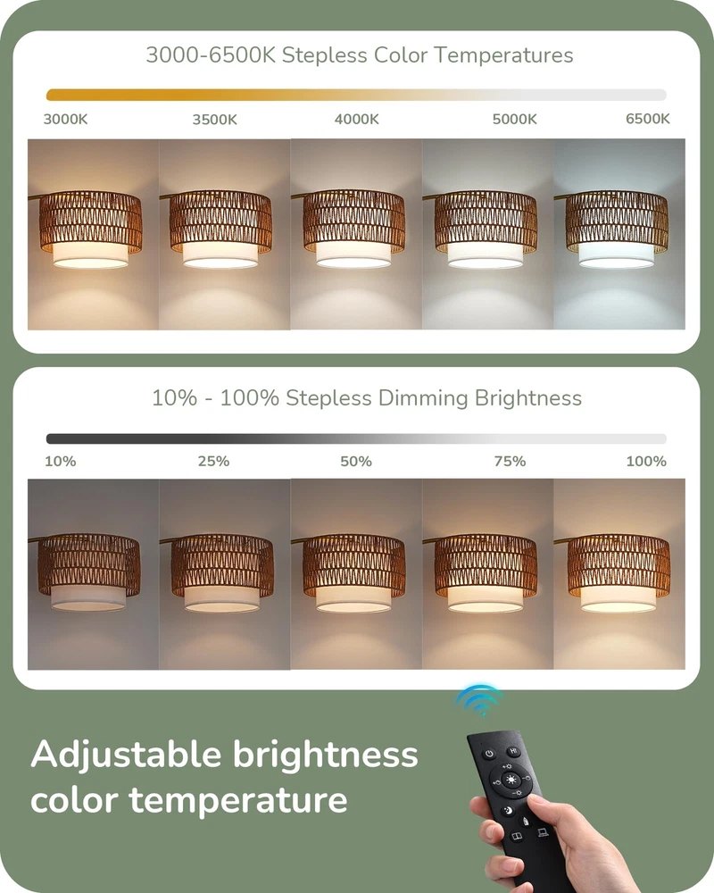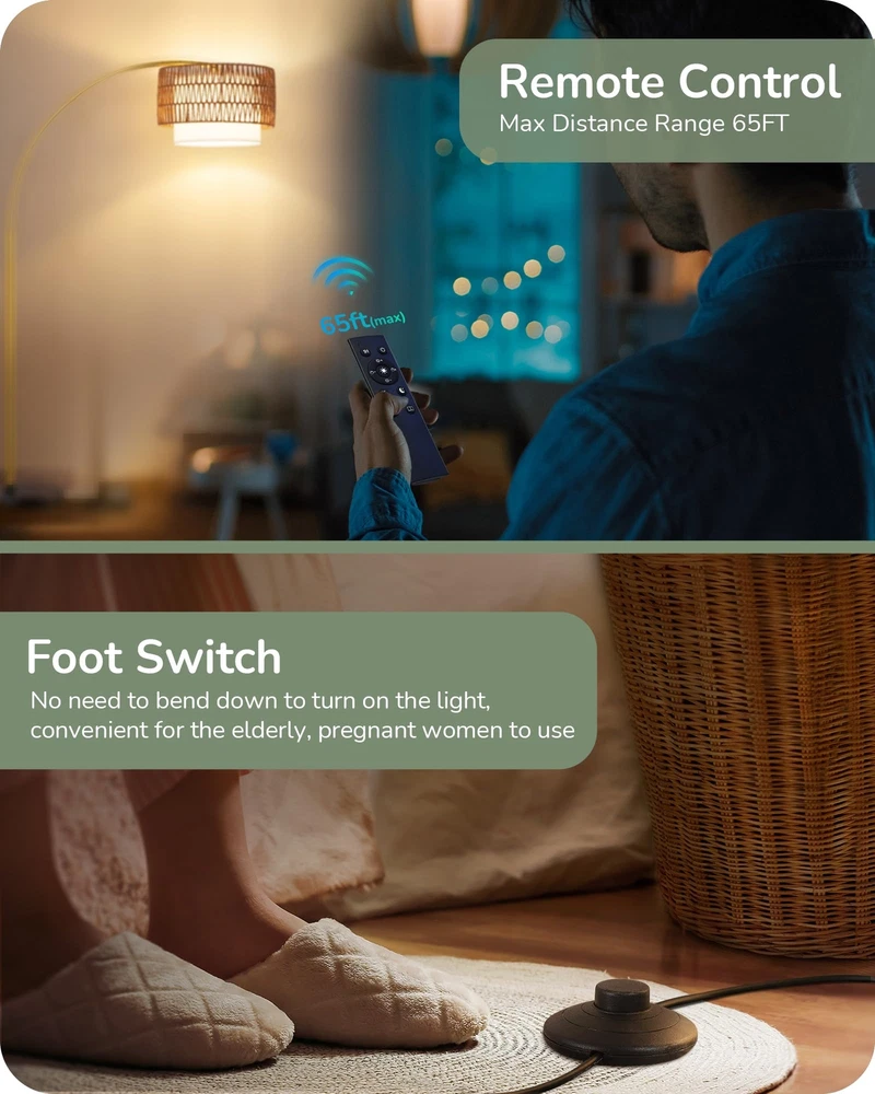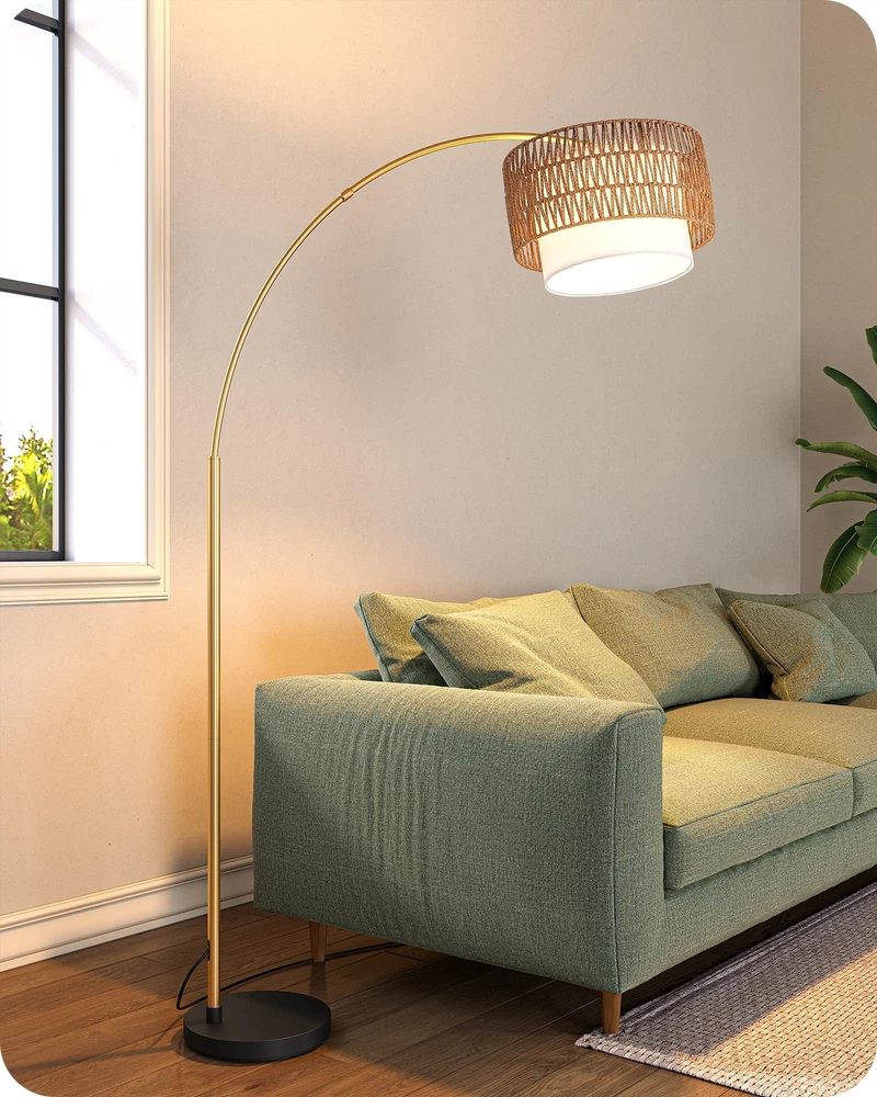 Arc Floor Lamp, Tall Reading Light with Adjustable Linen Fabric Hanging Shade, Golden Metal Pole, E26 Socket, 78" Standing Lamp for Living Room, Reading Room, Dining Room [Sturdy Base & Safety] Adopted with 11.8 inches diameter metal material and weighted base, this arc floor lamp is safe and stable, preventing it from tipping over, especially safe for kids and pets; the lamp's height and curvature are ideal choices whether it is placed next to the sofa or the dining table [65FT Remote Control & Foot Switch] The dimmable floor lamp adopts a 65ft remote control, with foot switch; no need to bend down to turn on/off the light, suitable for the elderly and pregnant women; perfect for placing in a corner or behind a sofa; classic look lends an elegant touch to modern, mid-century and contemporary decor [Adjustable Hanging Lampshade] 320° horizontally and 180° vertically rotated lampshade, allows you to adjust brass floor lamp and achieve targeted directional lighting; linen shade provides gentle light without hurting your eyes, creating a warm and cozy environment for living room, bedroom, study, dining table, sofa and other spaces [Dimmable & Stepless Bulb] 12W energy-saving bulb brings comfortable and adjustable light to this tall lamp, 5 levels of dimming: 3000K/3500K/4000K/5000K/6500K, 5 levels of brightness: 10%-25%-50%-75%-100 %, to meet a variety of scenarios, such as reading, feeding, working and night lighting; the memory function can help you remember the last setting [Easy to Assemble & Warranty] Assembly is a breeze in a few minutes, just twist the poles together then insert them in the base and attach the lampshade, finally tap the foot switch to easily control the boho floor lamp on and off