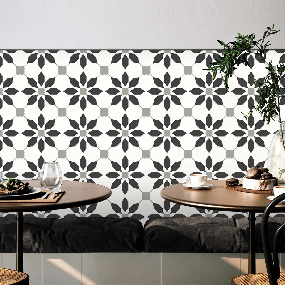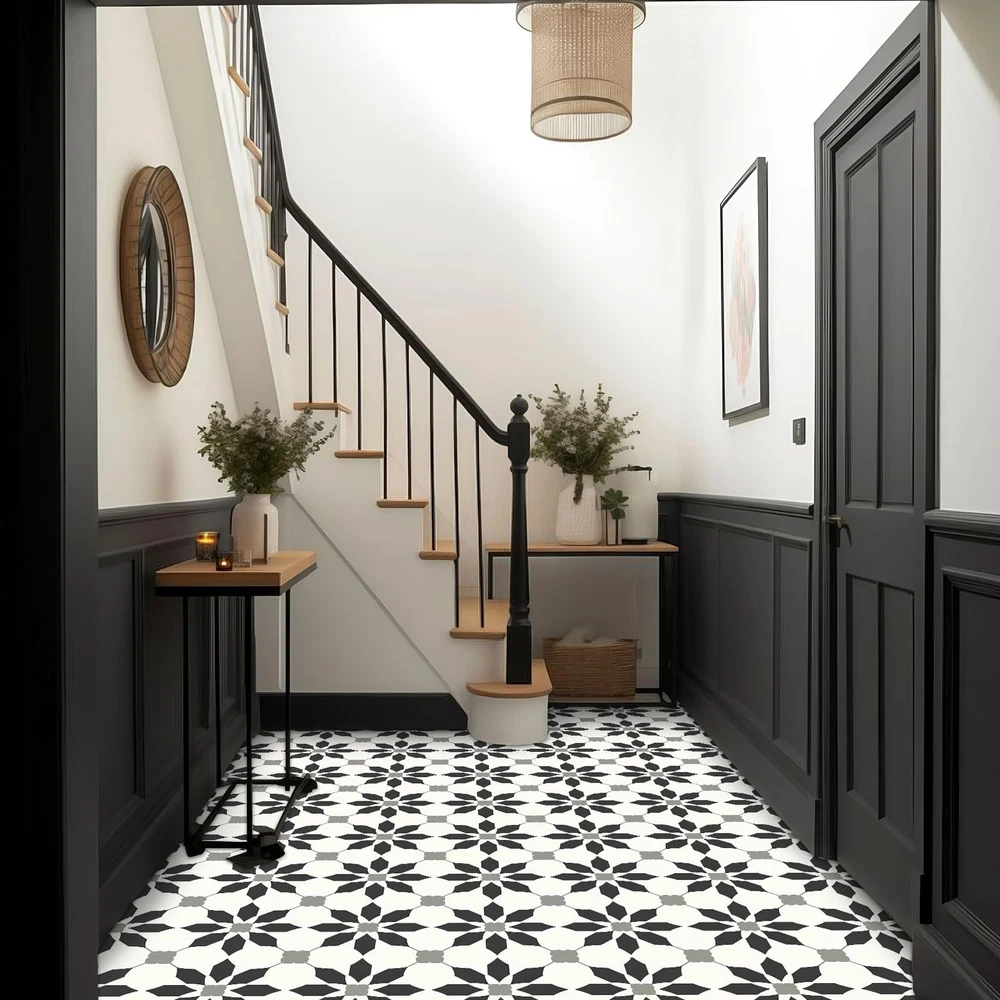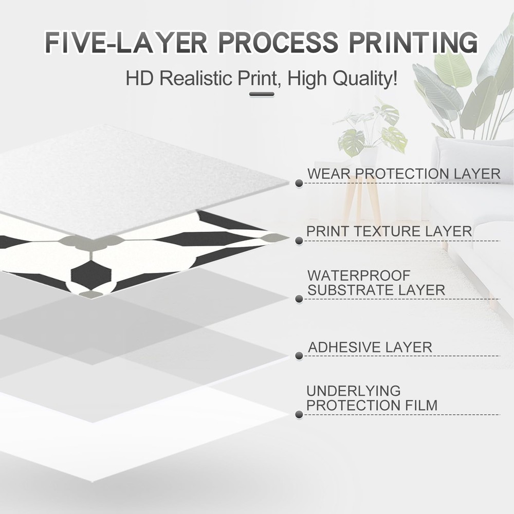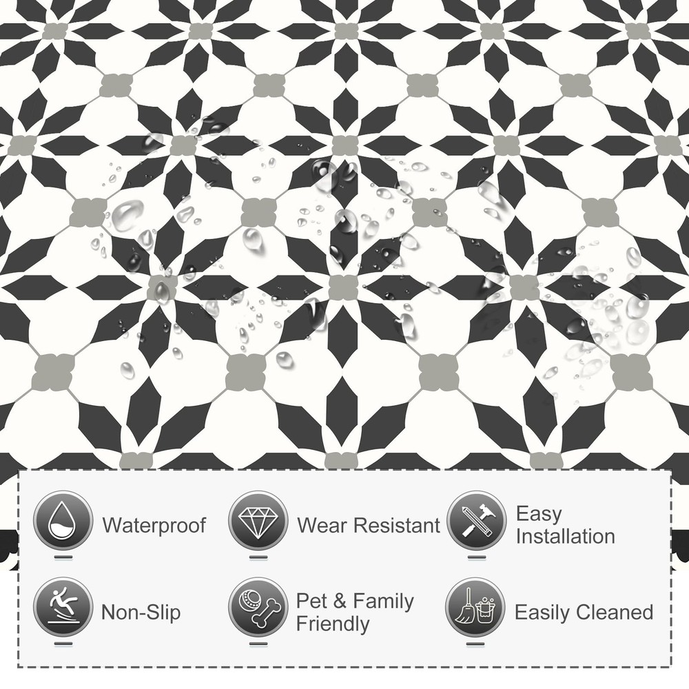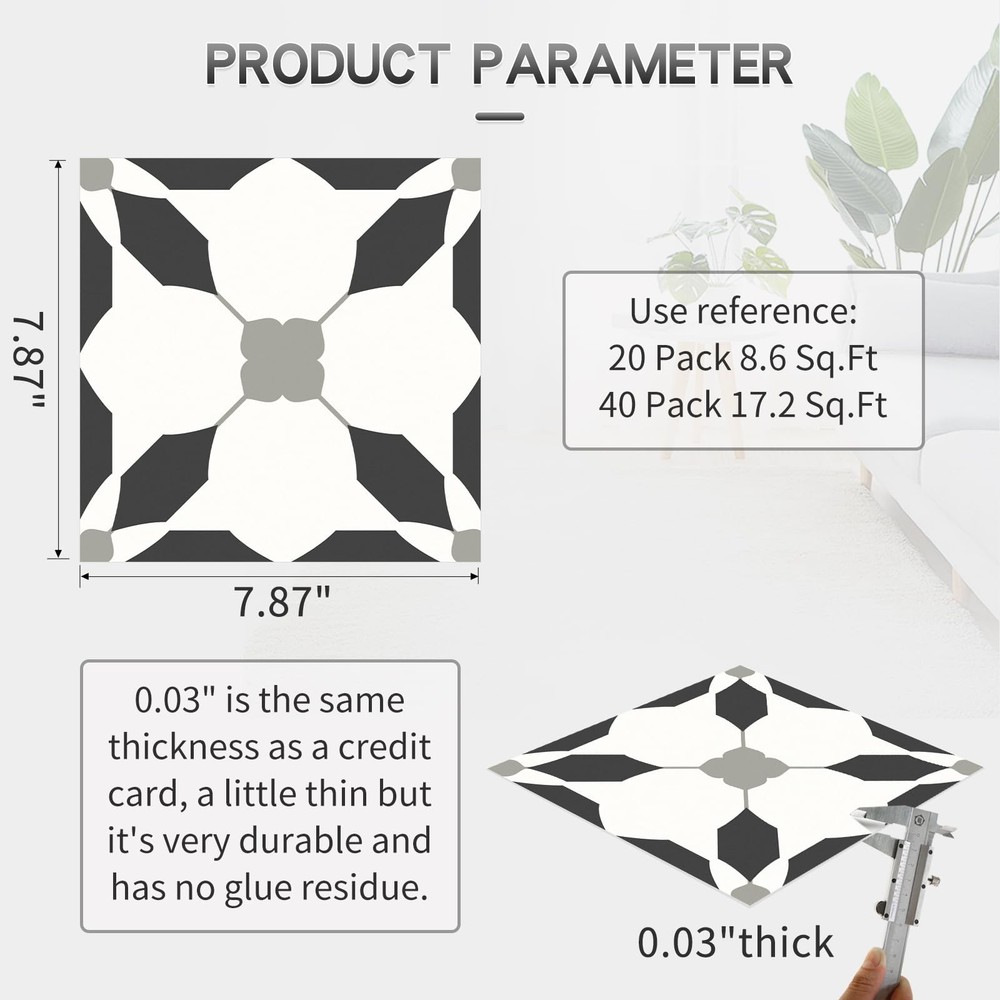 Materials: Floor tiles peel and stick waterproof Thickness: 0.8 mm/0.03 in Size of each piece: 7.87 x 7.87 in Package: Each pack contains 20 vinyl floor tiles that can cover 8.6 square feet. Superior features: Quick installation, easy to clean and maintain, strong adhesion and durability, high-quality, removable, non-slip, waterproof, scratch resistant. Why choose peel-and-stick floor tile? Floor tile offers a quick fix for modernizing old styles, managing tough-to-clean surfaces, and revitalizing worn-out appearances. Additionally, it can help extend the lifespan of your flooring by preventing scratches and damage, making it easy and cost-effective to create a warm and inviting space. Where is it applicable? You can easily apply peel-and-stick vinyl flooring to any smooth, flat, dry, and clean surface, including marble, wood, ceramic, terrazzo, smooth-surfaced epoxy panels, porcelain tiles, and more. How to install it? Step 1: Please clean the area you want to paste before pasting, ensuring no dust or water stains. Step 2: After accurate measurement, use tools to cut it down. Step 3: Tear off the adhesive and stick it onto the original floor. Step 4: Please pay attention to the alignment of the pattern and lines when sticking. Suitable for multiple scenarios: You can stick the peel-and-stick vinyl floor tile anywhere in your house, such as the bathroom, bedroom, kitchen, living room, children's room, laundry room, balcony, corridor, garage, basement, hallway, entryway, RV, and so on. Is it friendly to renters? This temporary flooring for renters is perfect for you to do the installation alone, without the need to use additional glue and without residue after removal! Superior Property: Peel and stick floor tiles, crafted from wear-resistant material, are waterproof, moisture-proof, and easy to clean, leaving no sticky residue and protecting your flooring Efficient Installation: Peel and stick, and use scissors or a utility knife along with precise measurements to give your home a fresh look effortlessly User-Friendly Self-Adhesive Solution: Ideal for renters or DIY enthusiasts, peel-and-stick floor tile minimizes wrinkles and bubbles for convenience and durability Versatile Application: Suitable for floors, ceramic tiles, walls, and other smooth surfaces, peel-and-stick flooring provides a desirable alternative to laminate flooring or linoleum flooring Ingenious Design: Combining classic black and white shades with timeless pattern motifs creates a sophisticated and elegant aesthetic, ideal for a range of spaces such as bathrooms, kitchens, bedrooms, living rooms, hallways, entryways, basements, garages, RVs and shops Image and Actual Size: The first image consists of a combination of 4-floor tiles Packaging Details: Measuring 7.87 x 7.87 inches (20 x 20 cm) with a sleek 0.8 mm thickness, each pack contains 20 vinyl flooring that can cover 8.6 square feet