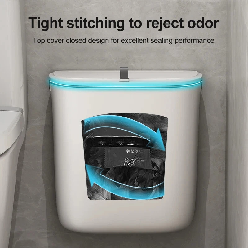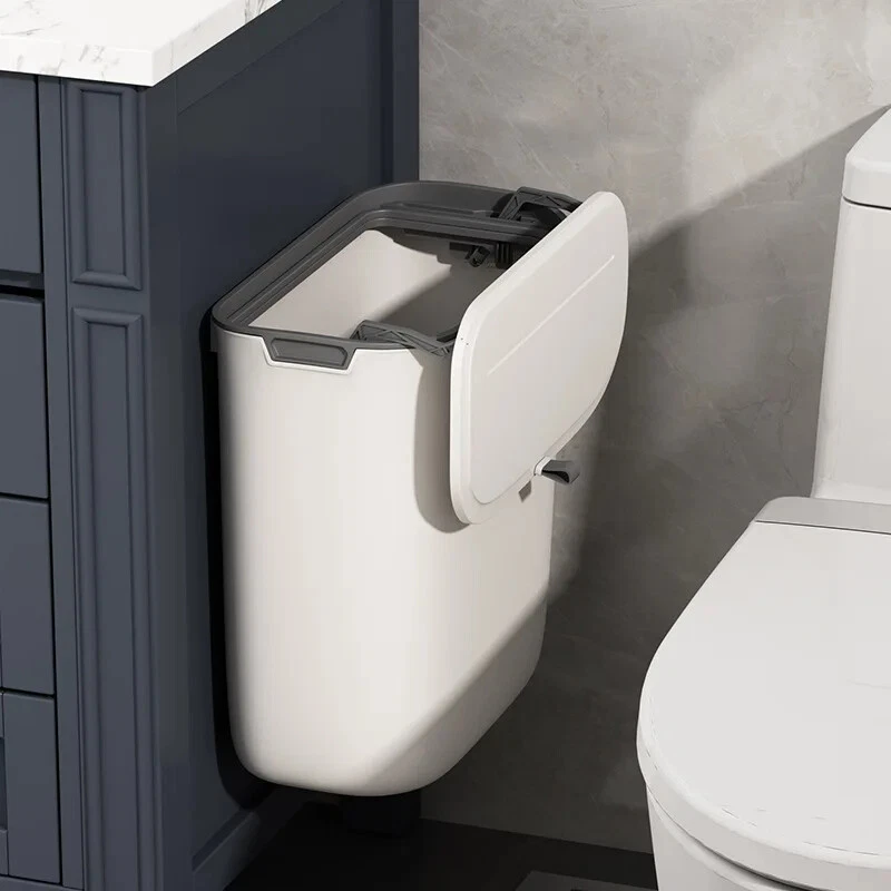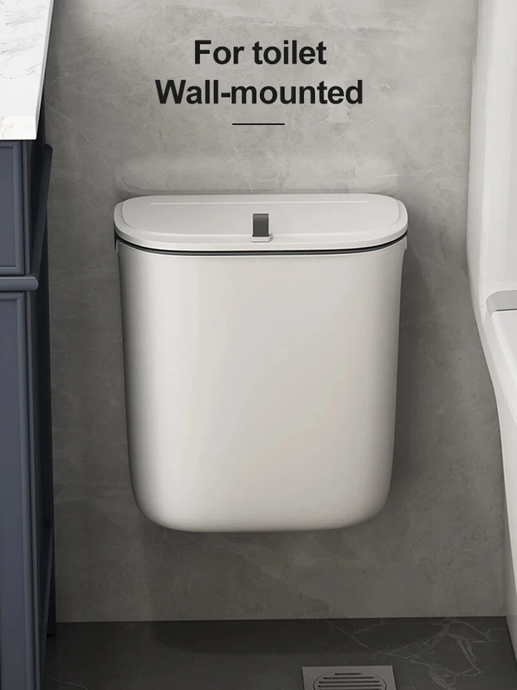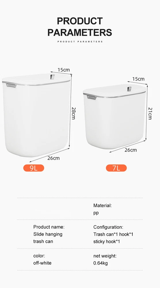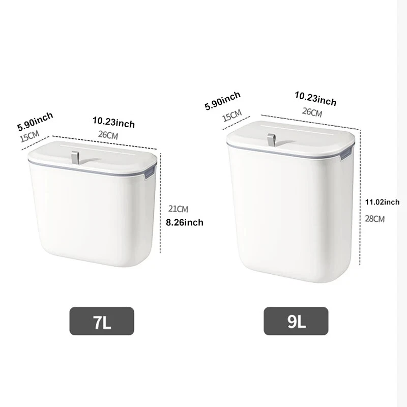 S ize : 7L 26*15*22CM( 10.23*5.9*8.26inch ) 9L 26*15*28CM( 10.23*5.9*11.02inch ) Bathroom Kitchen wall-mounted trash can : accessory ( 1 hook, 1 pasting board )Small and perfect fit for most cabinet doors, pantry doors, cupboard; The thickness of the door should be less than 0.95 inch( 2.5cm ).or it can be directly attached to the wall. Specifications :7L or 9L Color : white Material : PP Practical & Creative Designs : 【Ideal for Kitchen Cooking】: Convenient for throwing cooking garbage, kitchen floor space saver, and stop the odors. 【Ideal for Bathroom】: Convenient for throw away waste paper towels,and stop the odors. 【 Open Methods】: slide type design Scenes : 1. For Kitchen or For Bathroom or For Office or For Bedroom Packing list 1 x trash can bin
