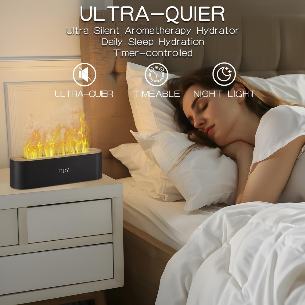 Introducing the Flame Aromatherapy Humidifier, your ultimate solution for a serene and fragrant living space. This 7-color variable essential oil diffuser is designed to transform your home, hotel, or office into a sanctuary of relaxation. With ultra-silent operation, it ensures a peaceful environment without any disruptive noise. The built-in timer and no water auto shut-off feature provide convenience and safety, making it perfect for use in any room. The 150ml capacity is ideal for maintaining optimal humidity levels, making it one of the best small humidifiers for the bedroom. Use it as an essential oils diffuser for home to enjoy the therapeutic benefits of cedarwood essential oil or any other favorite scent. Whether you're looking for a mini diffuser for essential oils, a home diffuser, or a humidifier with essential oil diffuser, this product caters to all your needs. It's a versatile essential oil diffuser large room can benefit from, ensuring a consistent fragrance throughout. Ideal for diffusers for essential oils large room, this humidifier offers a perfect blend of functionality and aesthetics. Elevate your space with the Flame Aromatherapy Humidifier and experience the difference. UPGRADED VERSION: SEVEN-COLOR FLAME HUMIDIFIER. This diffuser offers seven LED colors, with options for a fixed or cycling display. A cleaning brush is included for convenience. ULTRASONIC TECHNOLOGY: This aromatherapy diffuser uses high-frequency vibrations to atomize water, humidify air, and diffuse essential oils for maximum therapeutic effect. TIMING AND MUTING: The air humidifier offers three timing modes (1, 3, or 5 hours) and a 150 ml capacity, with a noise reduction feature for peaceful sleep. SAFETY:The flame diffuser is made of high-grade polypropylene (PP), making it lightweight, impact-resistant, and easy to clean. It includes a safety system that automatically cuts off power when water is absent. EXQUISITE GIFTS: This humidifier with essential oil diffuser boasts an elegant design with a frosted texture that enhances any space. It serves as a high-end essential oil diffuser for homes, offices, spas, and gyms, making it a perfect gift.