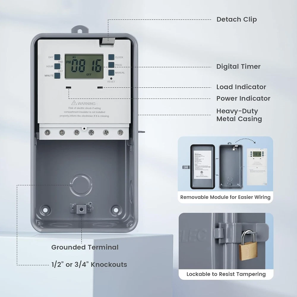 Pool Timer, 7-Day 24-Hour Digital Pool Pump Timer, 40 AMP Heavy Duty, 120/240/277 VAC, Outdoor Metal Casing, Electric Timer Switch Box for Swimming Pool Pump, Hot Water Heater, Spa, Lights Heavy Duty 40 AMP Digital Pool Timer: 1HP 120V, 2HP 240V; Supports 120 to 277 VAC; Handles 40A resistive loads; Ideal for controlling pool filter pumps, water heaters, and patio lighting; ETL Listed; Conforms to UL Versatile Timer Function: Offers 7 ON/OFF program settings; Includes 15-day combinations, single-day 24-hour settings, Daylight Saving Time (DST) adjustment, and a Random function; Meets diverse scheduling needs for pool pump timers and water heater timers Built-in Battery Keeps Time and Settings: Features a rechargeable battery backup; Retains settings and current time for up to three s when fully charged; No need to reset the swimming pool timer after power outages Weatherproof Heavy Duty Metal Casing: Constructed with a sturdy metal casing; Resists abrasion, moisture, and direct sunlight; Lockable, raintight, and rust-proof metal box cover protects the pool timer from rain, snow, and dust, preventing tampering Easy to Install and Program: Simple setup and operation; Keeps pool pumps or other electrical devices on a regular schedule; Eliminates manual ON/OFF switching; Saves time, money, and hassle with this automatic outdoor digital pool timer